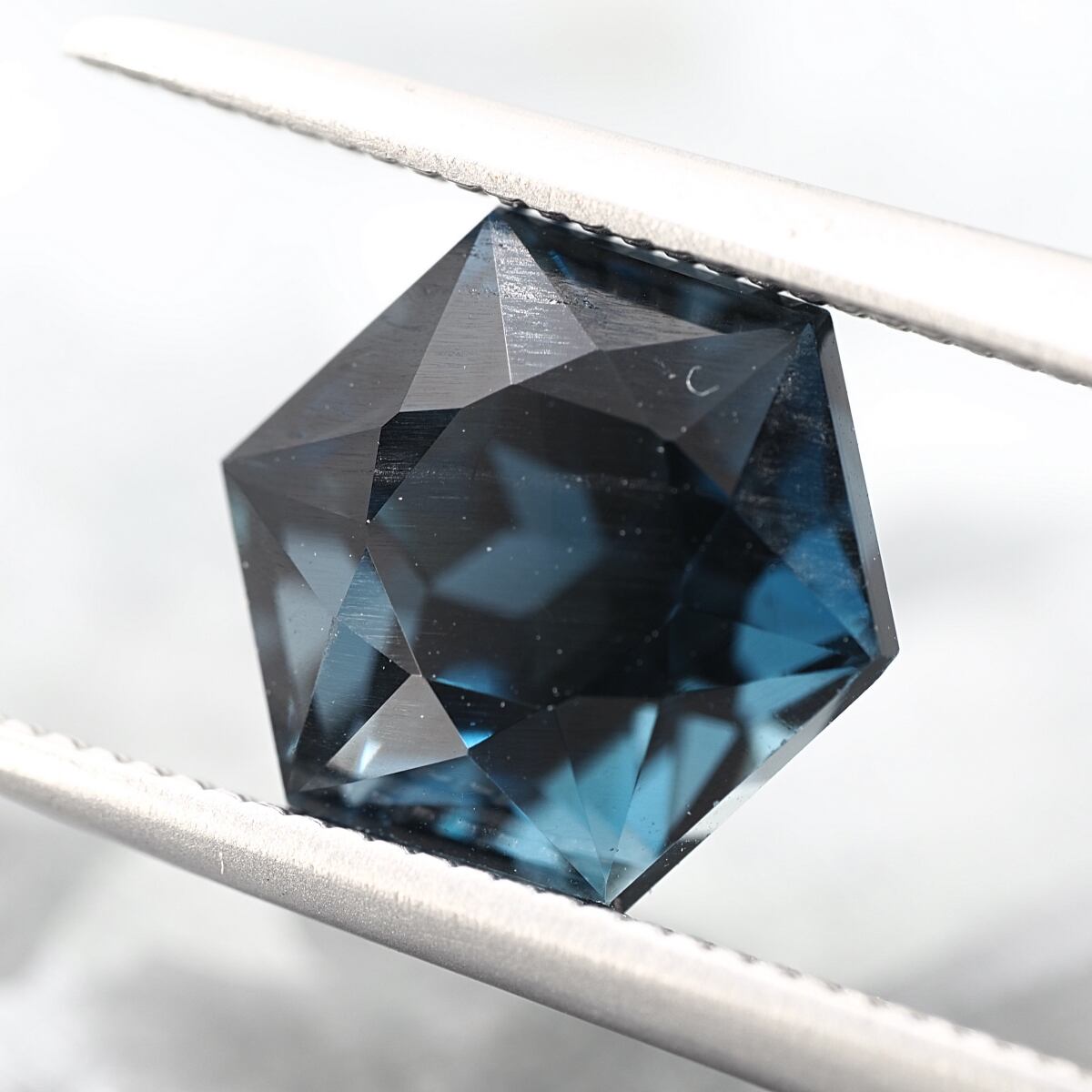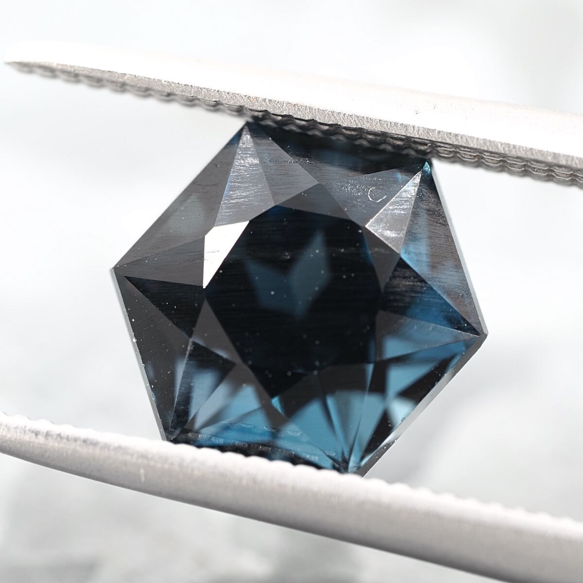 色良し、テリ良し、カット良しのロンドンブルートパーズです。深い海に太陽光が届いて煌めくような、そんな気品溢れる美しさを放っています。角度によって濃い箇所とのコントラストも素晴らしく綺麗です。多くの皆さんに人気のヘキサゴン形状!