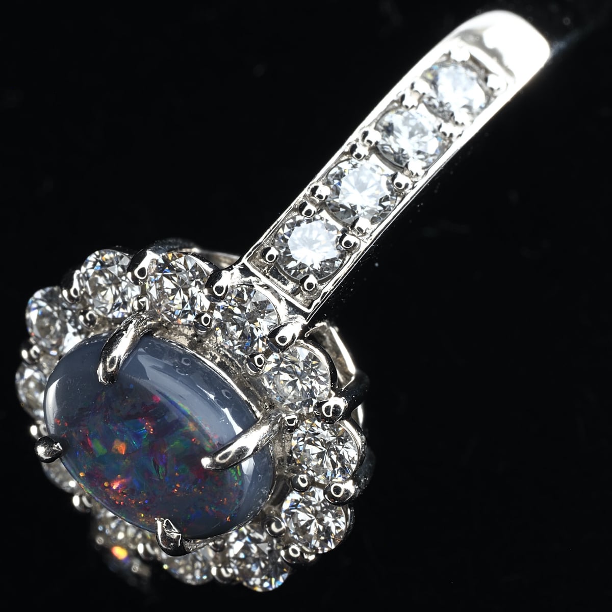 地色がおよそN5〜N6付近のセミブラックカラー。遊色は希少とされる赤を基調にした鮮やかな虹色の色合い。取り巻きと脇石に20pcsのダイヤモンドをセッティング。これらも非常に美しいです(一部蛍光反応有り)