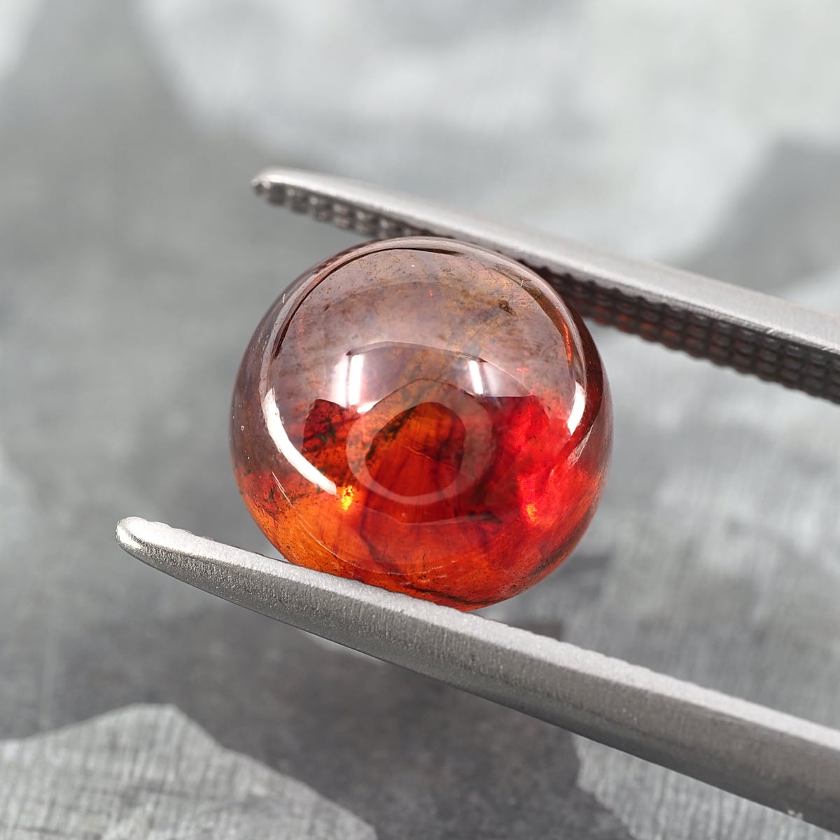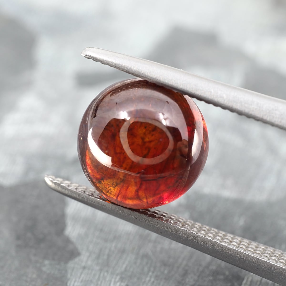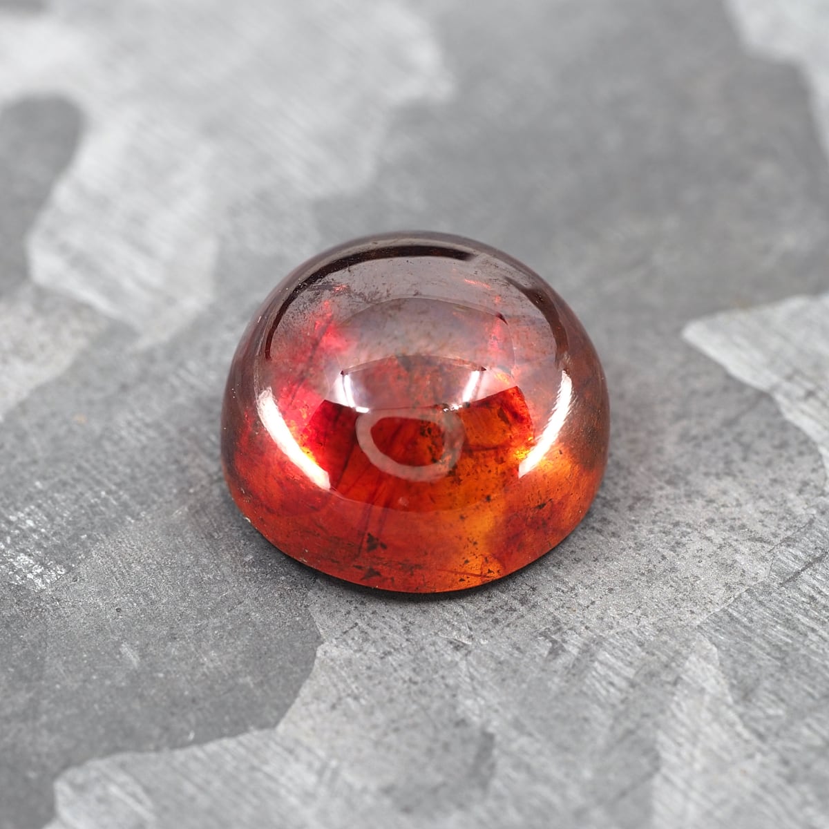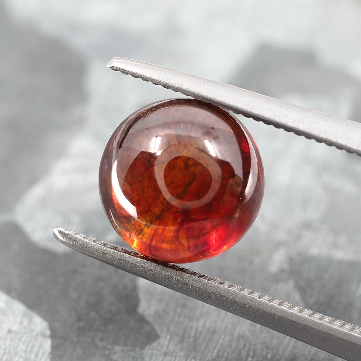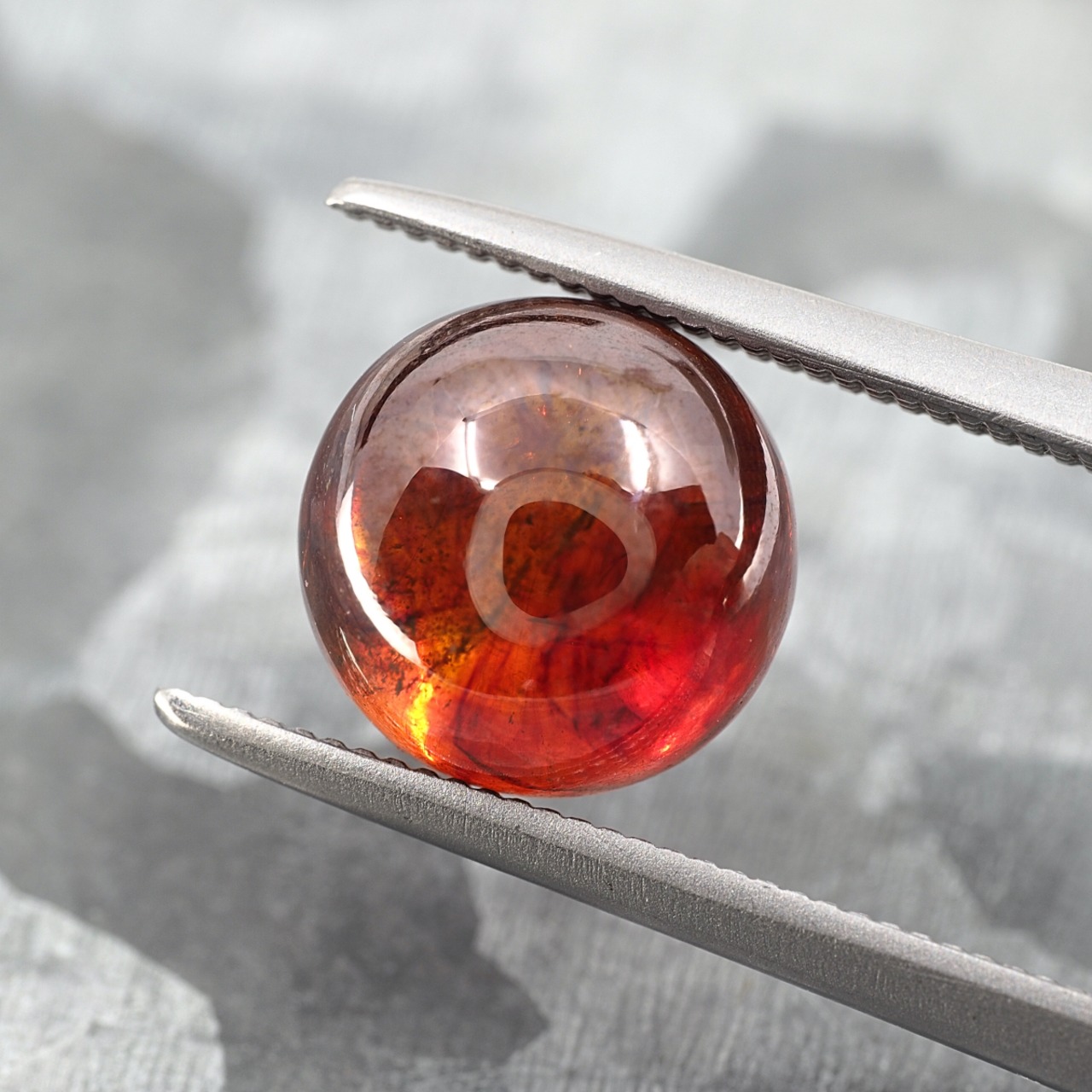 While the standard Spanish variety predominantly features orange to yellow hues, rare reddish shades like this one also exist. This particular specimen is generously sized, and its cabochon cut showcases a truly magnificent lustrous sheen!