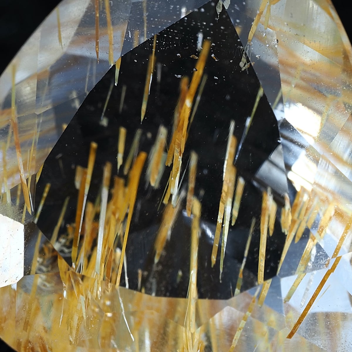 Commonly known as tube-in-topaz. Straw-like tubular inclusions containing limonite (brown iron oxide) are enclosed within white topaz. Compared to rutile topaz, the thickness of the inclusions themselves and their brownish hue are more noticeable.