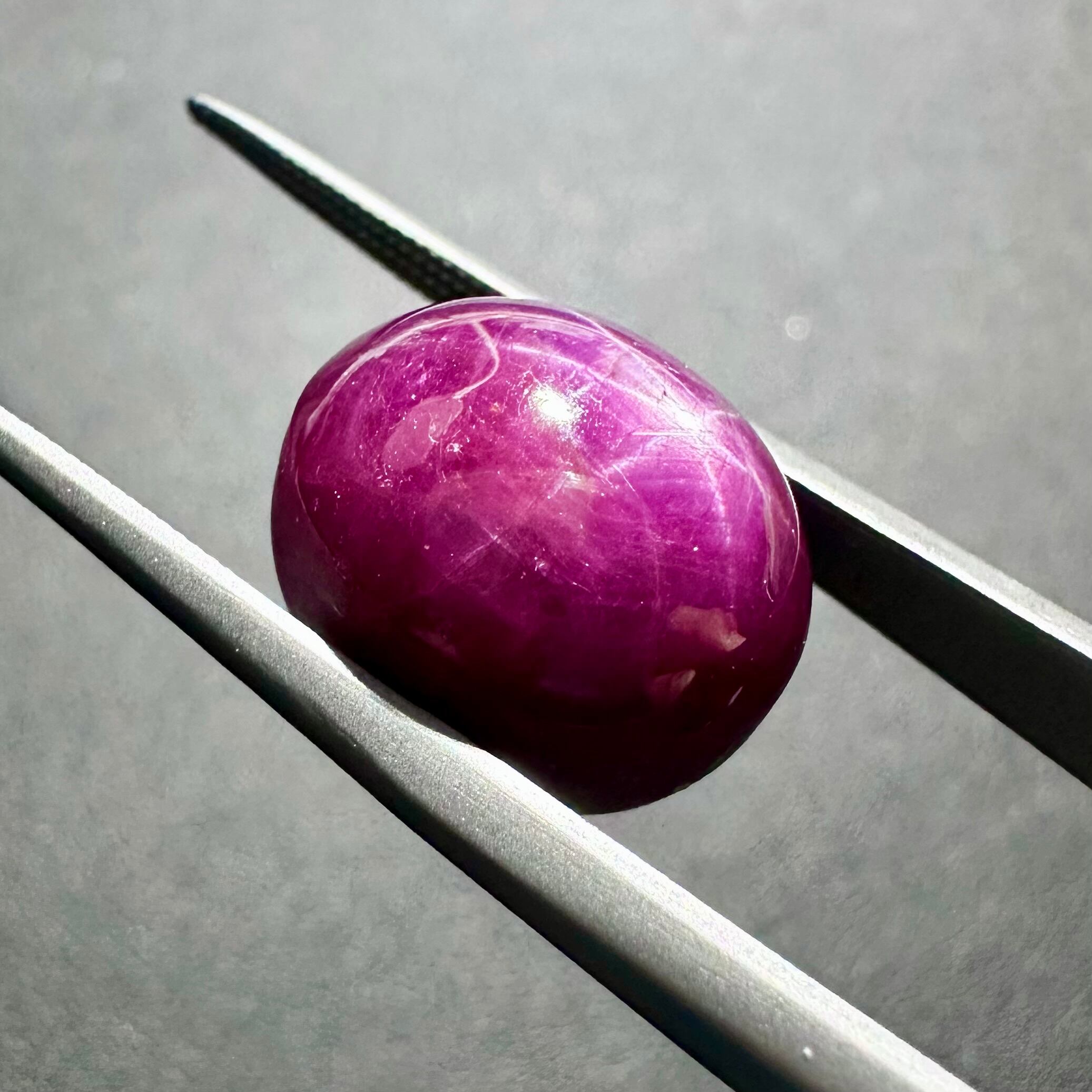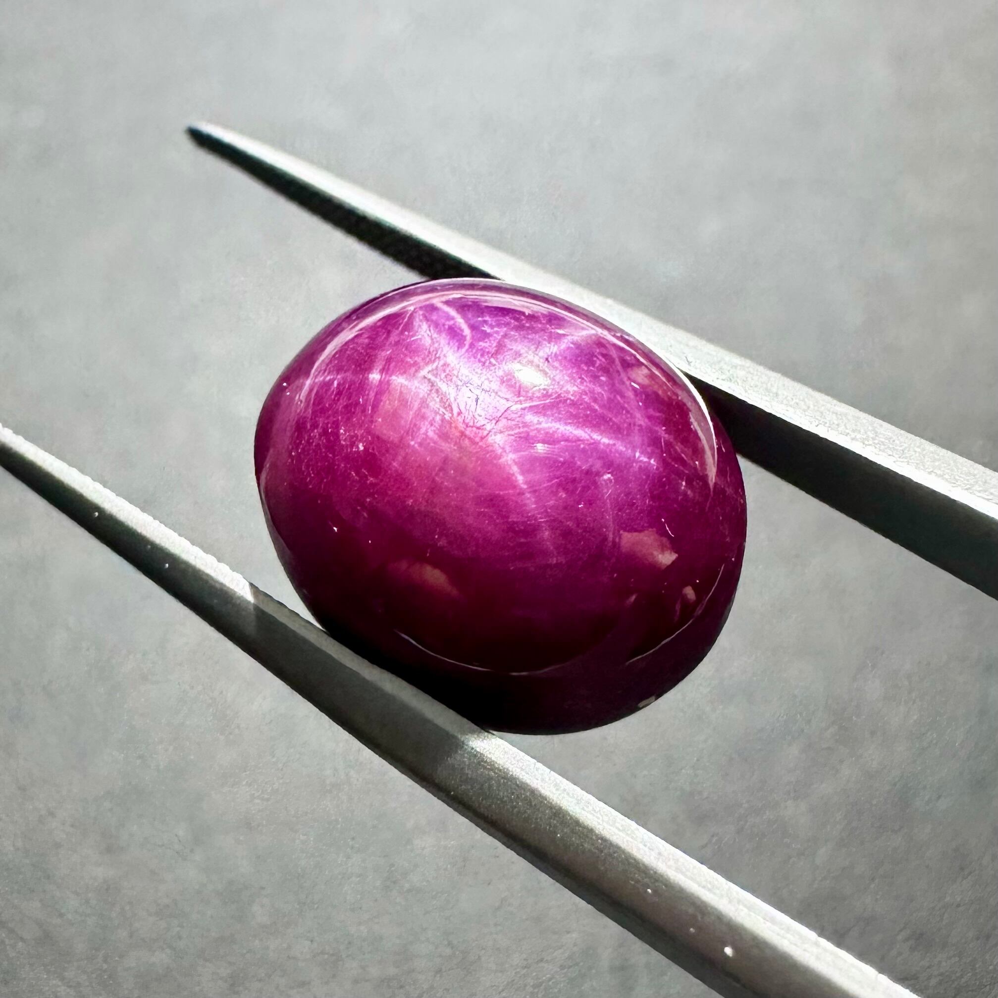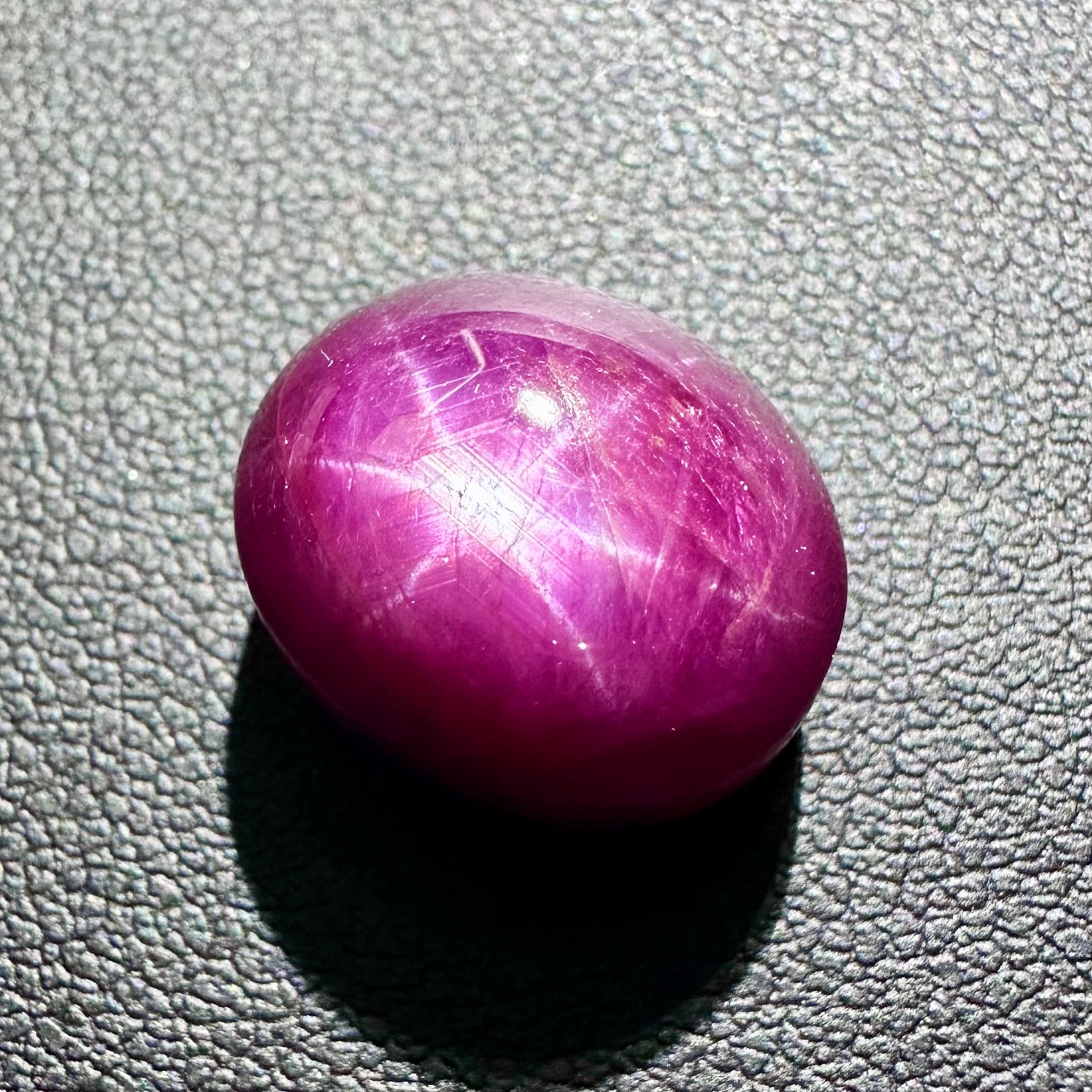 This is an oversized star sapphire. It's a bit hard to see, but it's a double star. At this size, the six rays of the asterism effect are notably longer. The secondary star appears faintly beside the main star. Furthermore, its fluorescence reaction is intense!