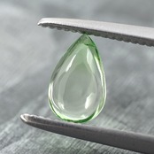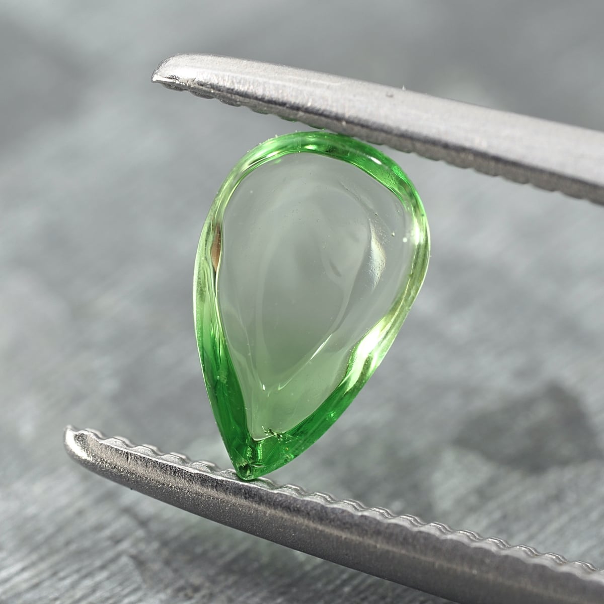 There are rare bicolor garnets often found in Kenya, but this one is from Tanzania and is a rare type of bicolor tsavorite. It's not clearly bicolor but rather a gradation, and the glossy cabochon is incredibly cute!