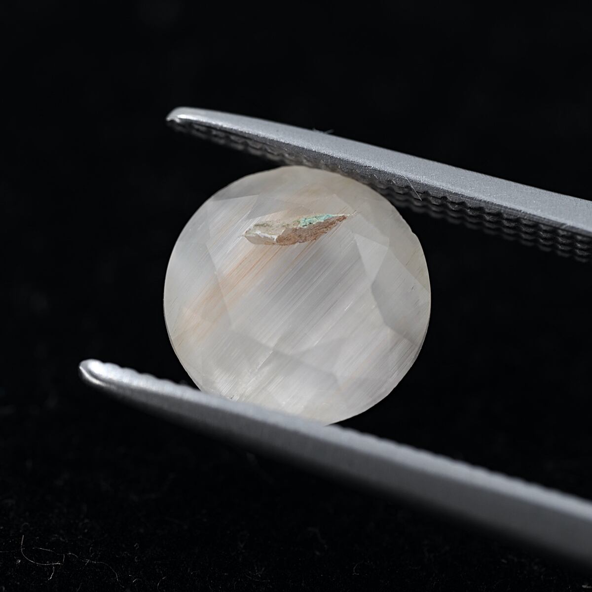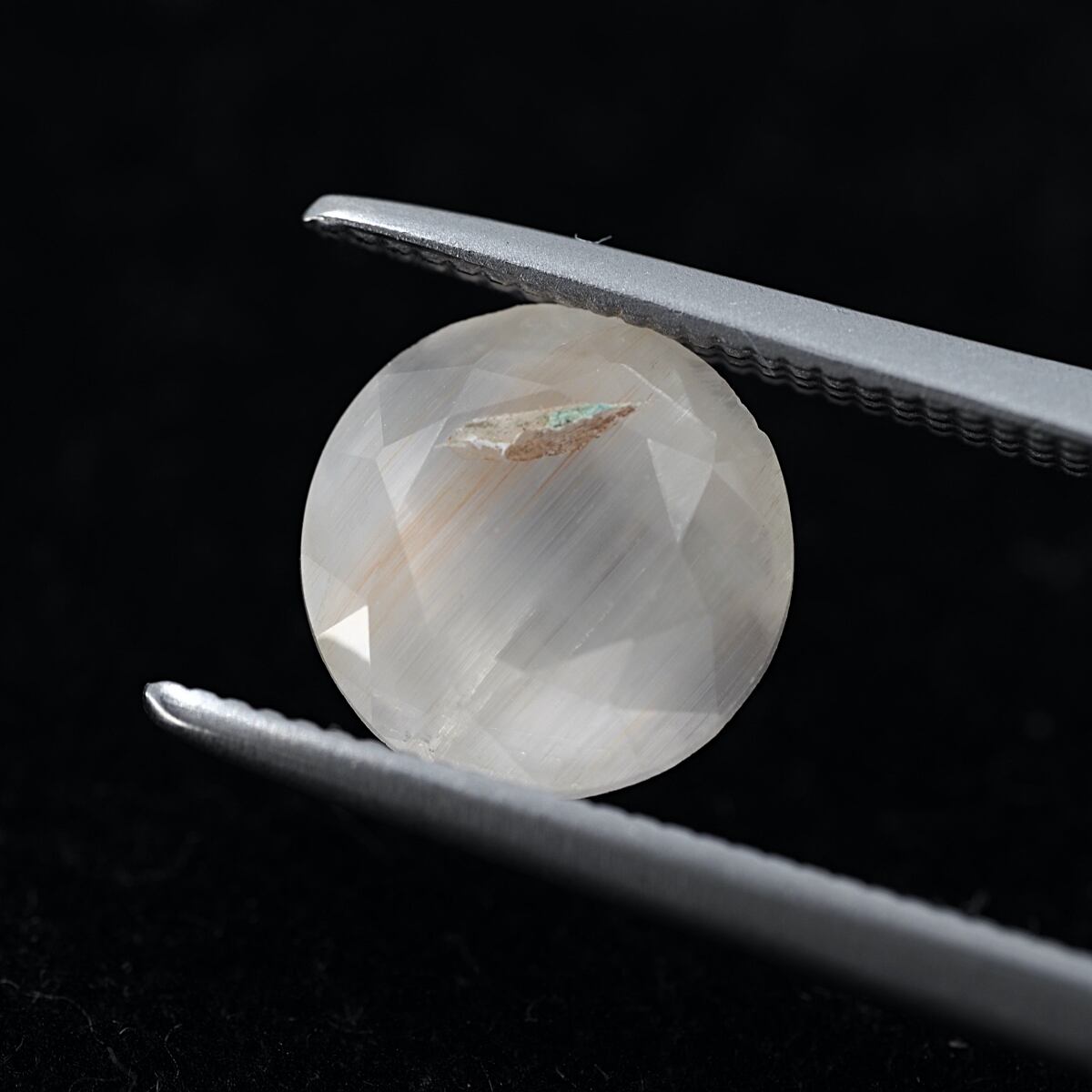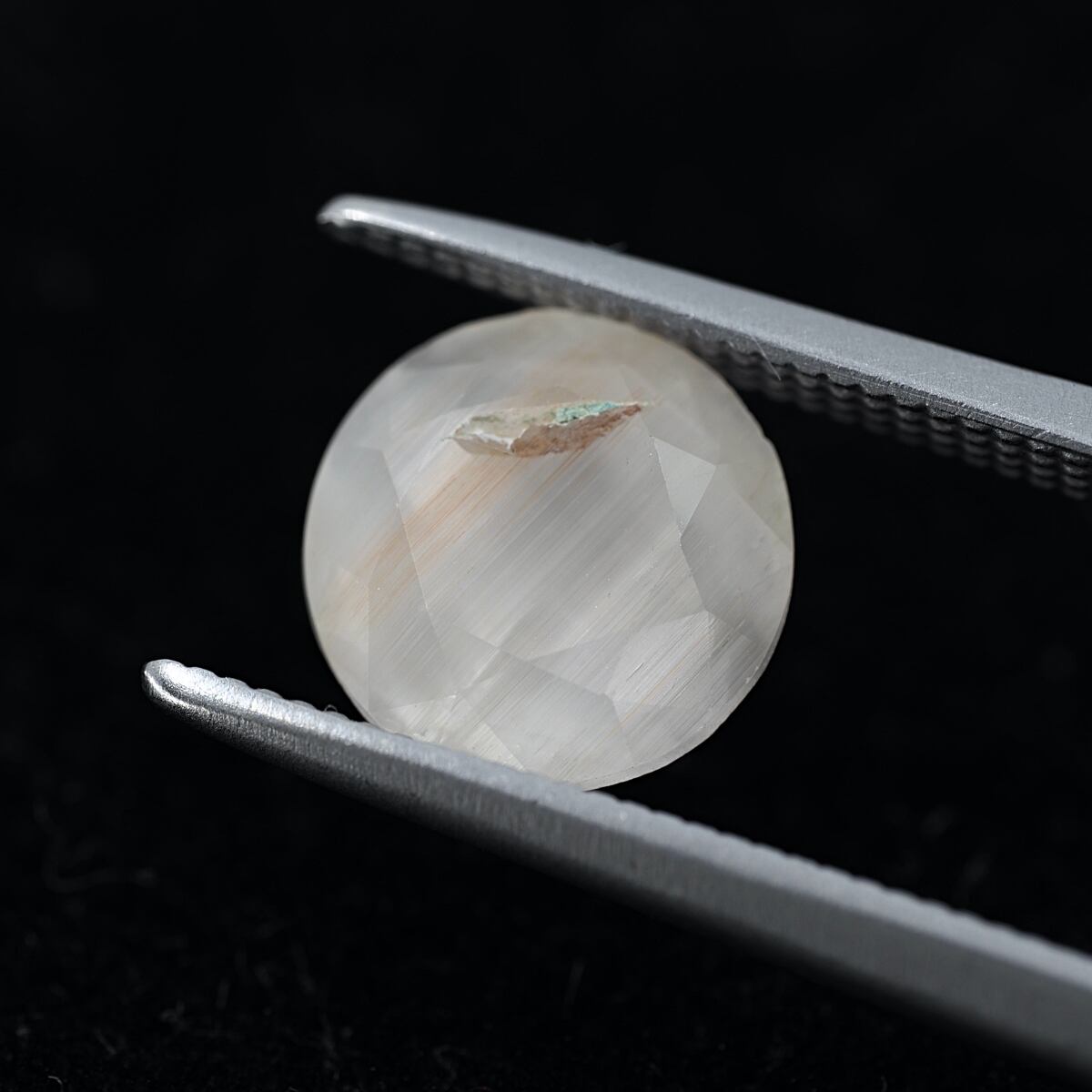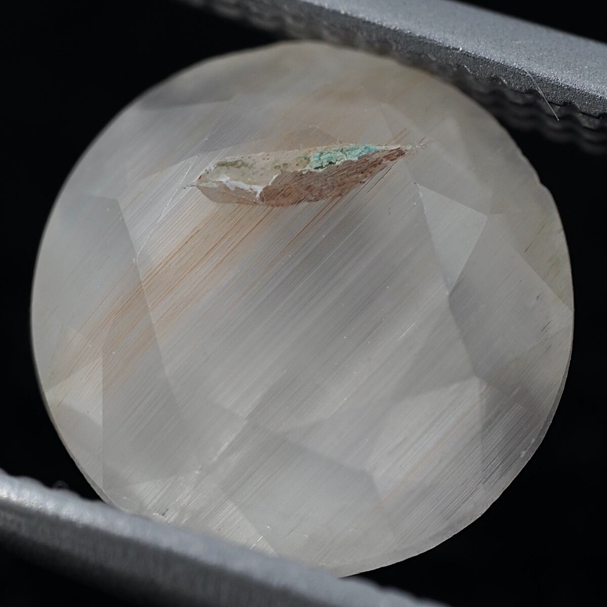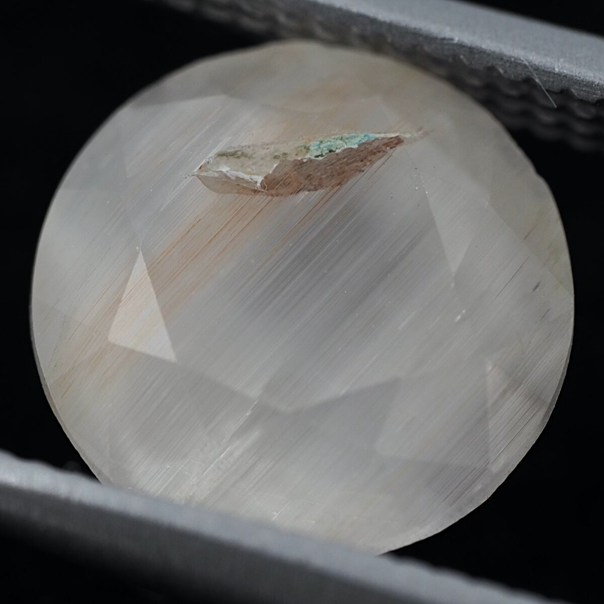 一箇所目立つインクルージョンこそありますが、シルキーにも見えるほど乳白色の針がびっしり内包されています。また、これによってキャッツアイ(シャトヤンシー)効果も垣間見える個性的な個体となっています。