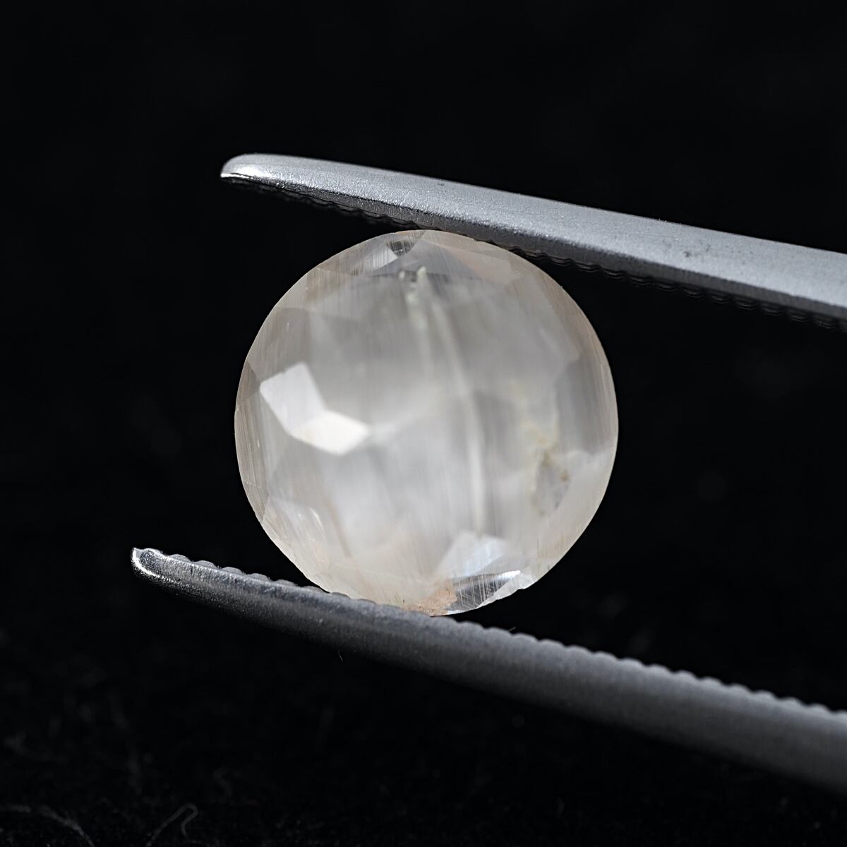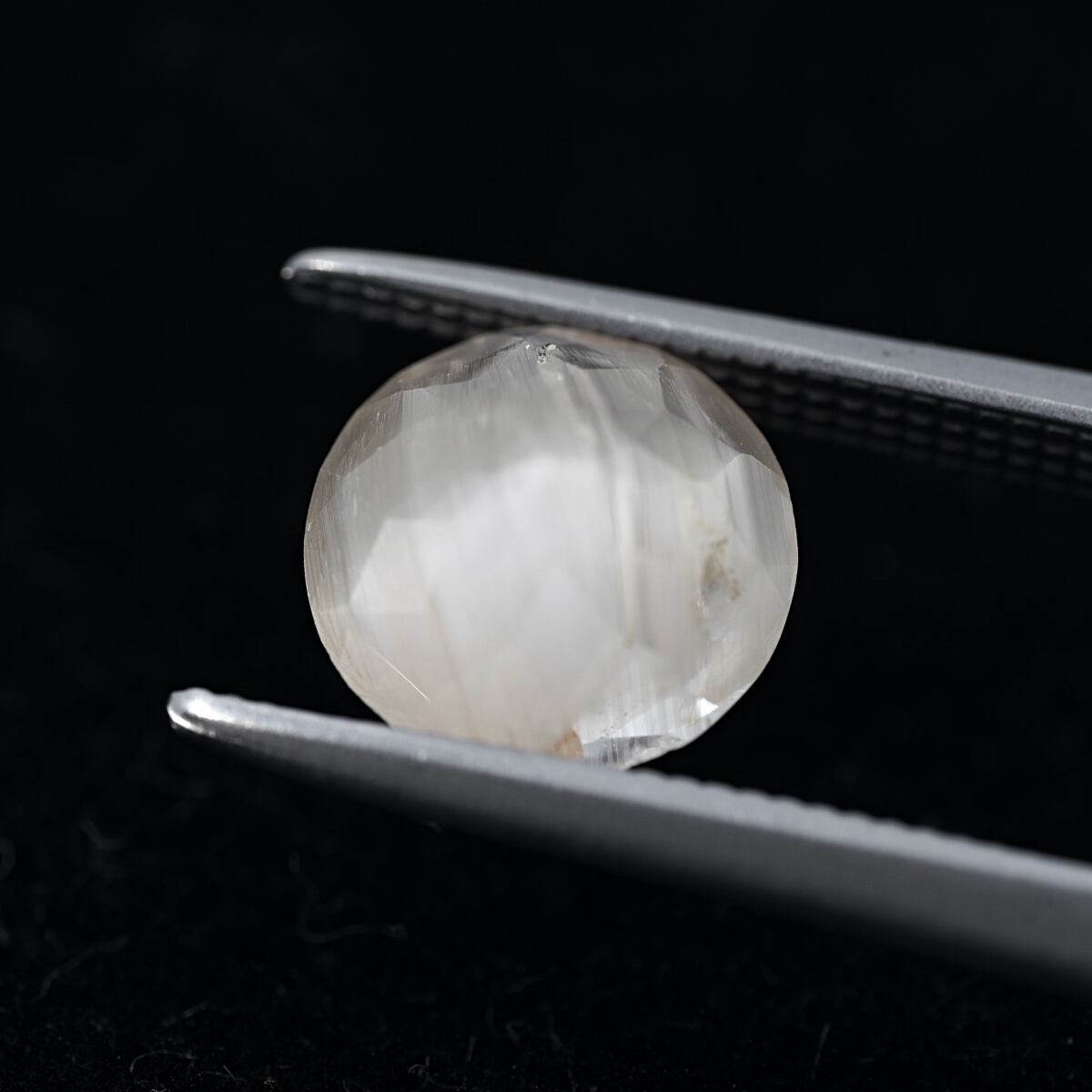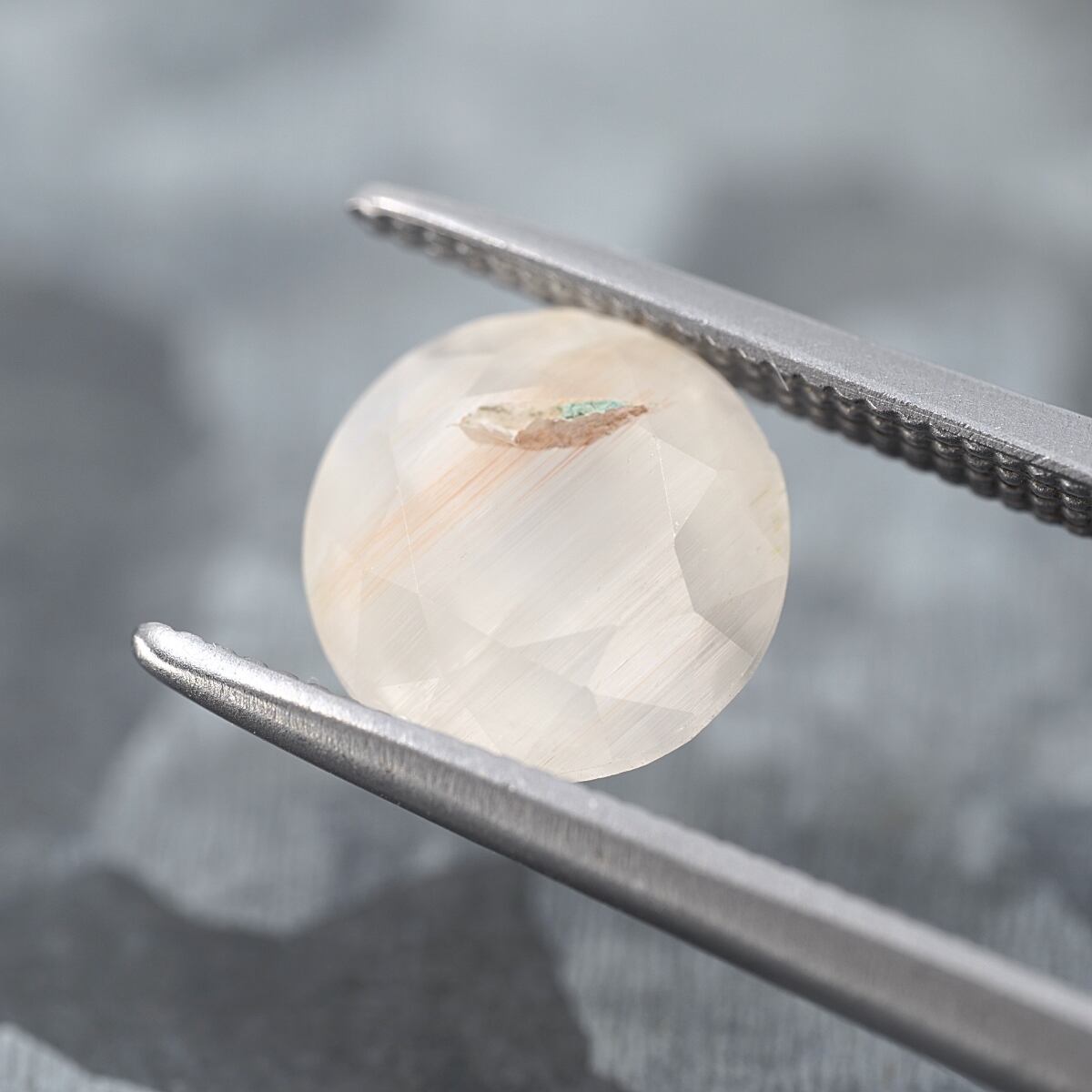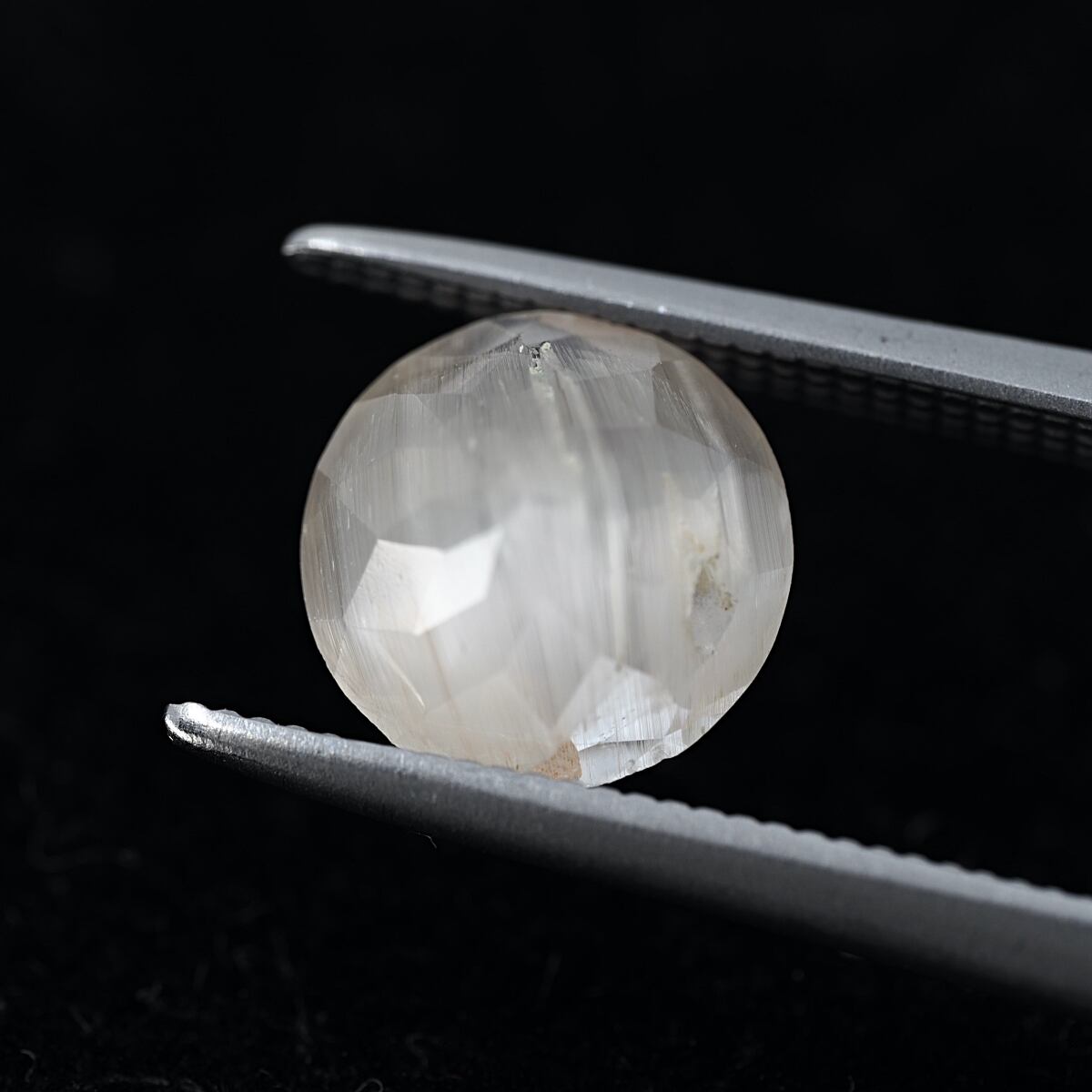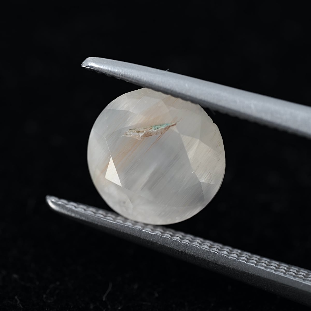 一箇所目立つインクルージョンこそありますが、シルキーにも見えるほど乳白色の針がびっしり内包されています。また、これによってキャッツアイ(シャトヤンシー)効果も垣間見える個性的な個体となっています。