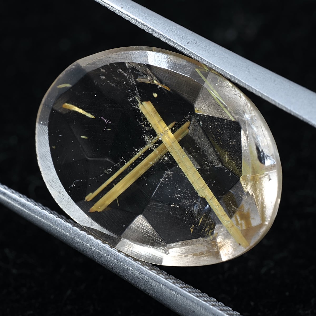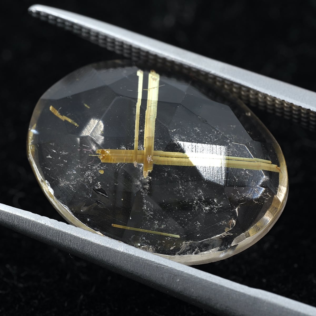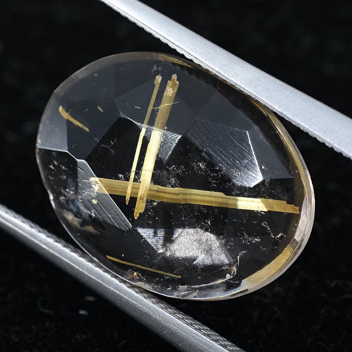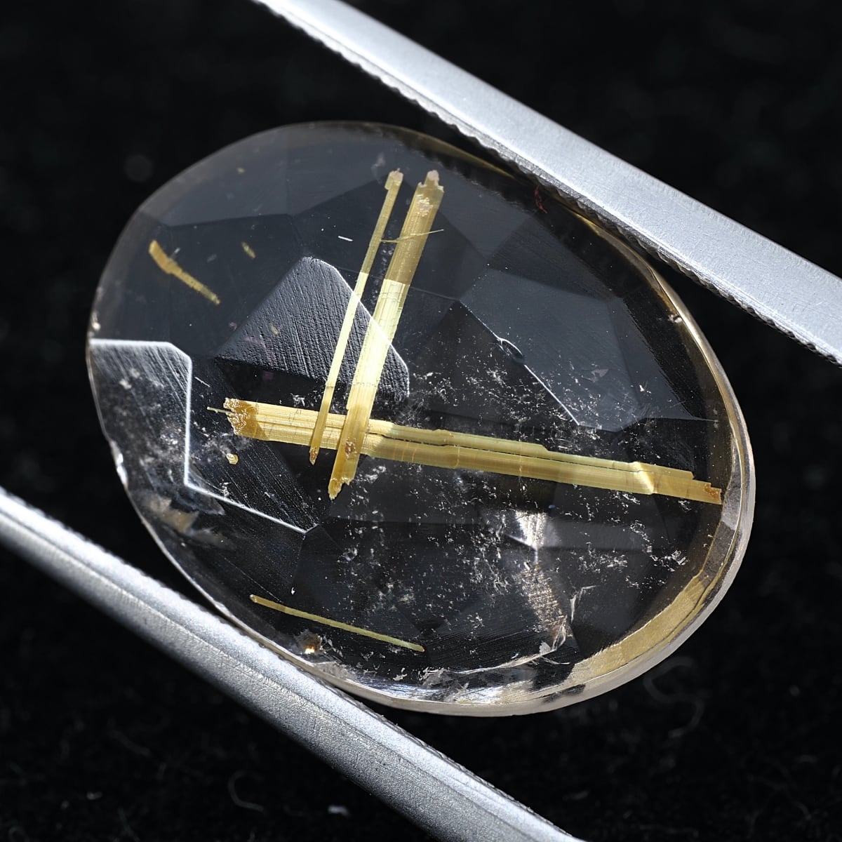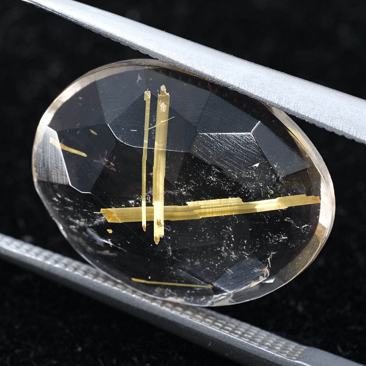 少し不揃いな表面ローズカットに裏面フラットバックを施した個体です。太めのゴールデンルチルが存在感すごくあります!