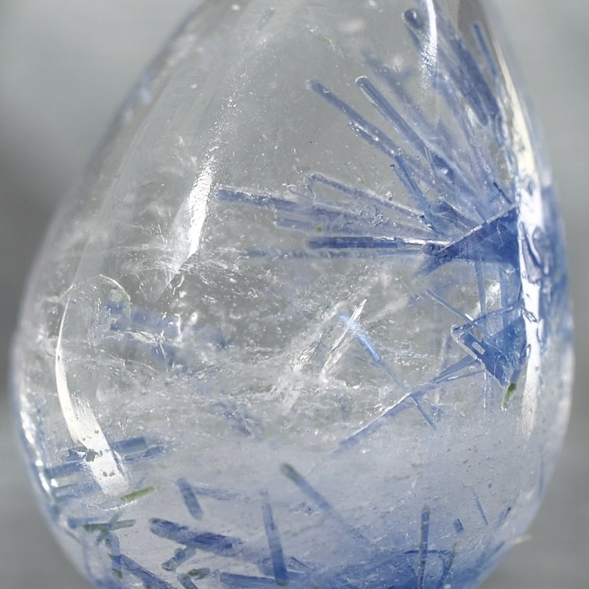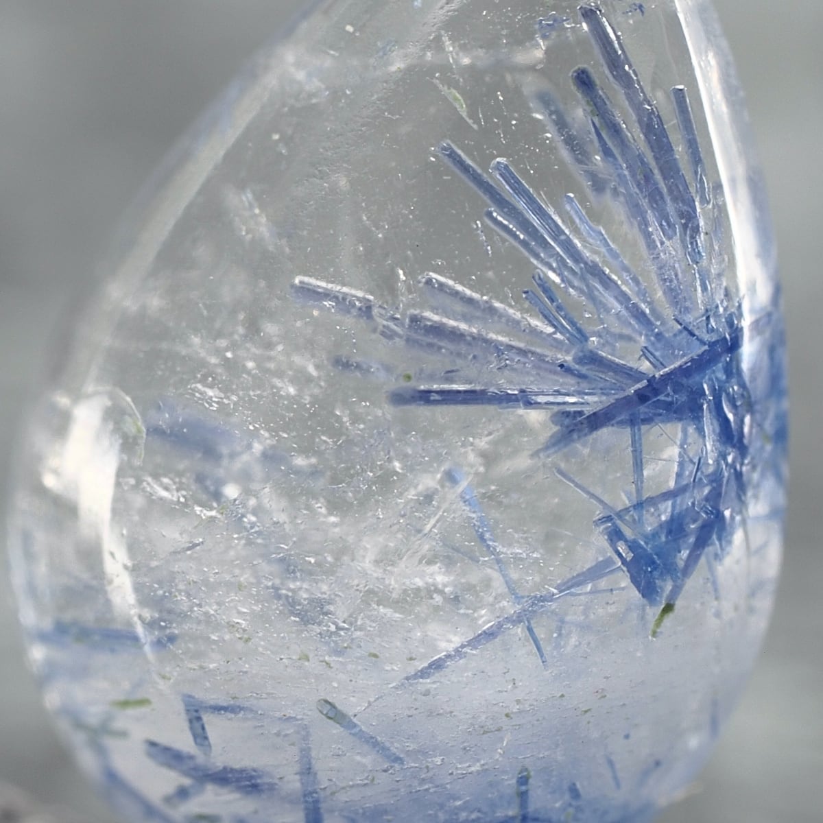 How delightful it is to examine them under a loupe! The combination of the bluish original crystals, the snow- or ice-like white inclusions, and the transparency of the host quartz creates a truly lovely atmosphere.
