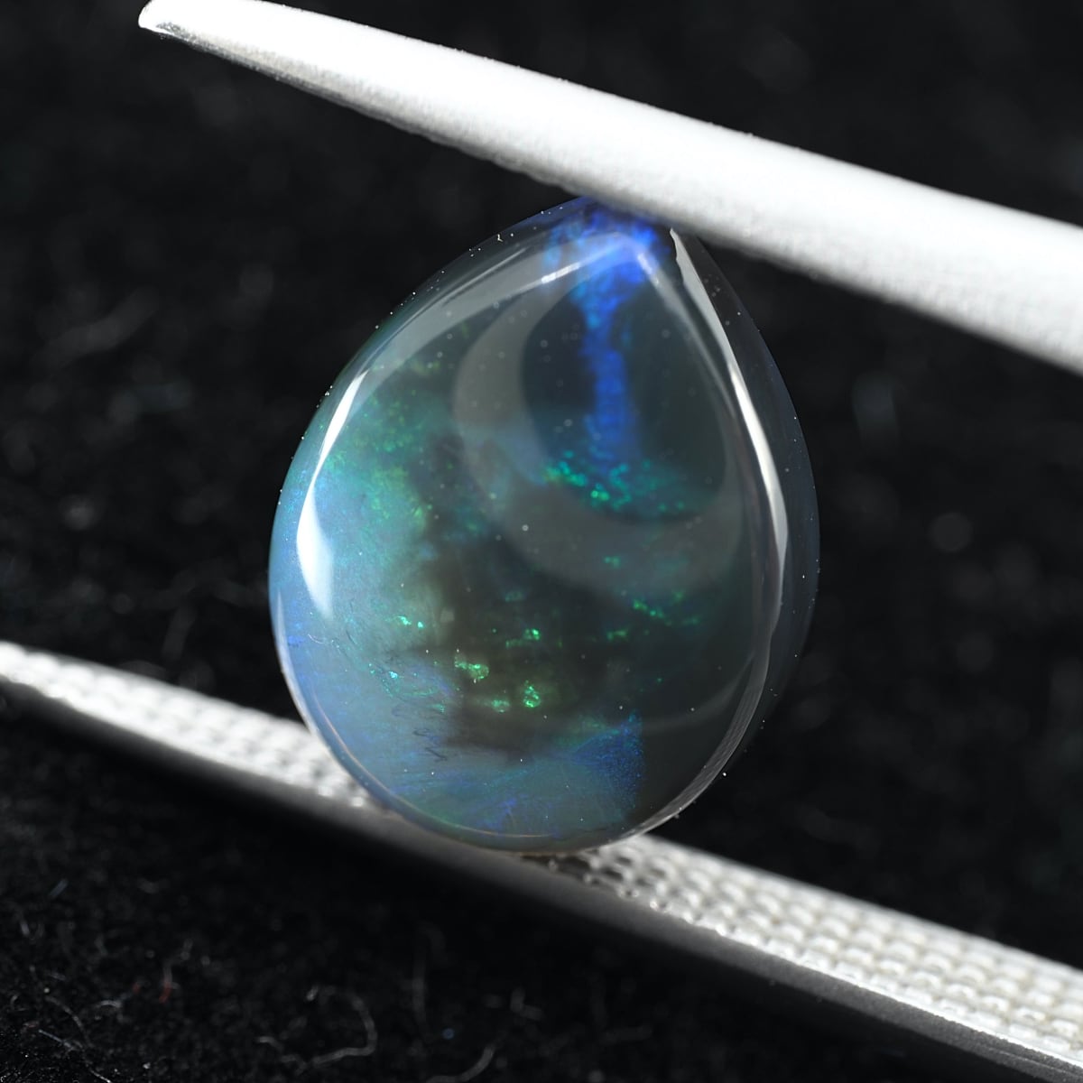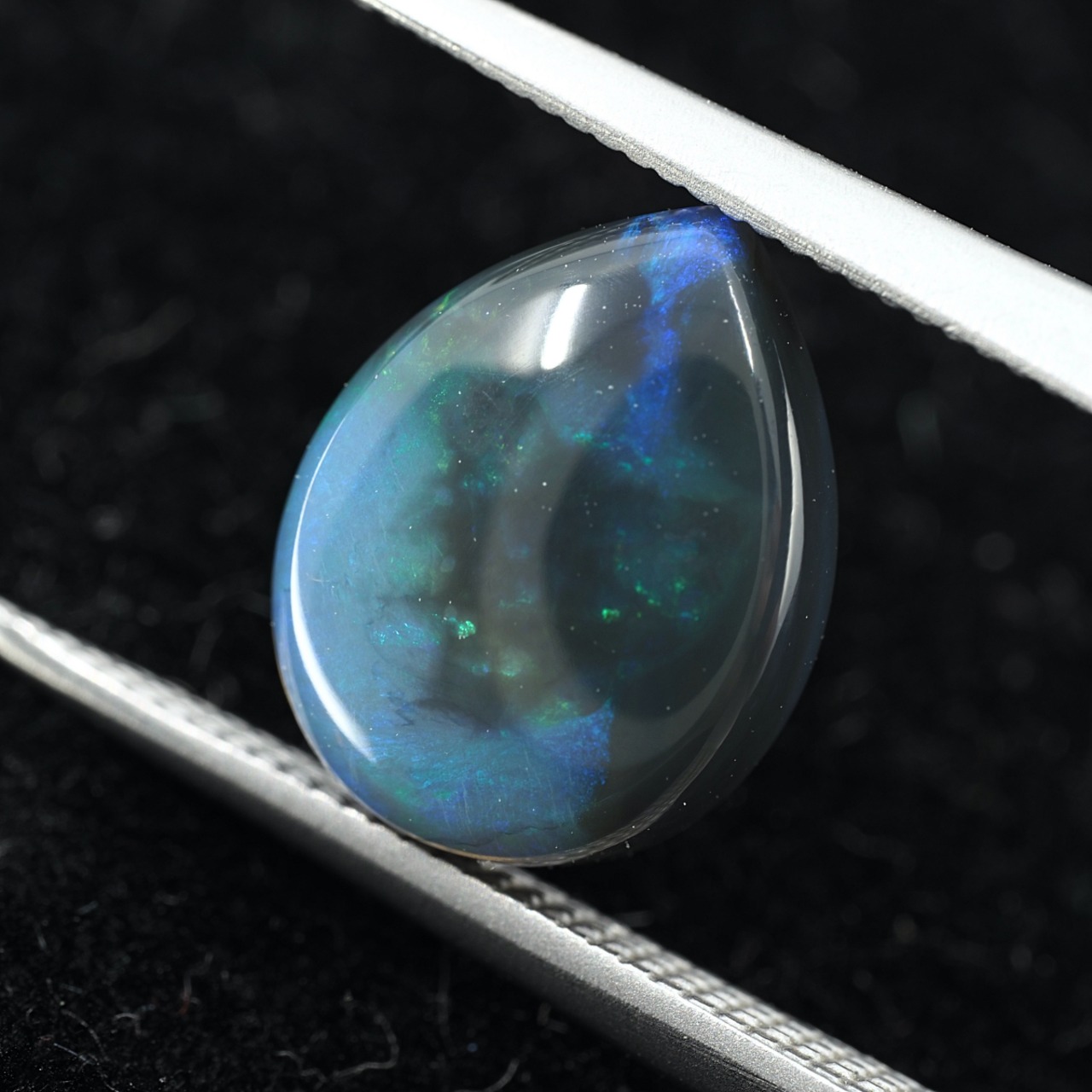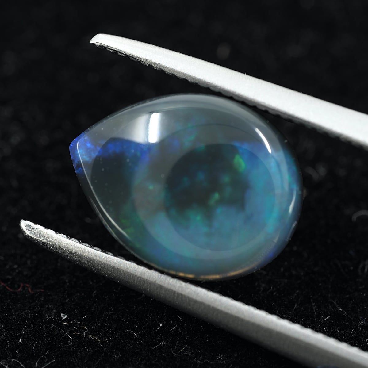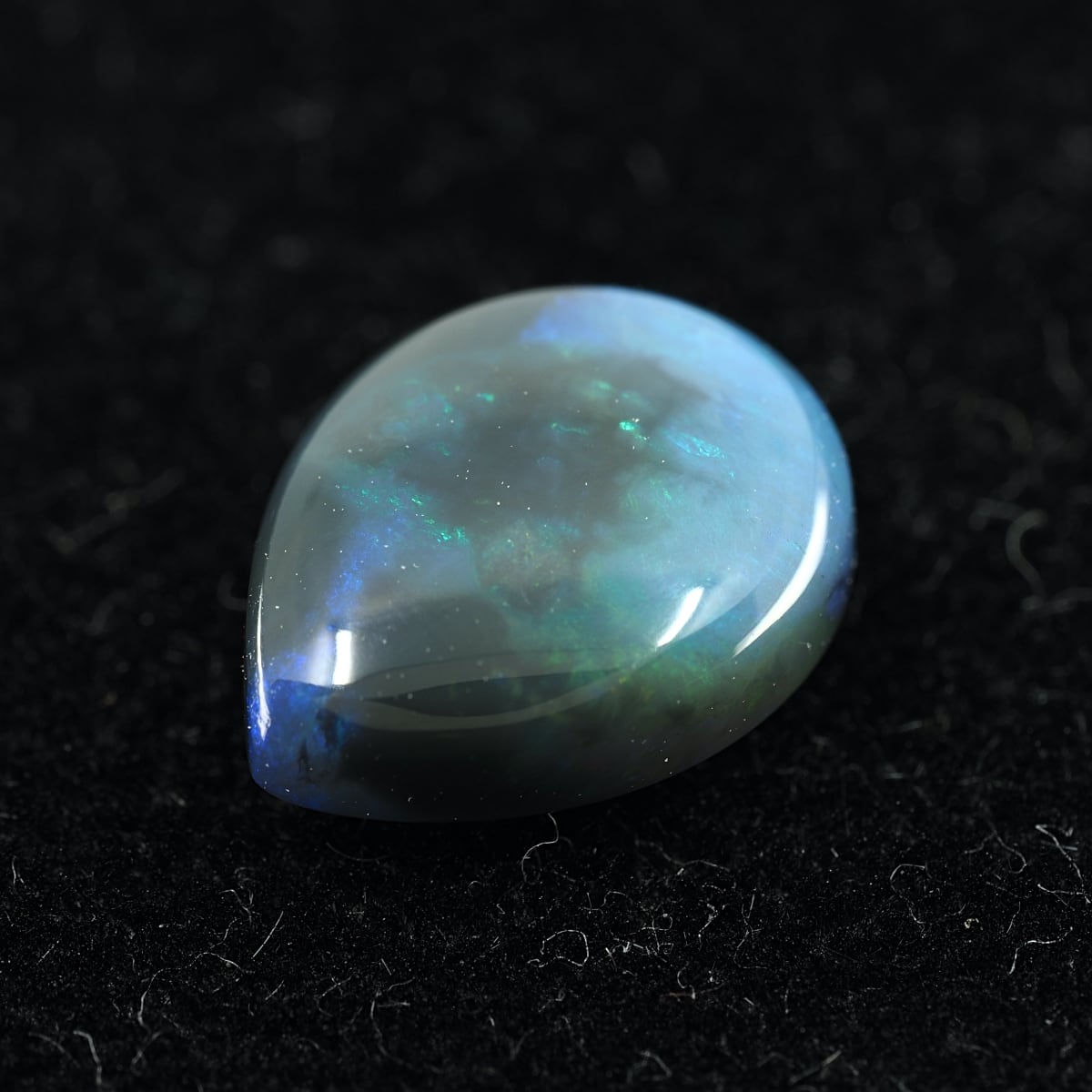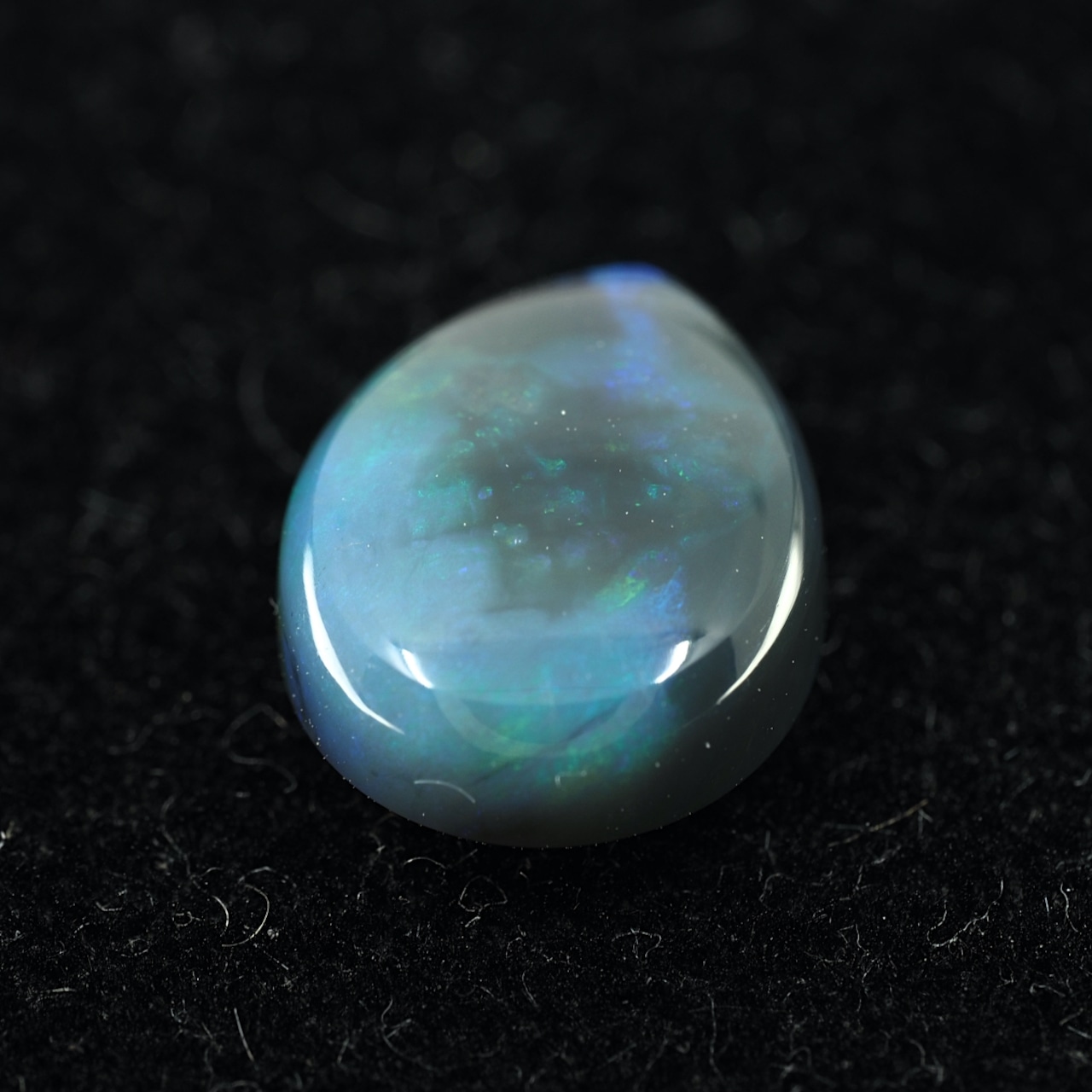 地色がグレー〜ブラックのセミブラックカラー。もちろん貼り合わせや処理のものではなくナチュラルなブラックオパール。遊色はブルーとグリーンオンリーでピーコック(孔雀)カラーのシックな個体です。数あるオパールの中でも最も珍重されるブラックオパールの唯一無二の雰囲気をお楽しみください。