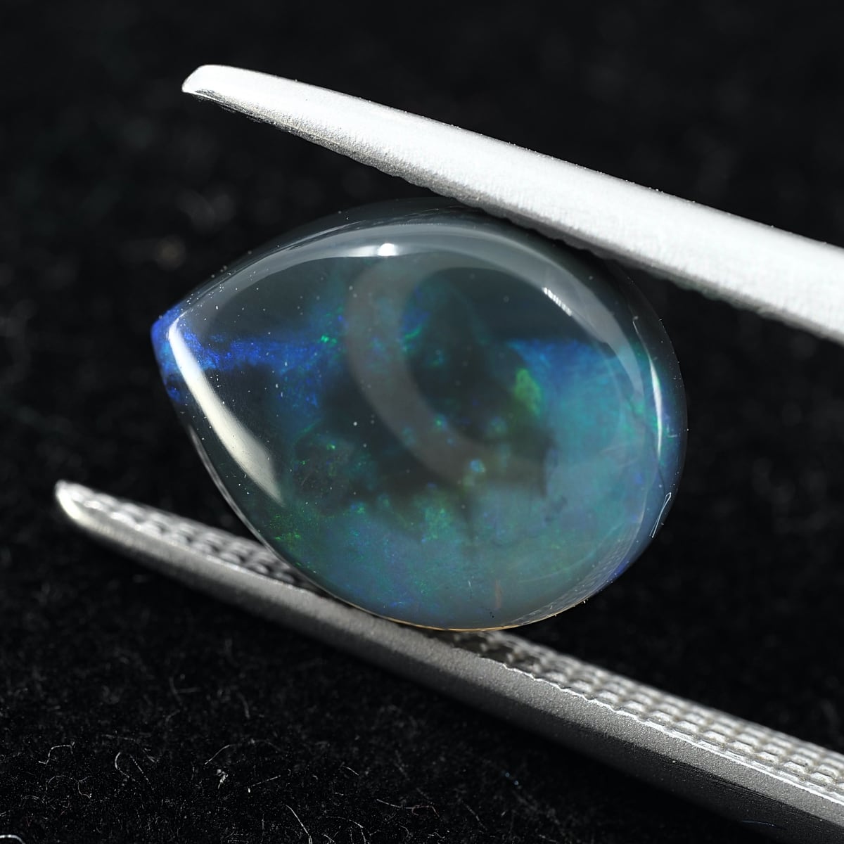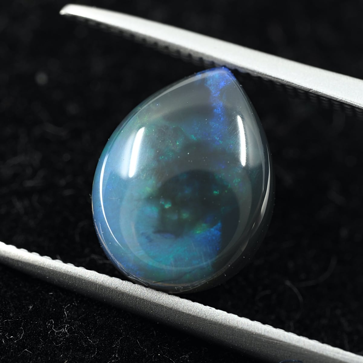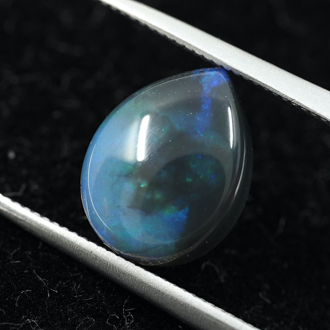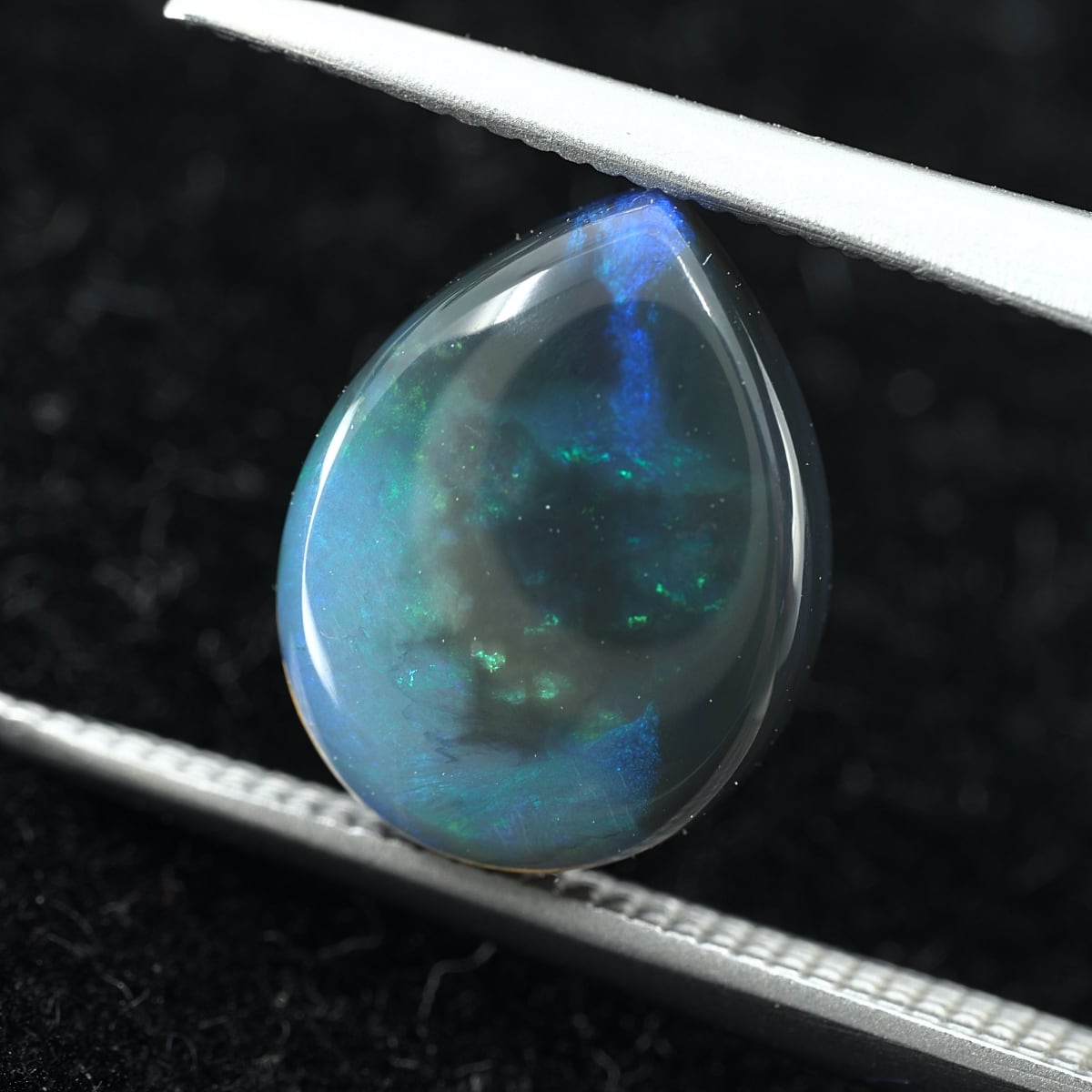 地色がグレー〜ブラックのセミブラックカラー。もちろん貼り合わせや処理のものではなくナチュラルなブラックオパール。遊色はブルーとグリーンオンリーでピーコック(孔雀)カラーのシックな個体です。数あるオパールの中でも最も珍重されるブラックオパールの唯一無二の雰囲気をお楽しみください。