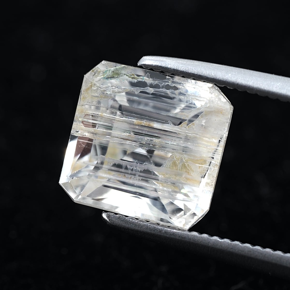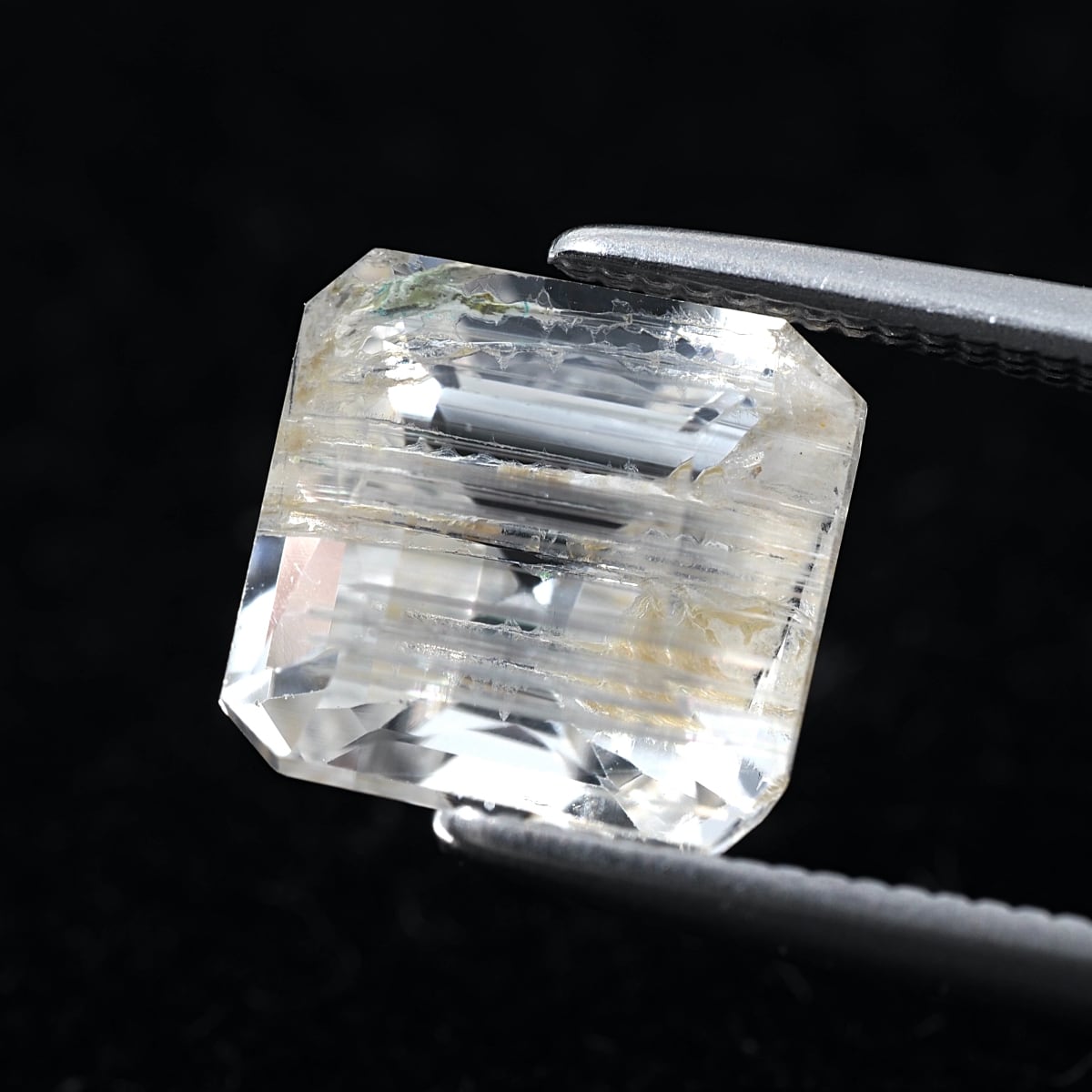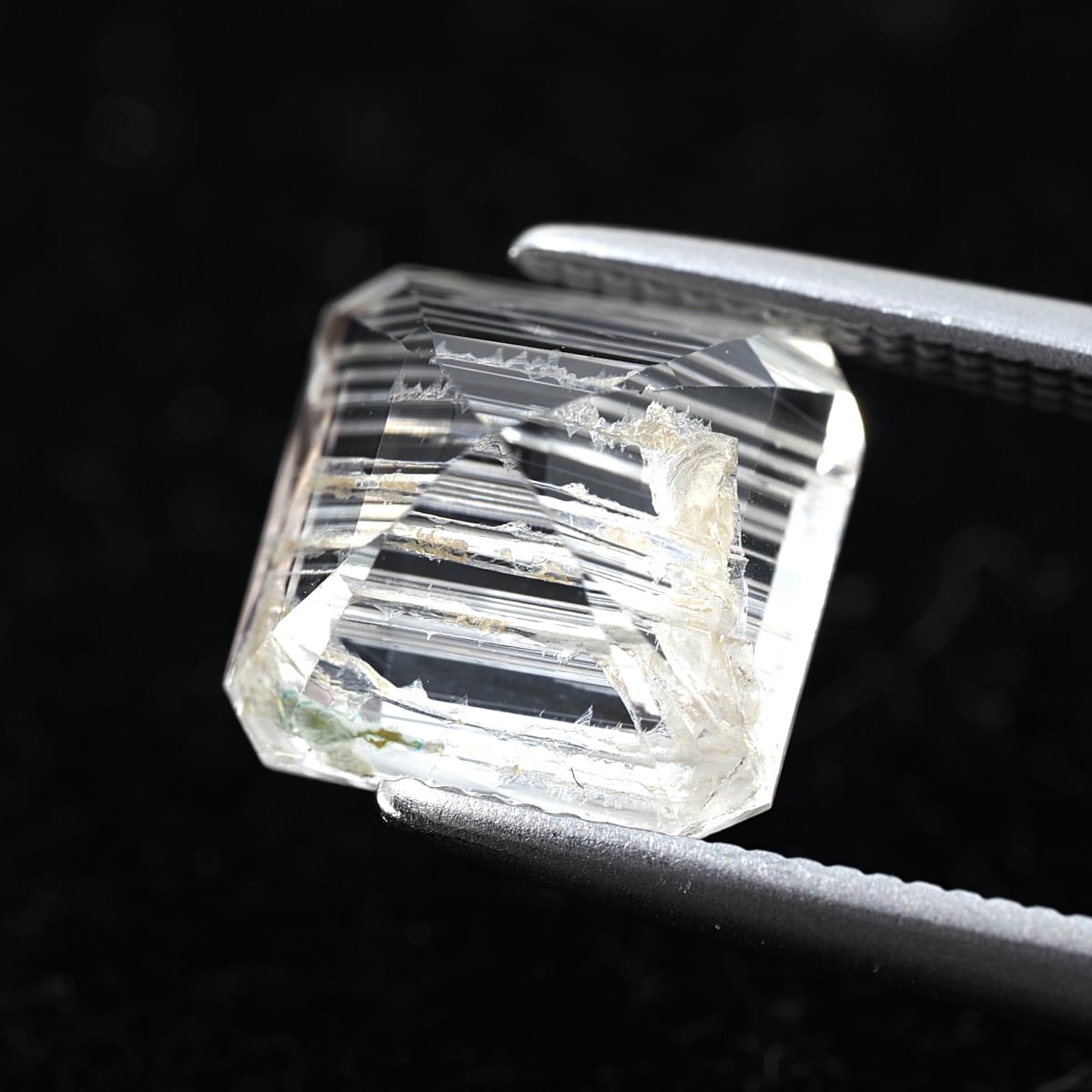 To the naked eye, it sparkles and shimmers, but under a loupe, you can see distinctive, thorn-like inclusions. While labeled as rutile, these are most likely tube inclusions. It's a type I rarely encounter even at purchasing events.