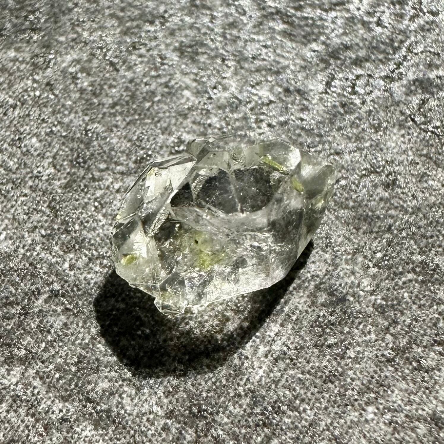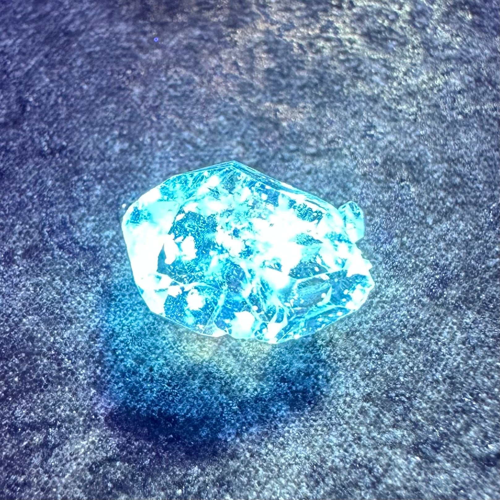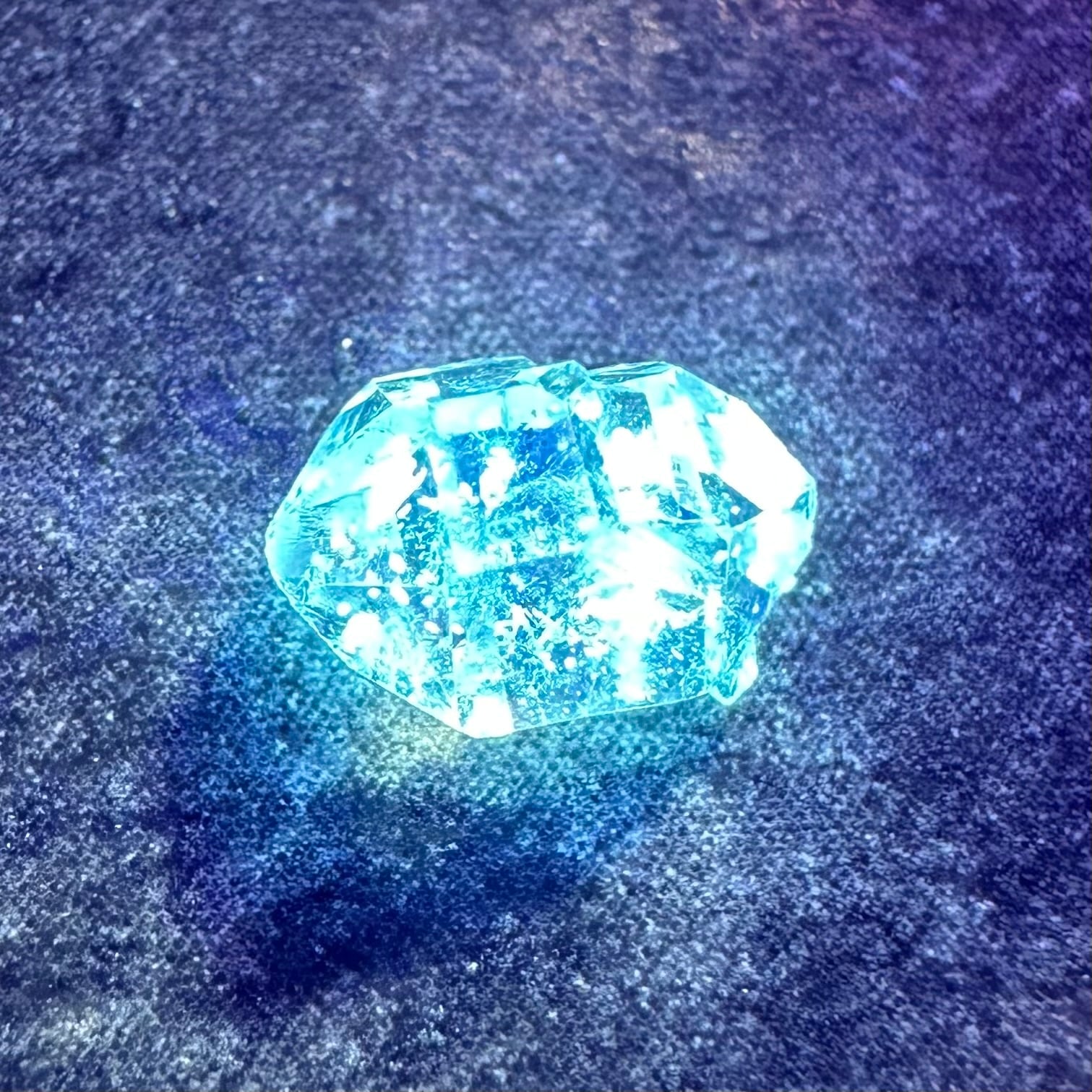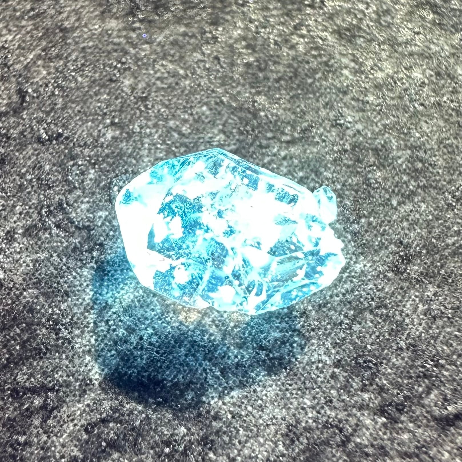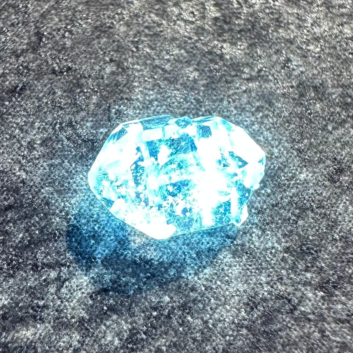 オイルインクォーツの最大の特徴ともいえるのが、ブラックライトを当てることで美しく蛍光するオイル。透明な水晶の中で、点在する石油がネオンブルーに光る様子は本当に幻想的です。