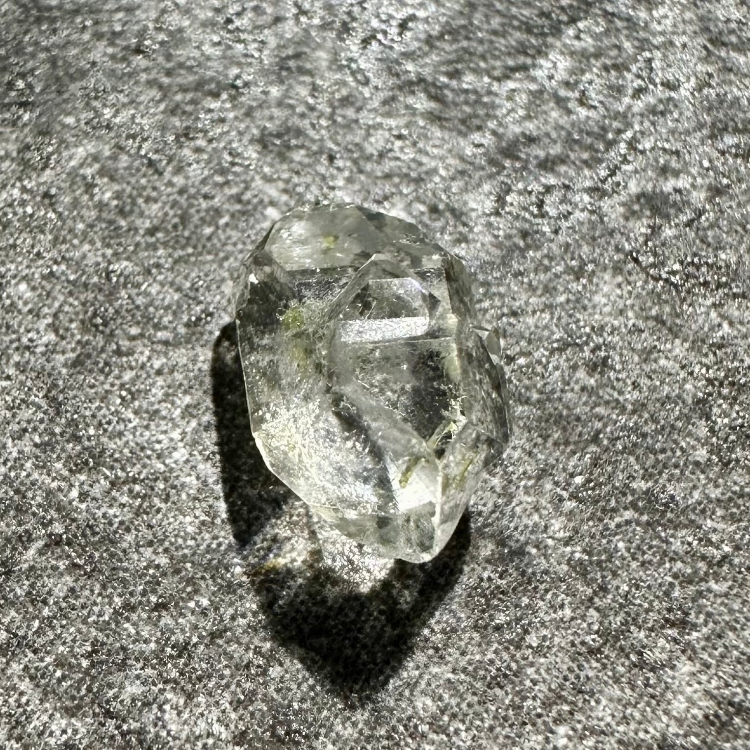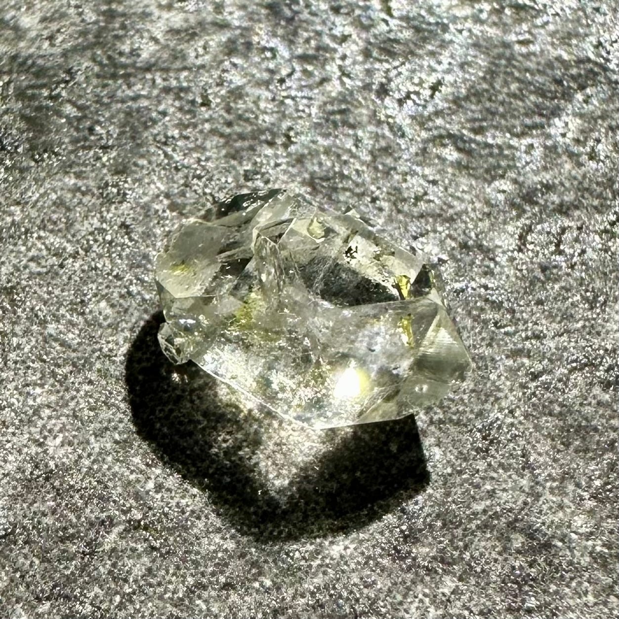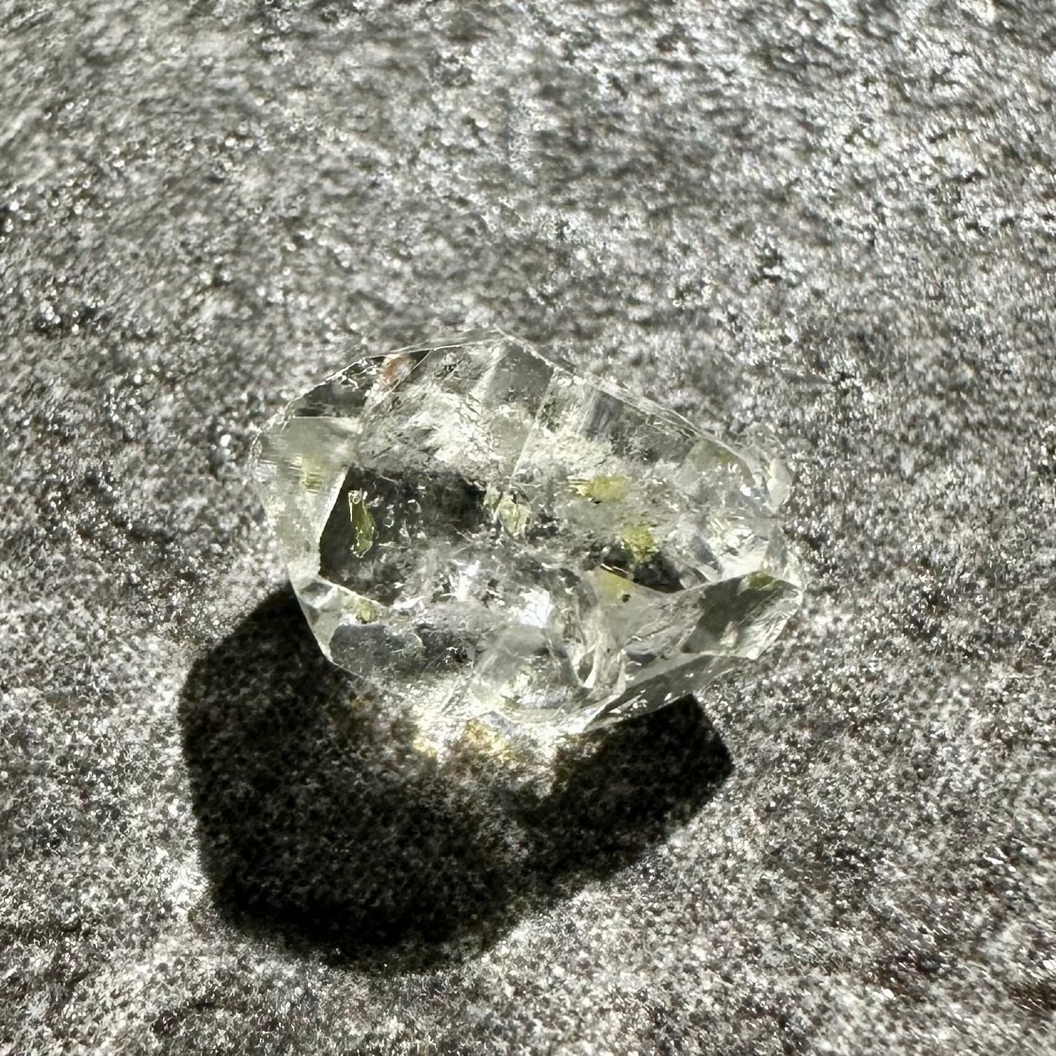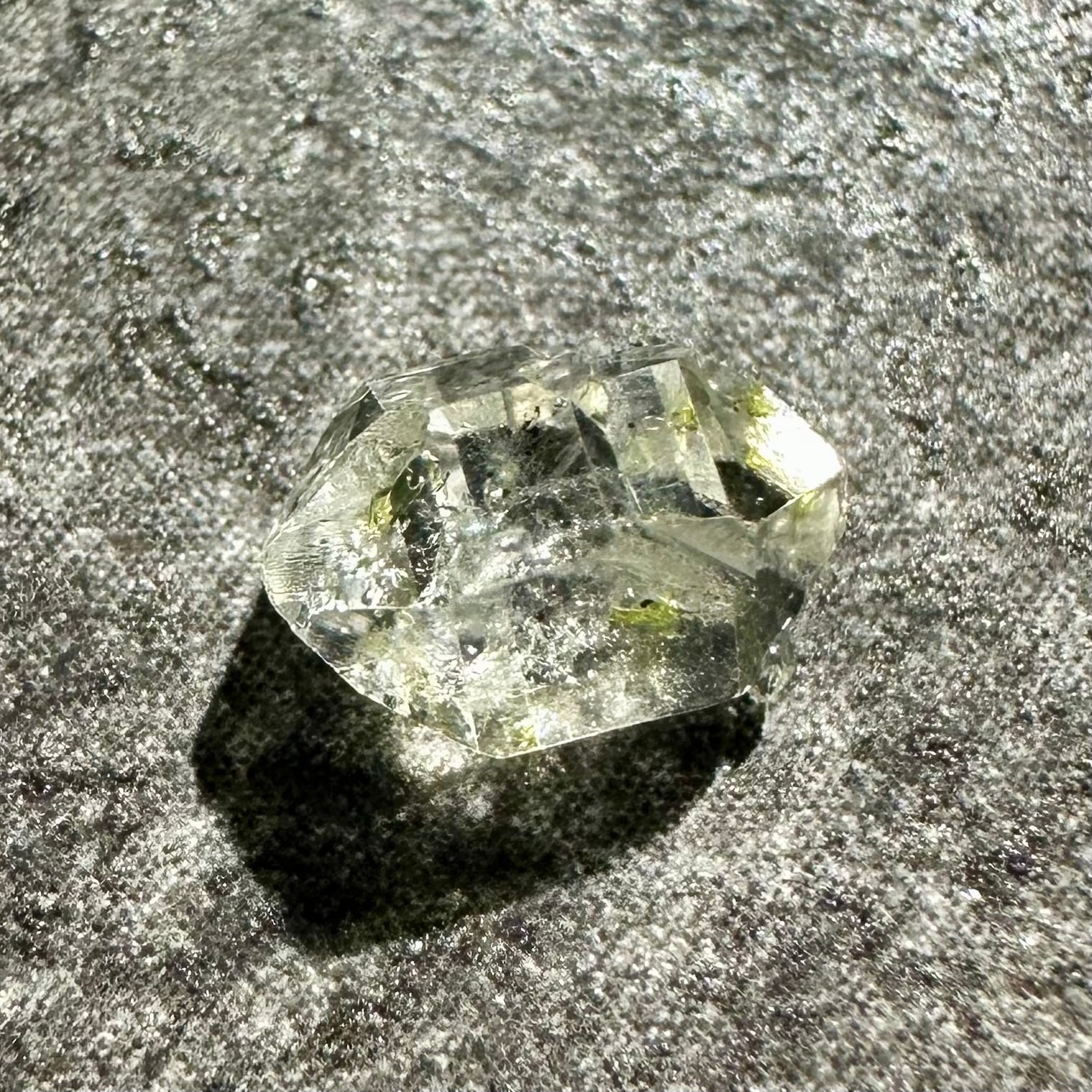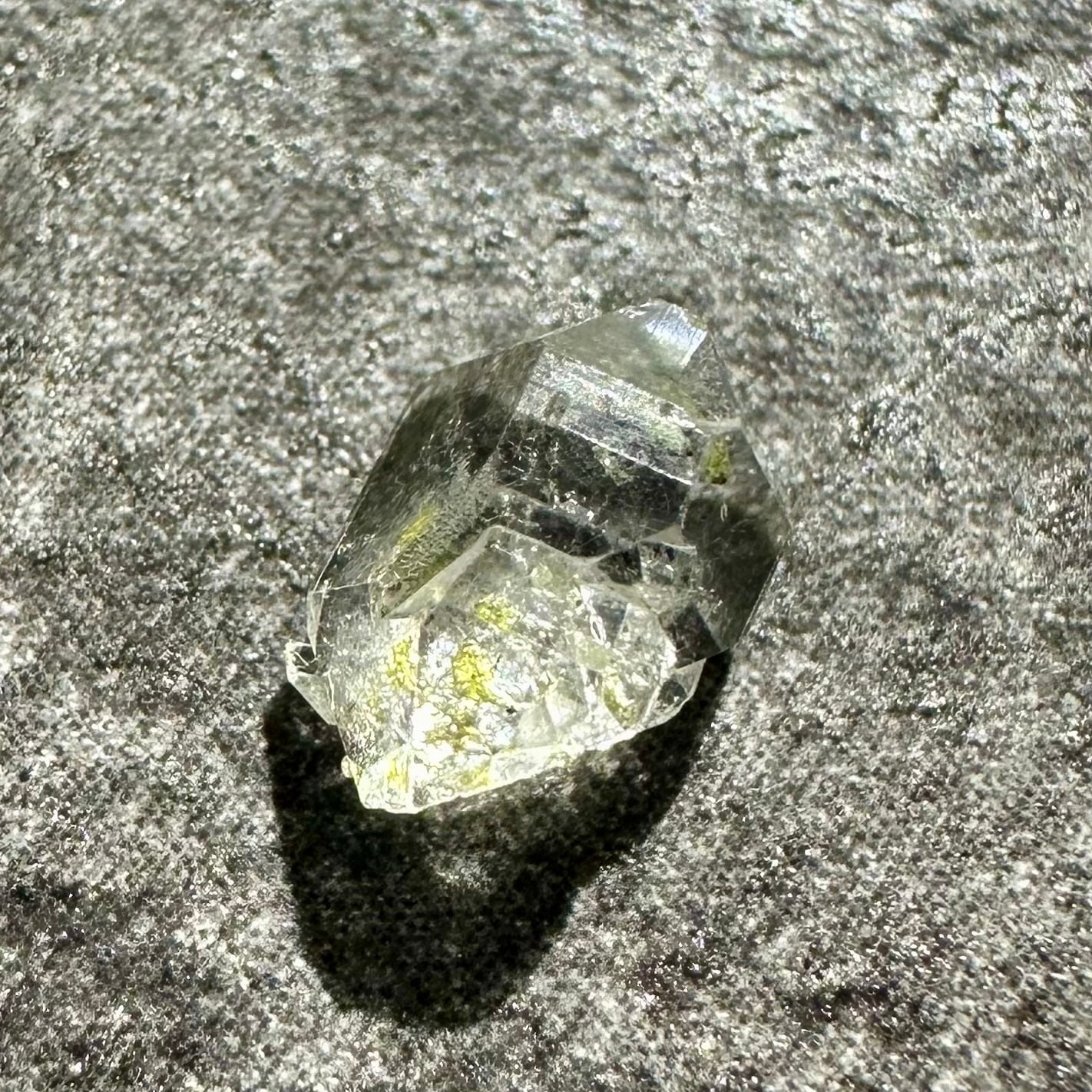 オイルインクォーツの最大の特徴ともいえるのが、ブラックライトを当てることで美しく蛍光するオイル。透明な水晶の中で、点在する石油がネオンブルーに光る様子は本当に幻想的です。