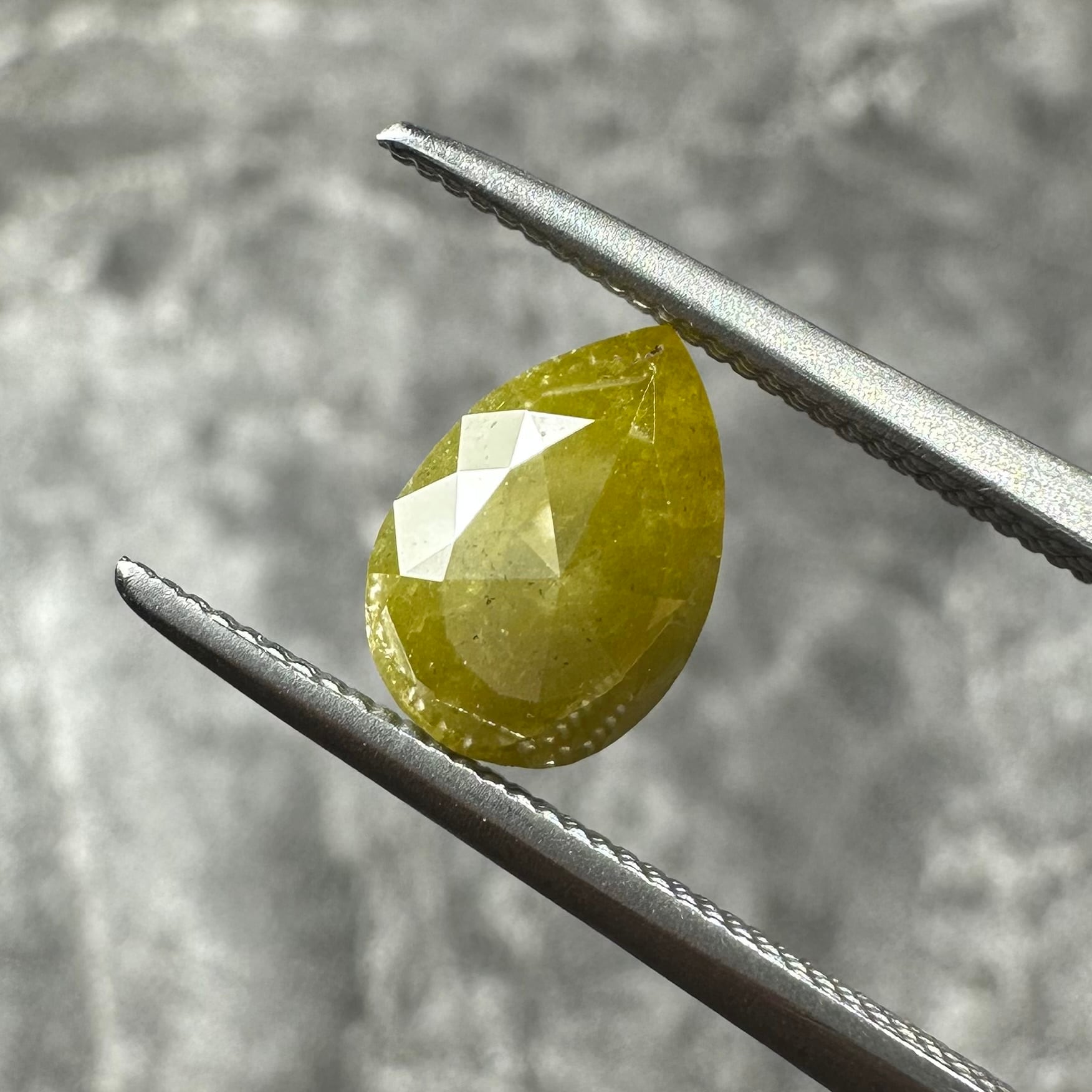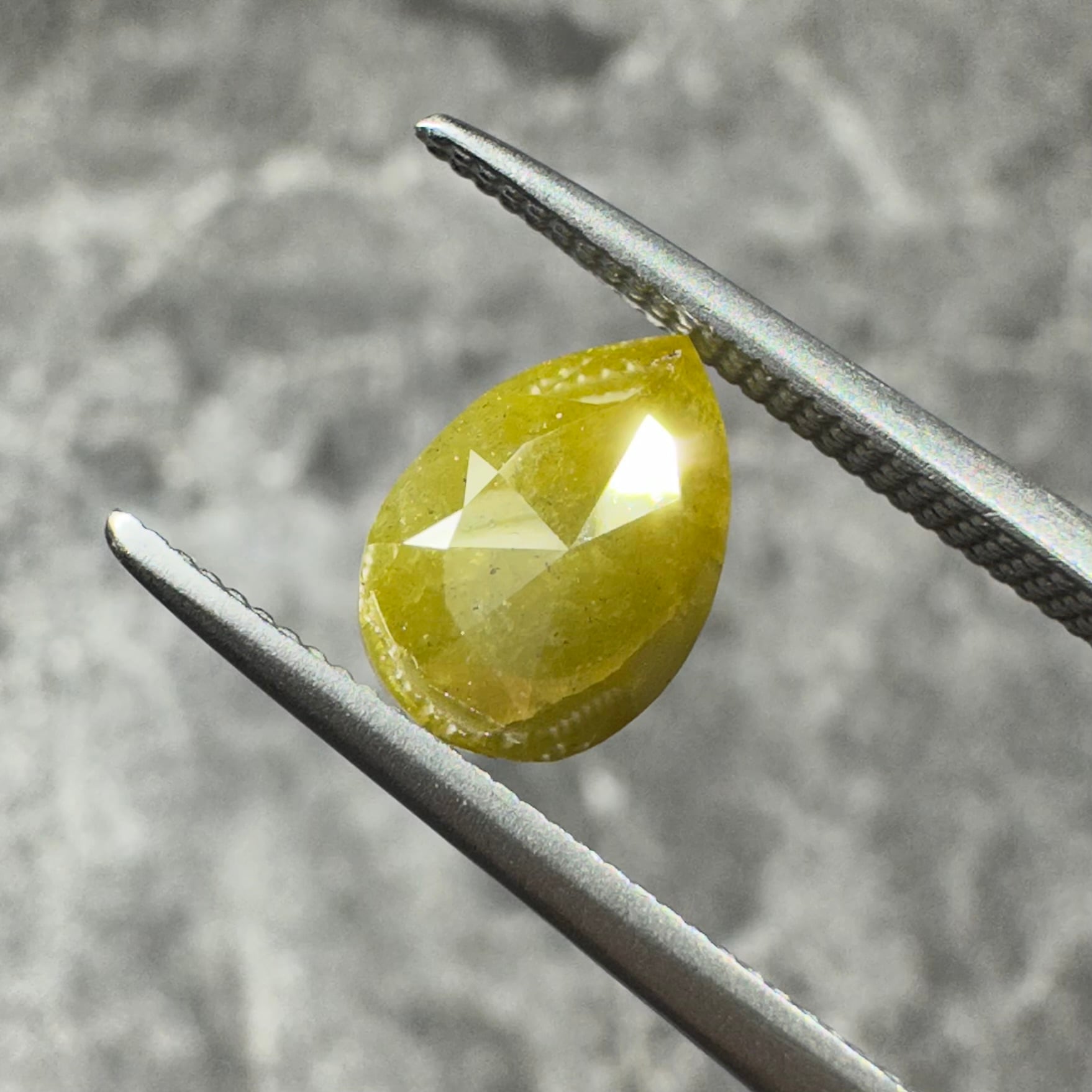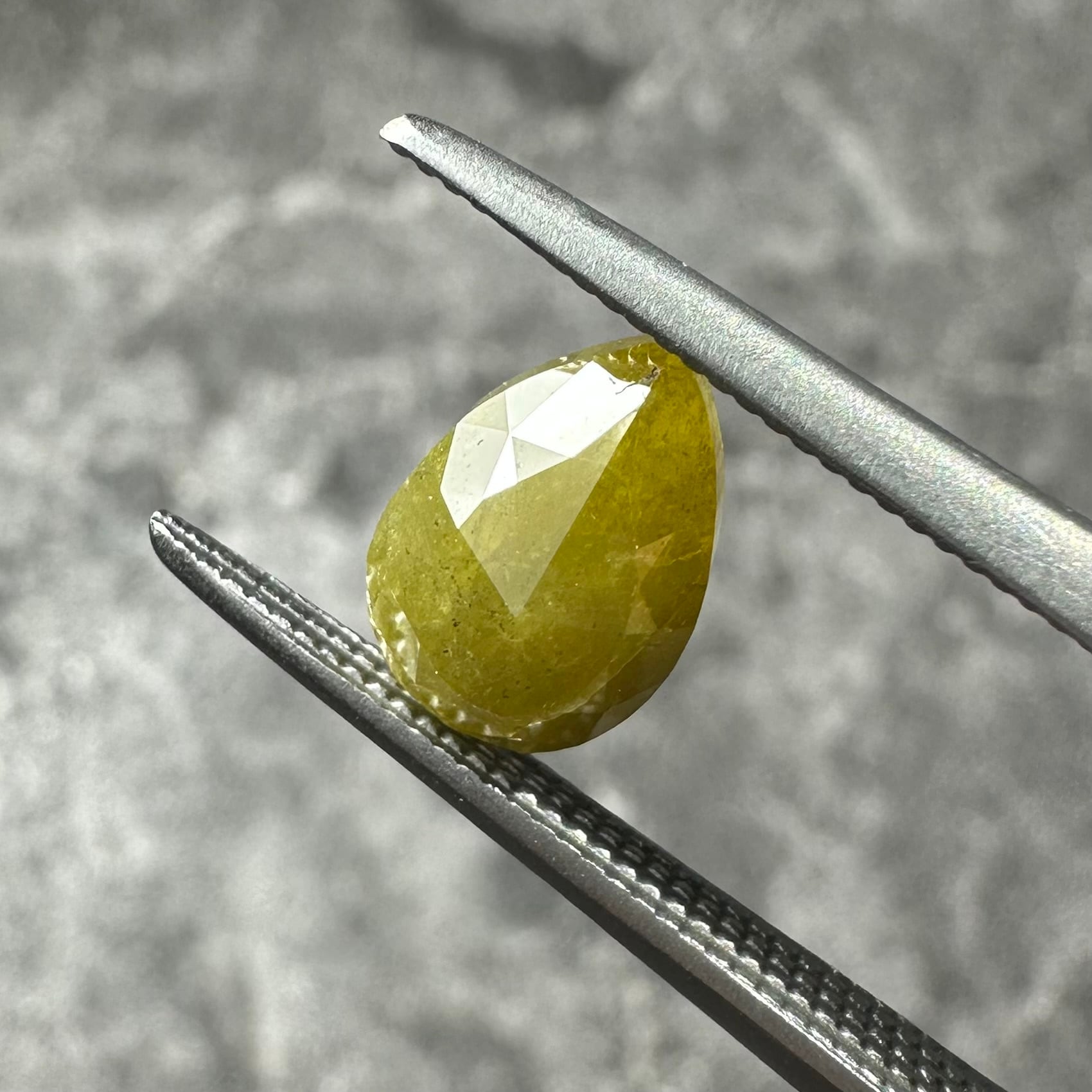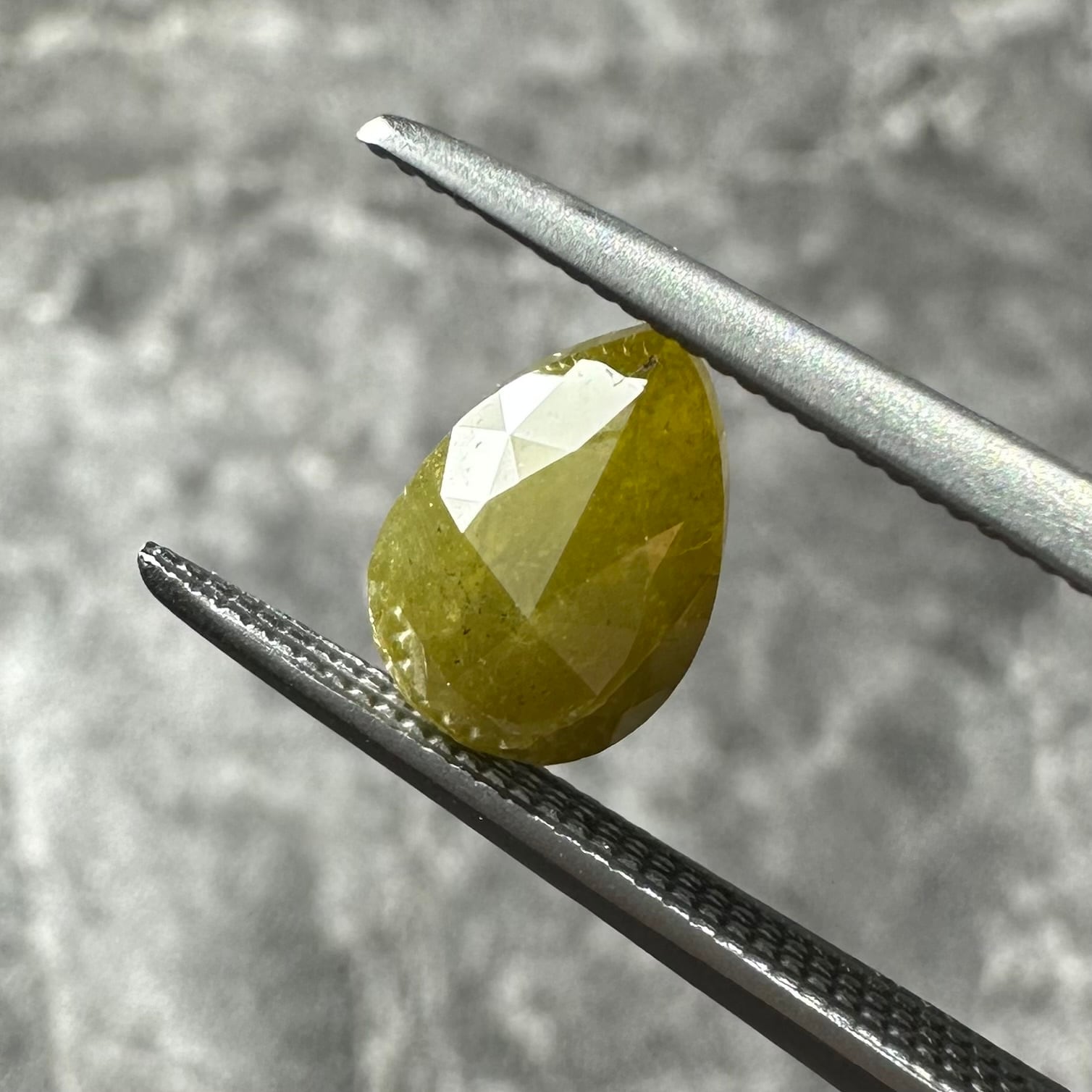 ローズカットらしい裏側が真っ平のフラットバックで、表面は少し変形のローズカットが施されています。色合いはマスタード&オリーブグリーンのような独特のカラー。キャラアップです!