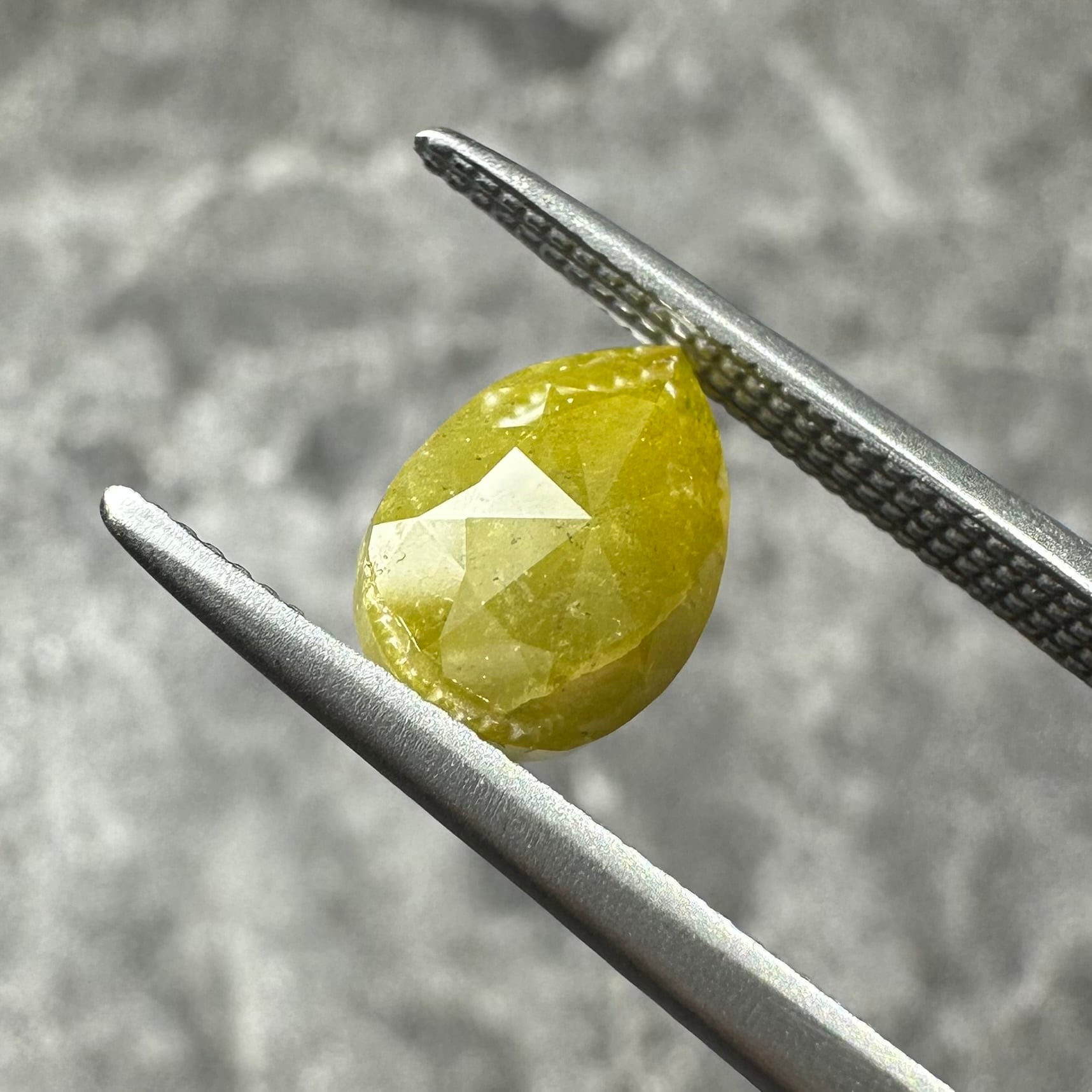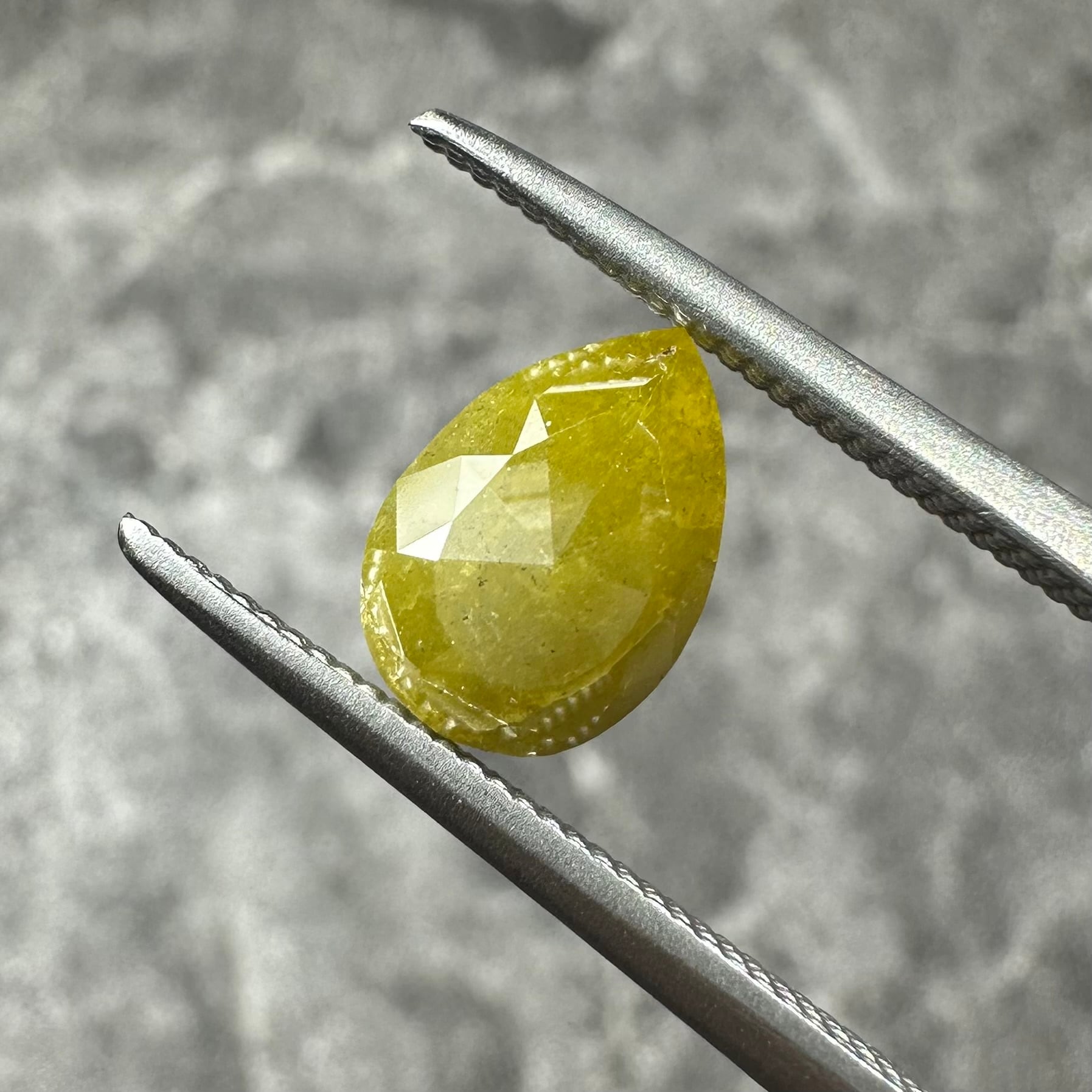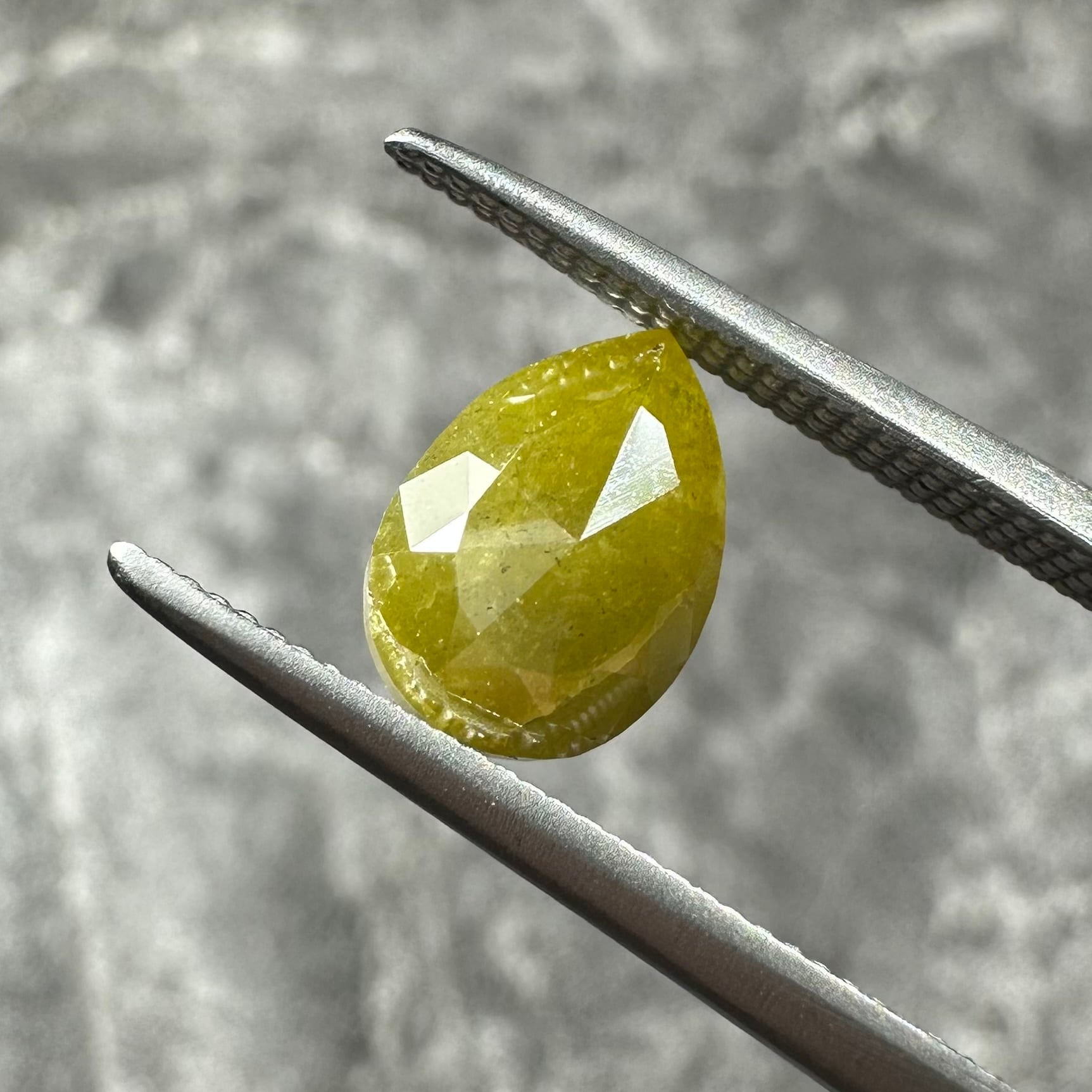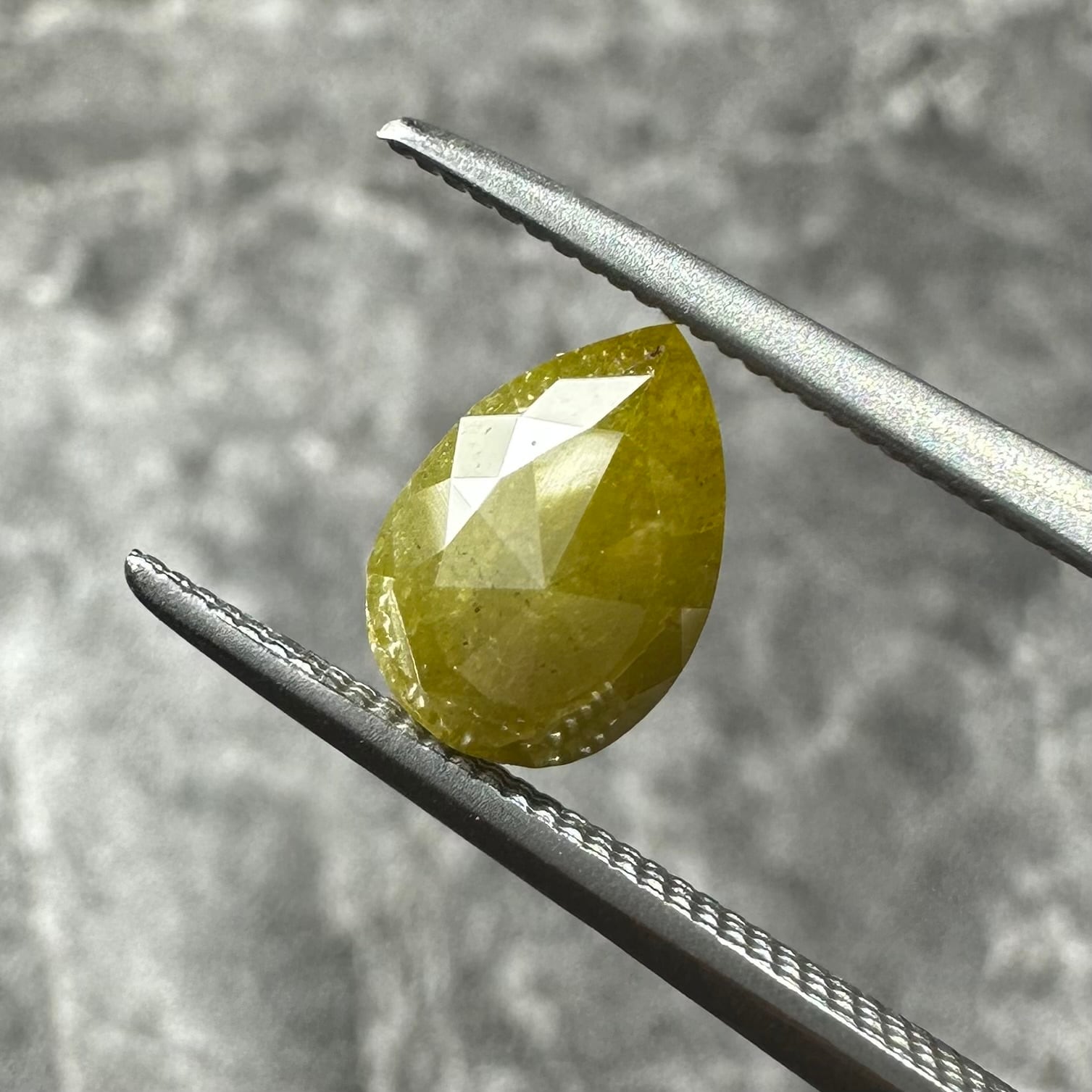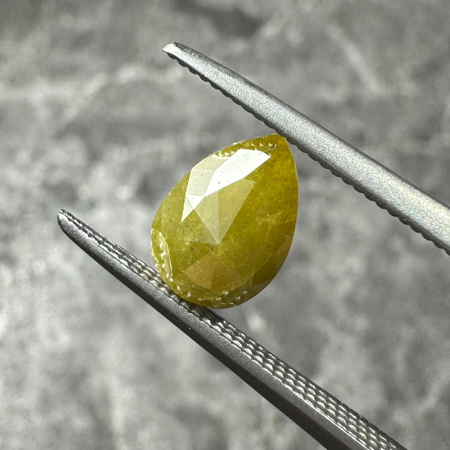 ローズカットらしい裏側が真っ平のフラットバックで、表面は少し変形のローズカットが施されています。色合いはマスタード&オリーブグリーンのような独特のカラー。キャラアップです!