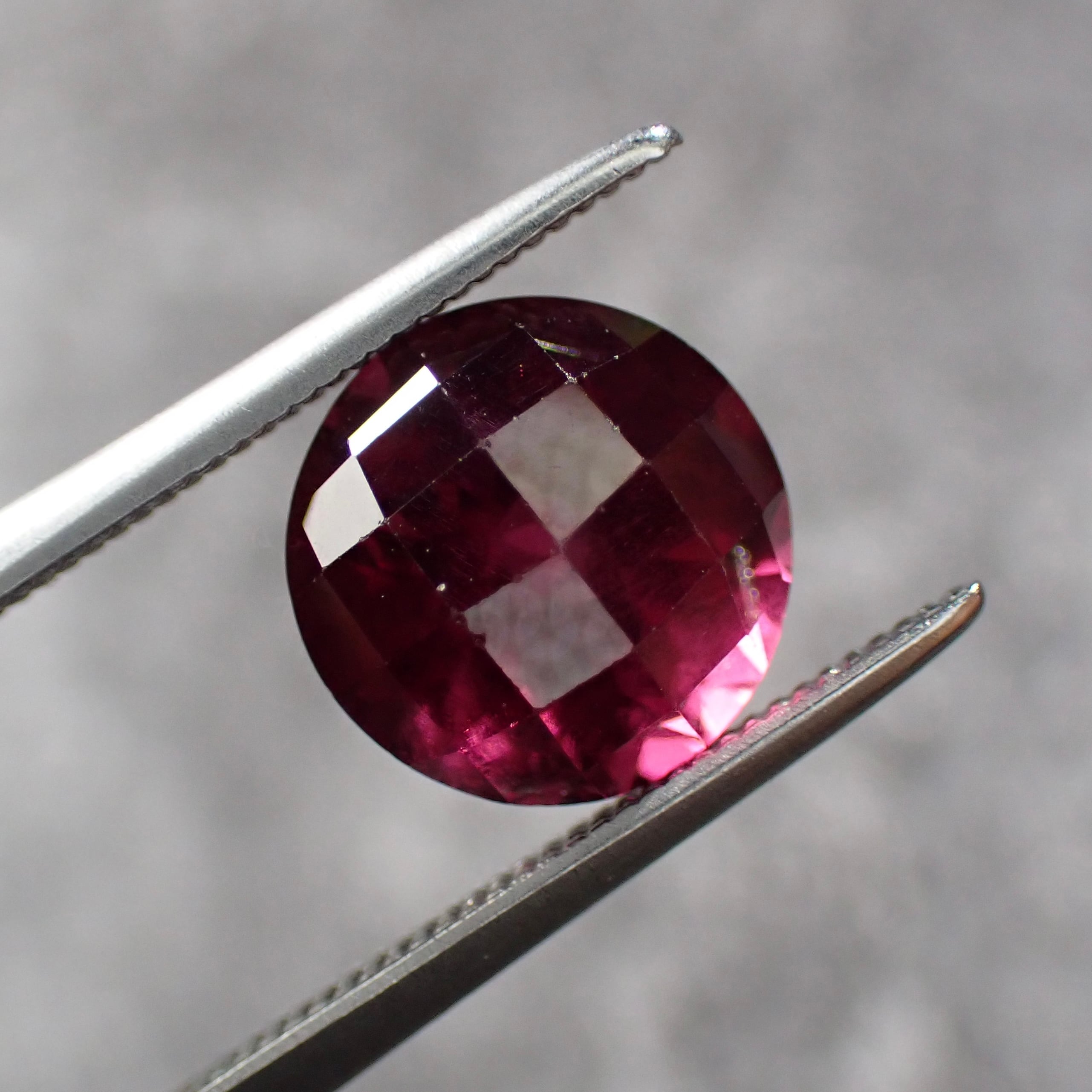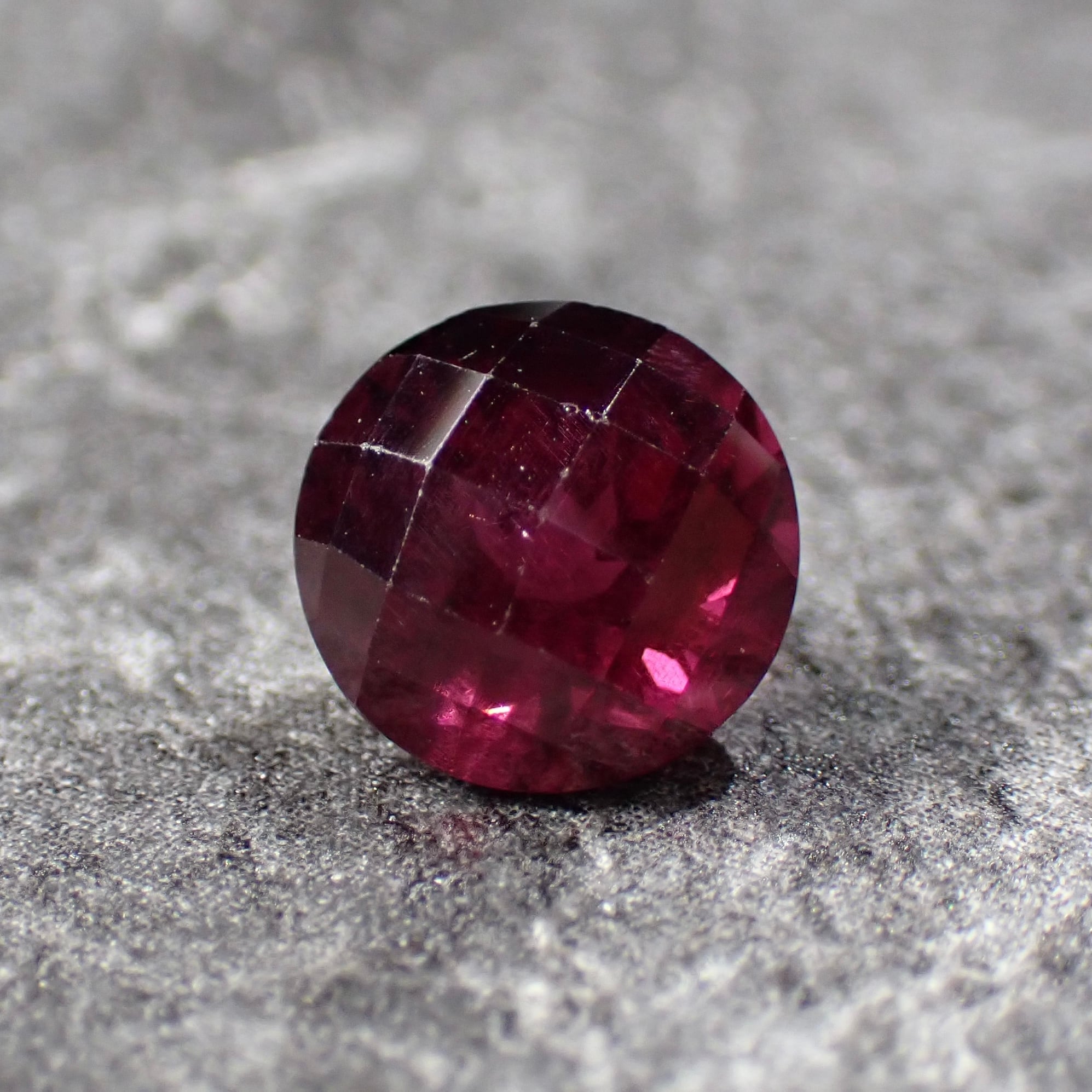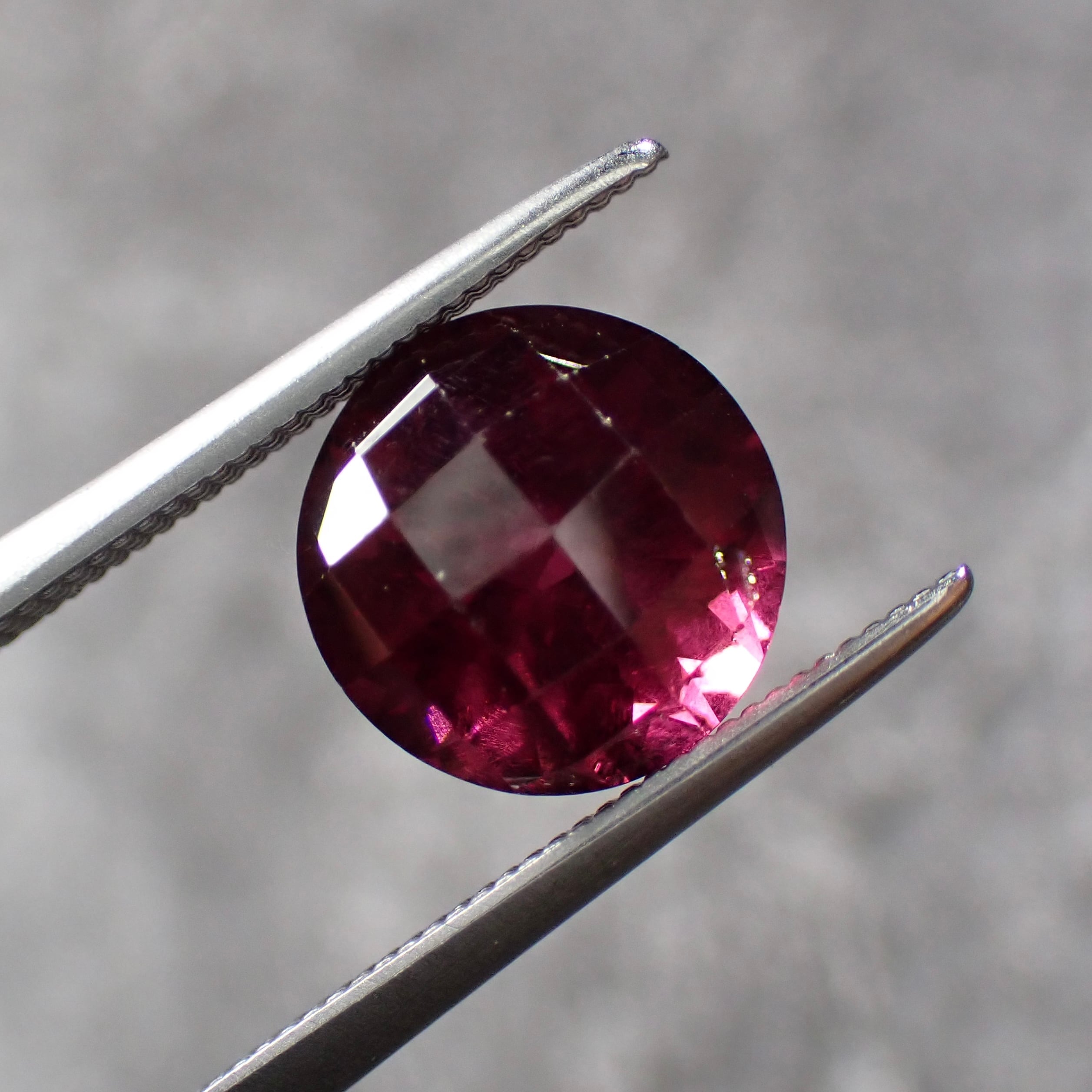 光の角度でライトなパープルカラーが見えるのと、チェッカーボードカットを施した個体です。