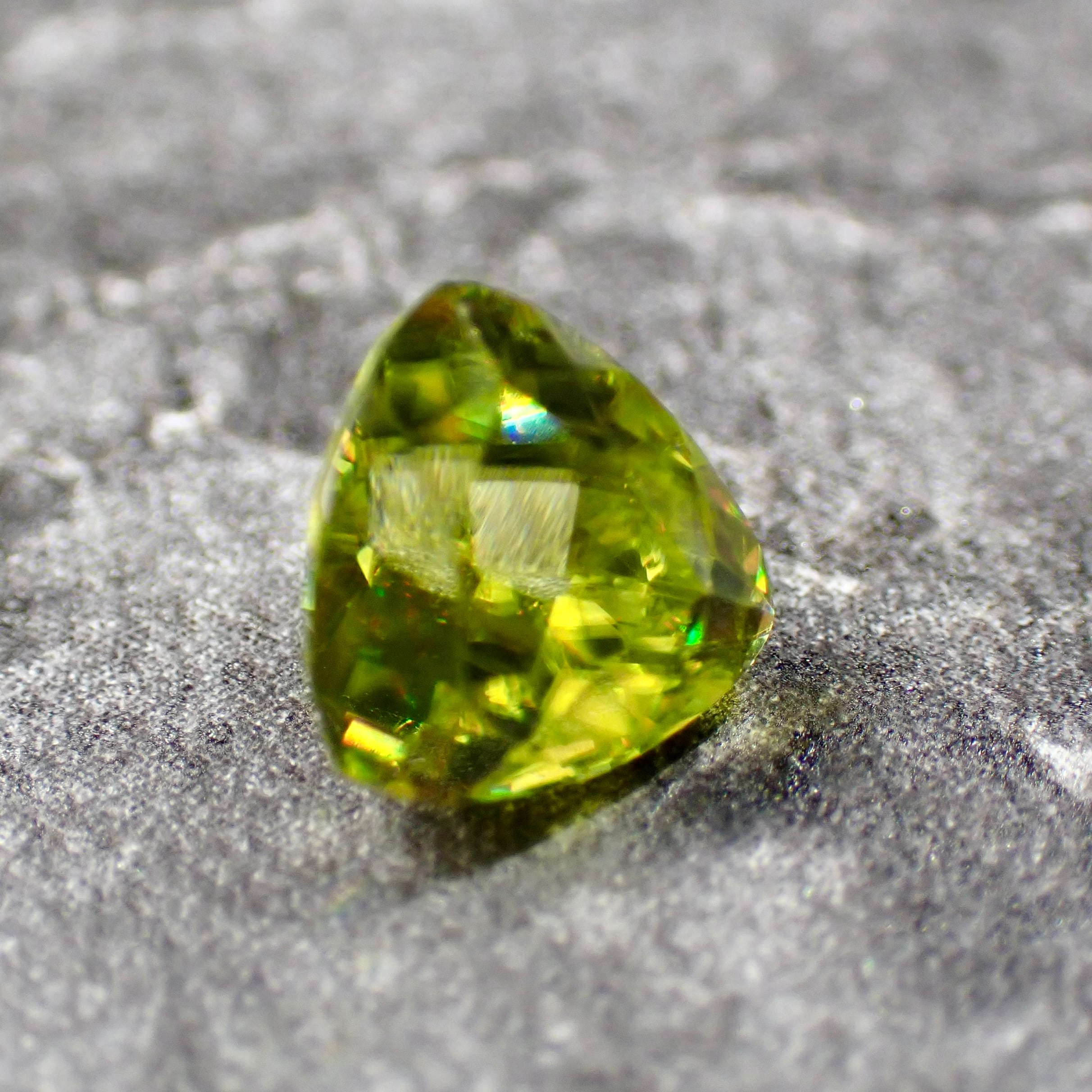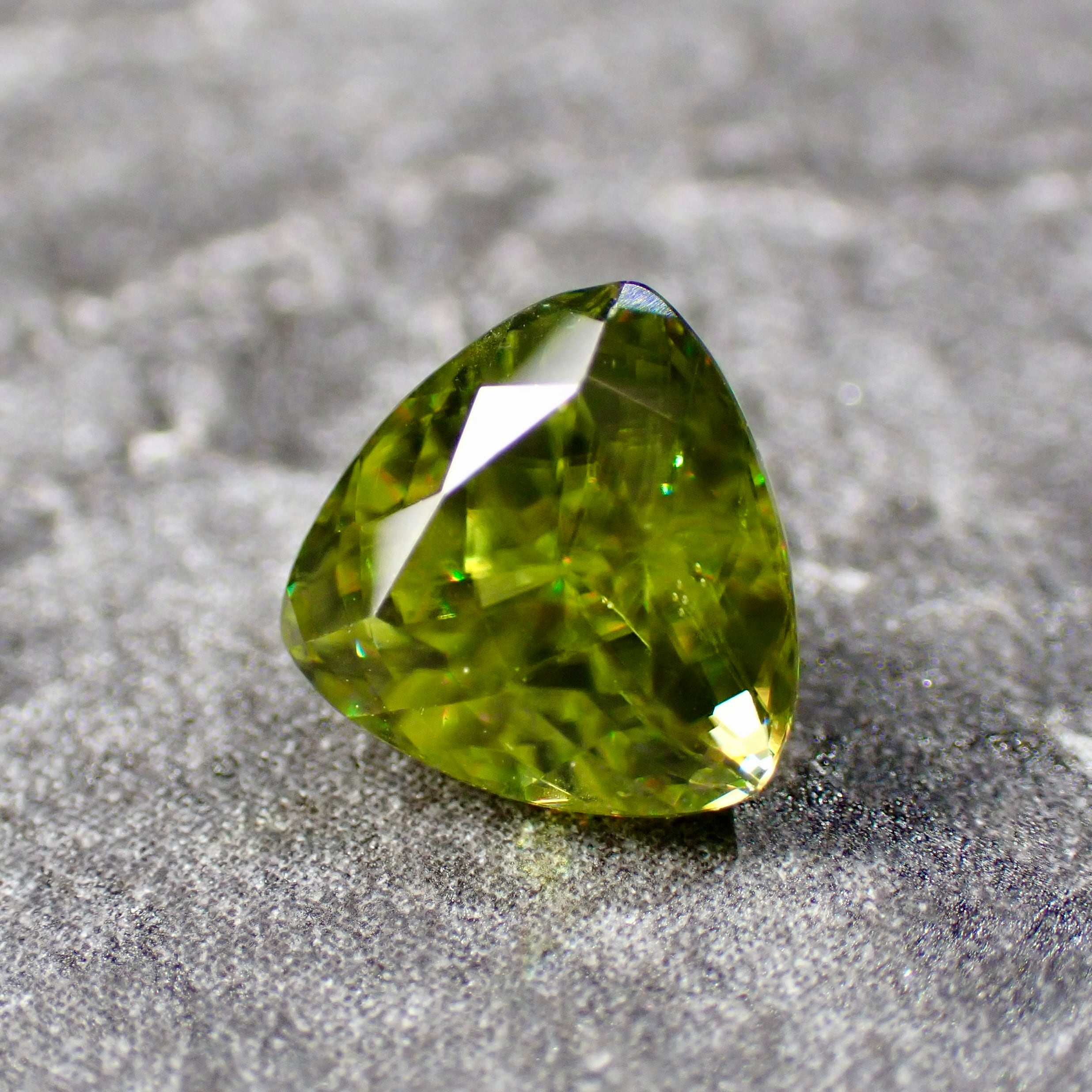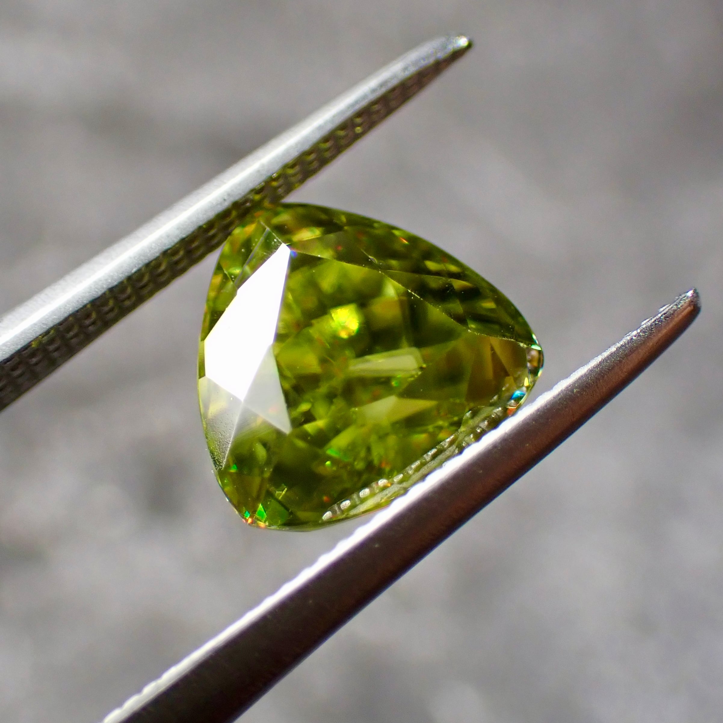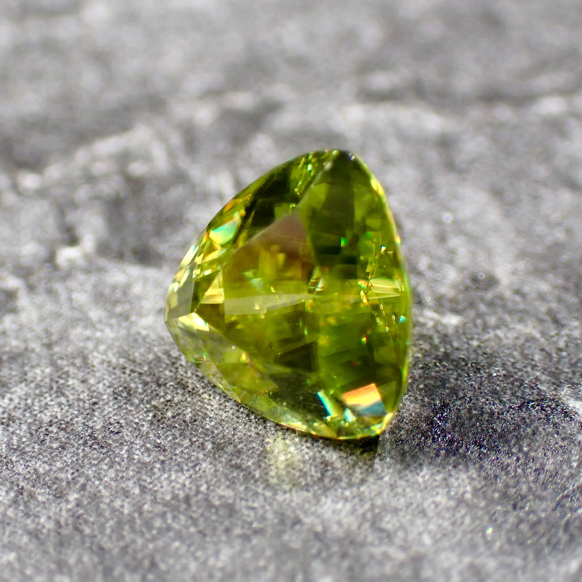 光をスペクトル色にする特徴があり、グリーンの宝石ながら、赤、橙、黄、明るいグリーンと様々な色の輝きを見せます。これはダイヤモンドも持つ「ファイア」という特性なのですが、その屈折率はダイヤモンドをも凌ぎます。