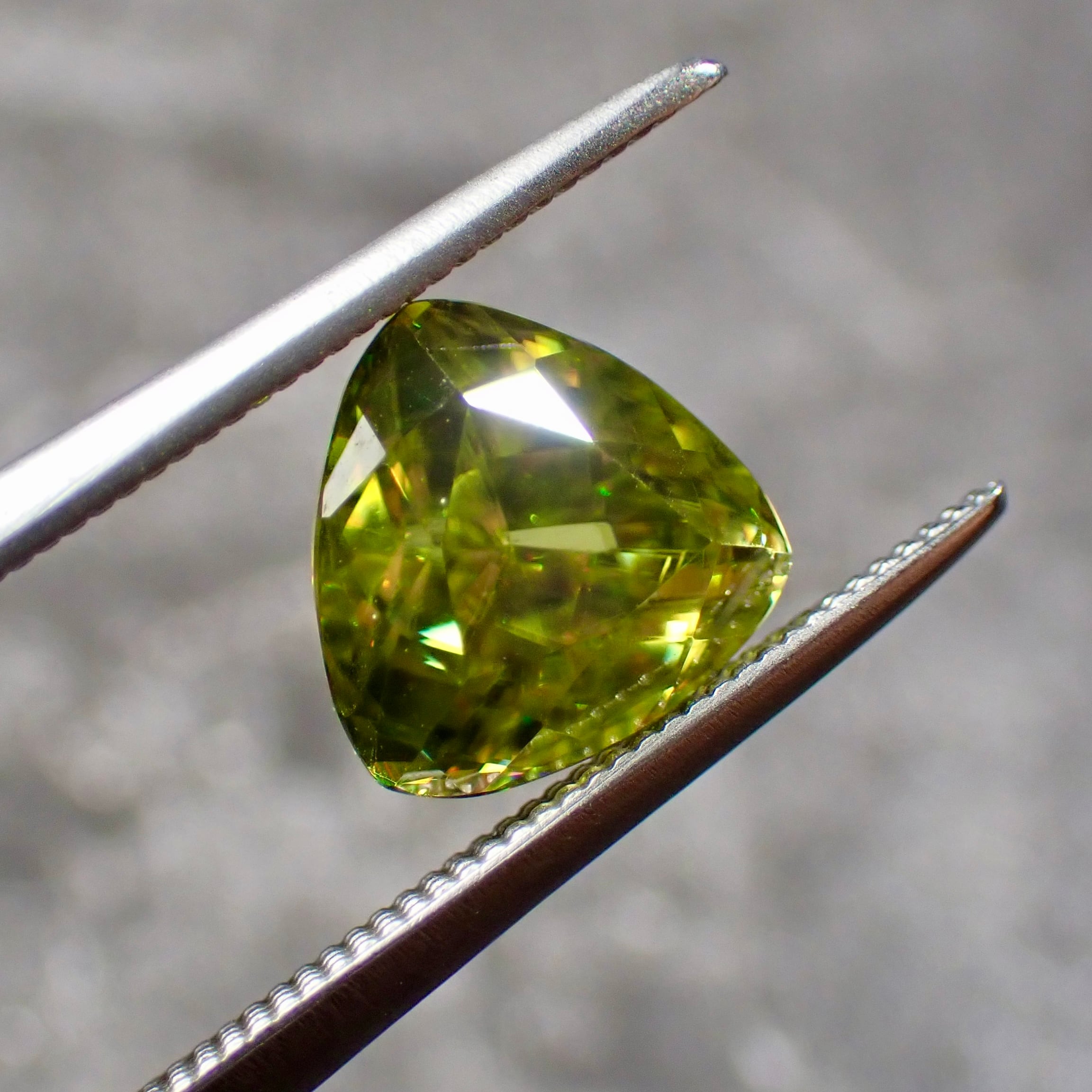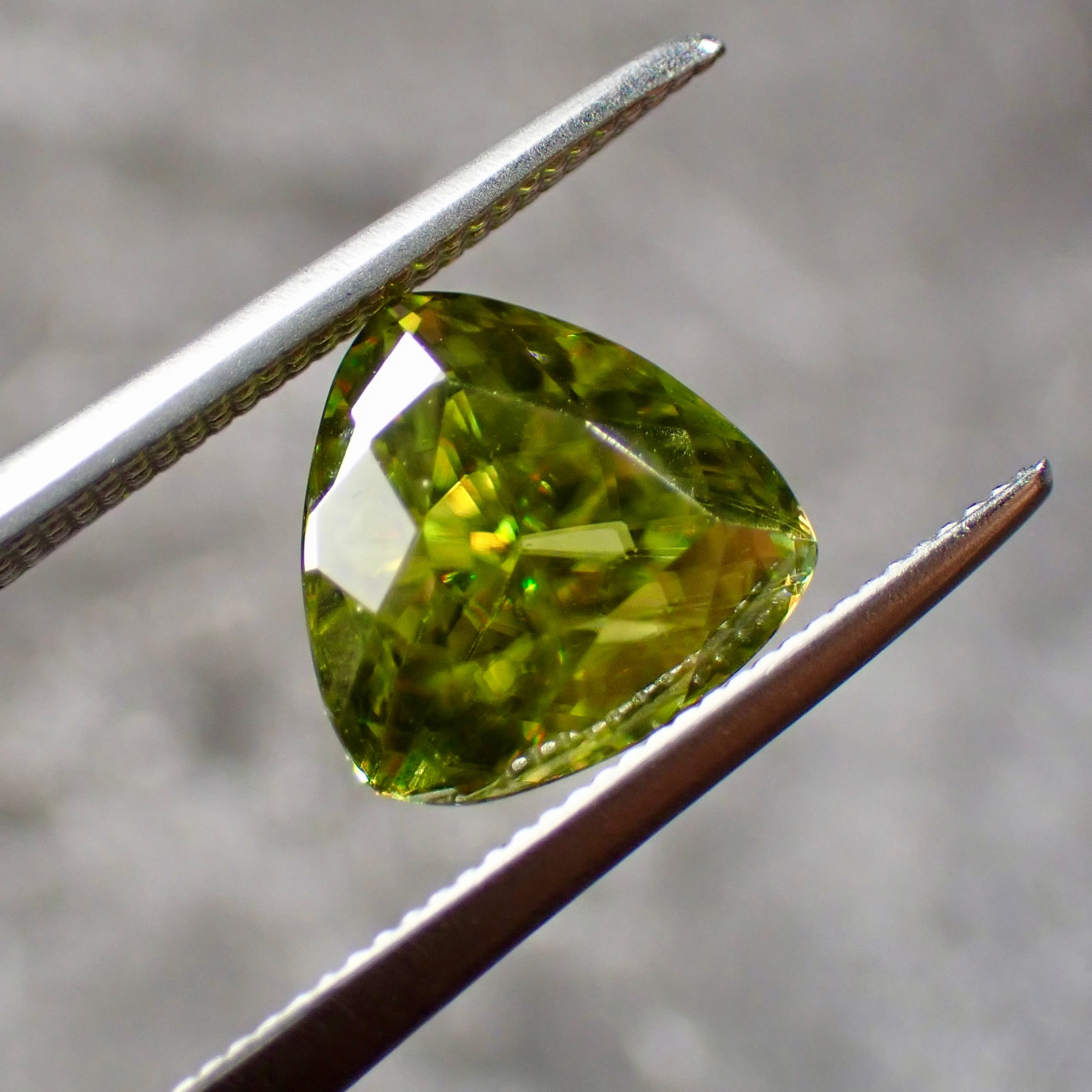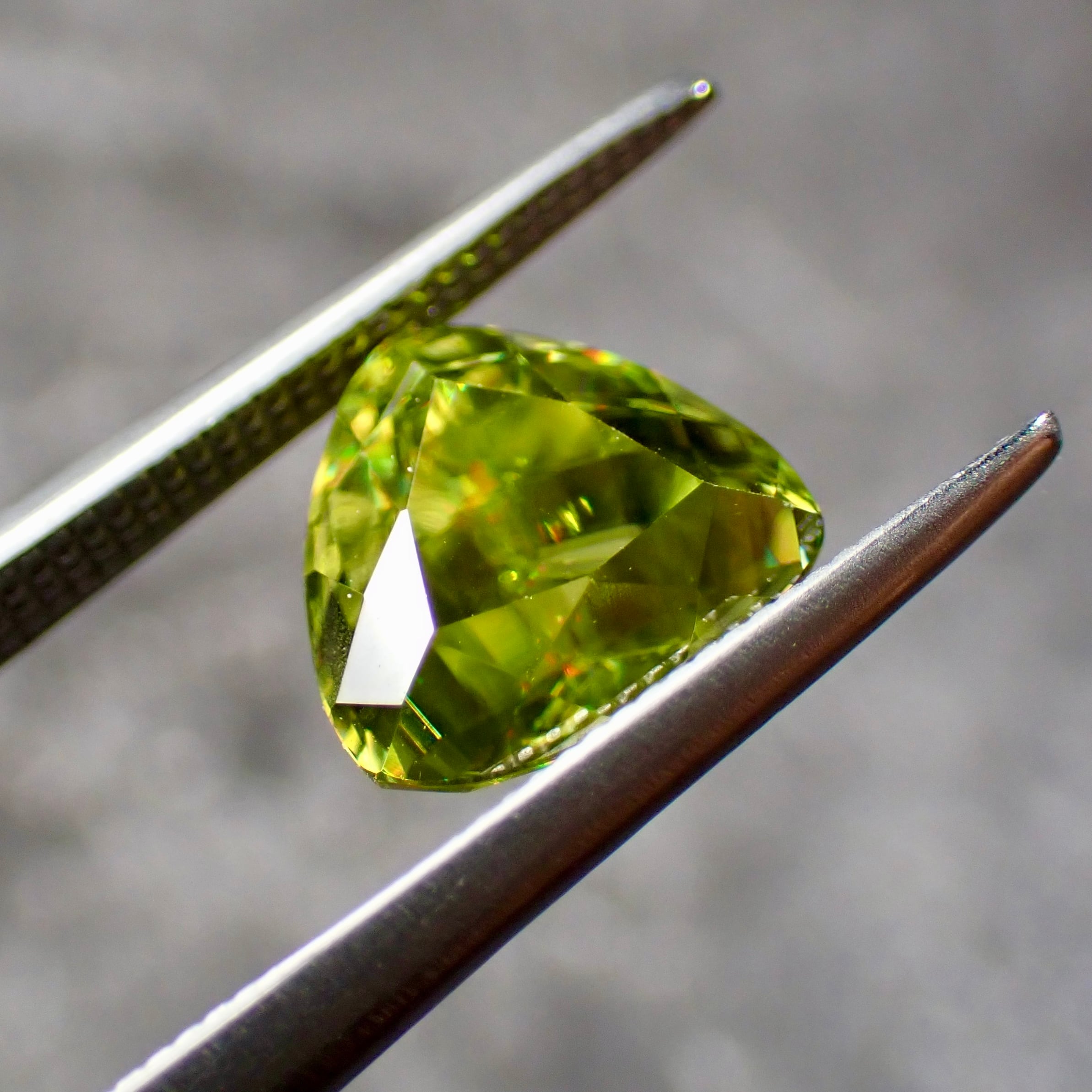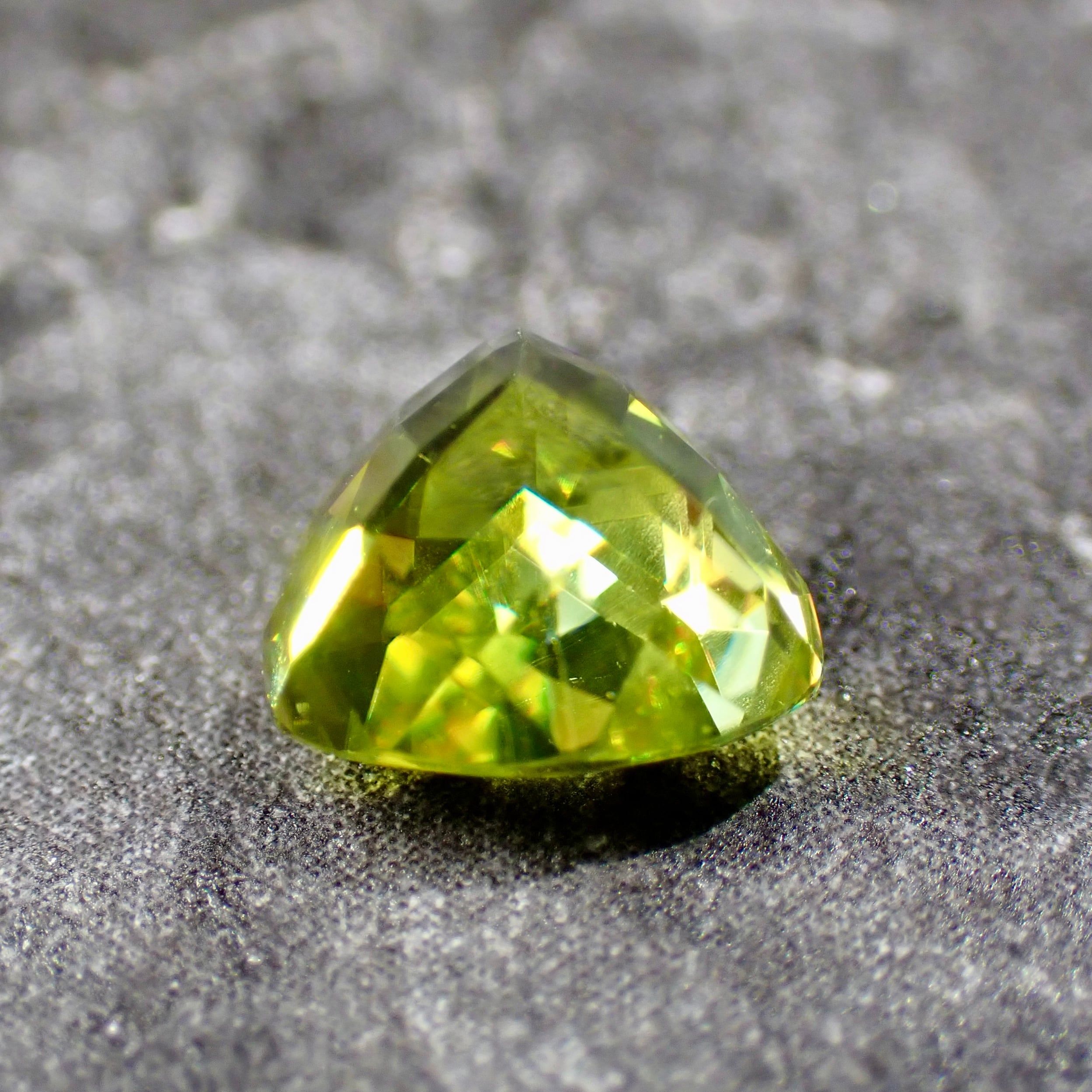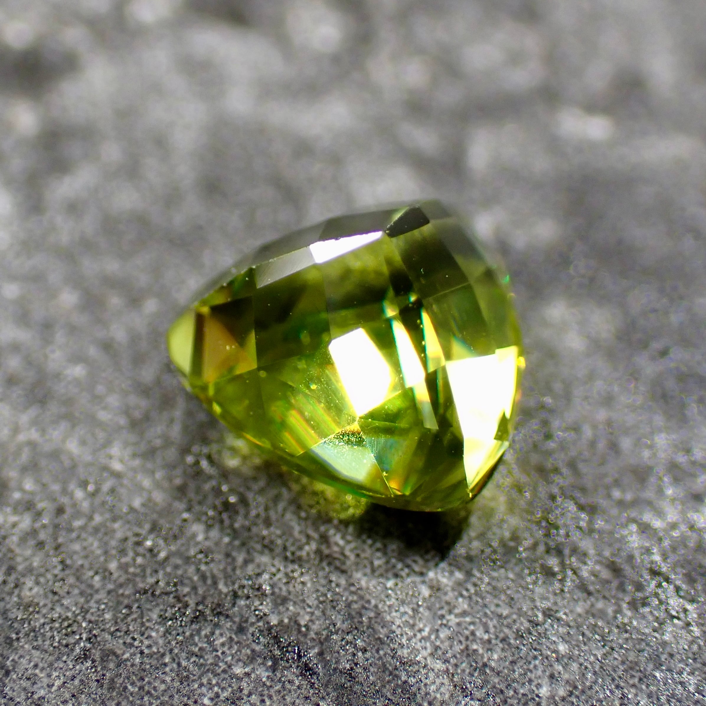 光をスペクトル色にする特徴があり、グリーンの宝石ながら、赤、橙、黄、明るいグリーンと様々な色の輝きを見せます。これはダイヤモンドも持つ「ファイア」という特性なのですが、その屈折率はダイヤモンドをも凌ぎます。
