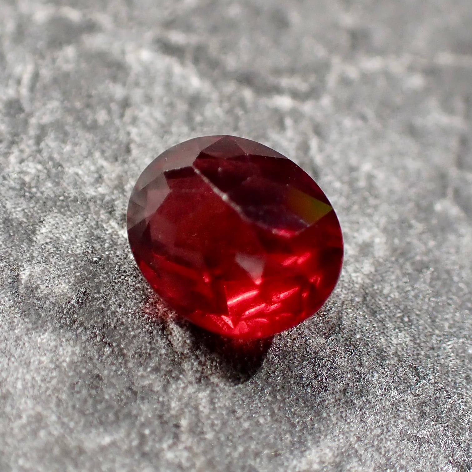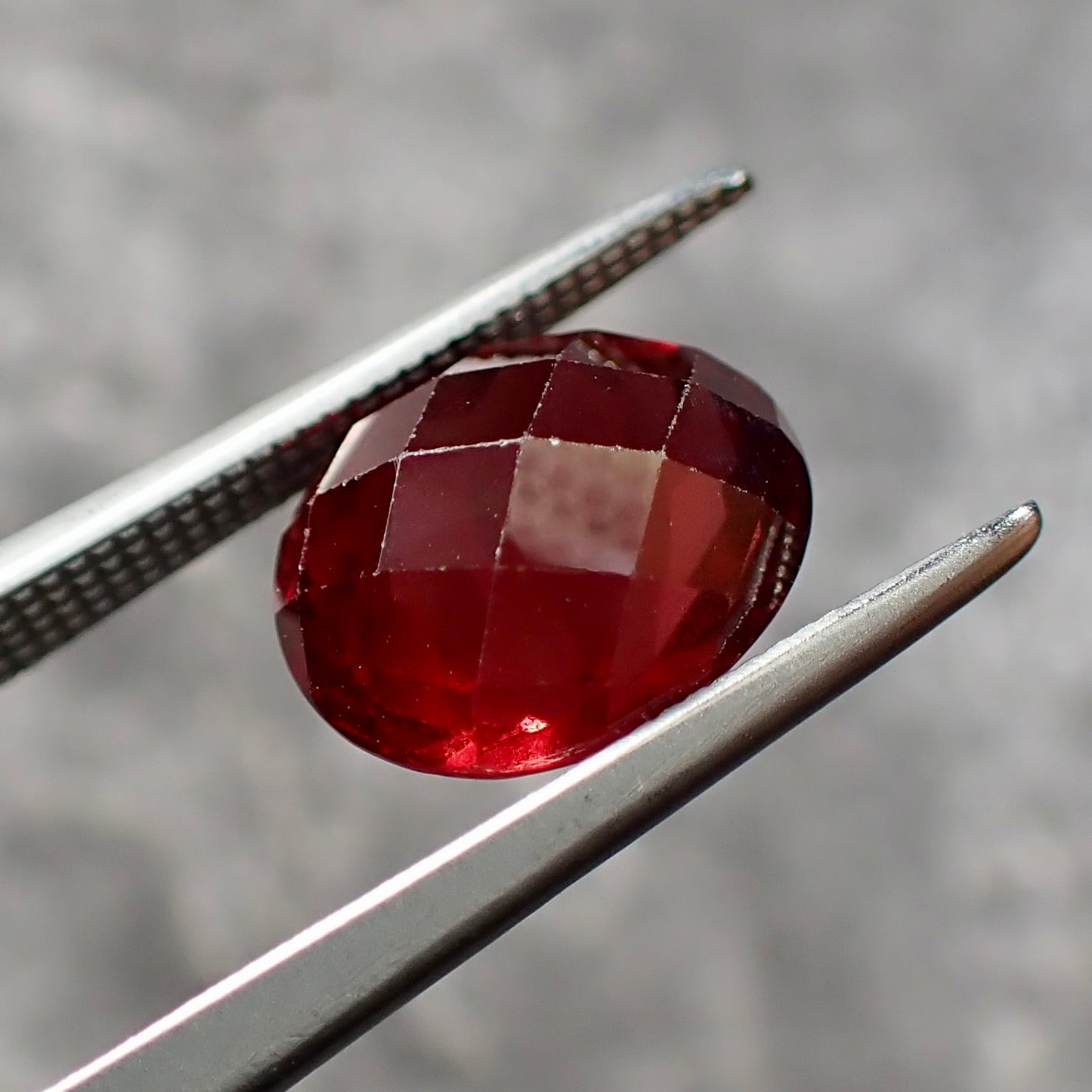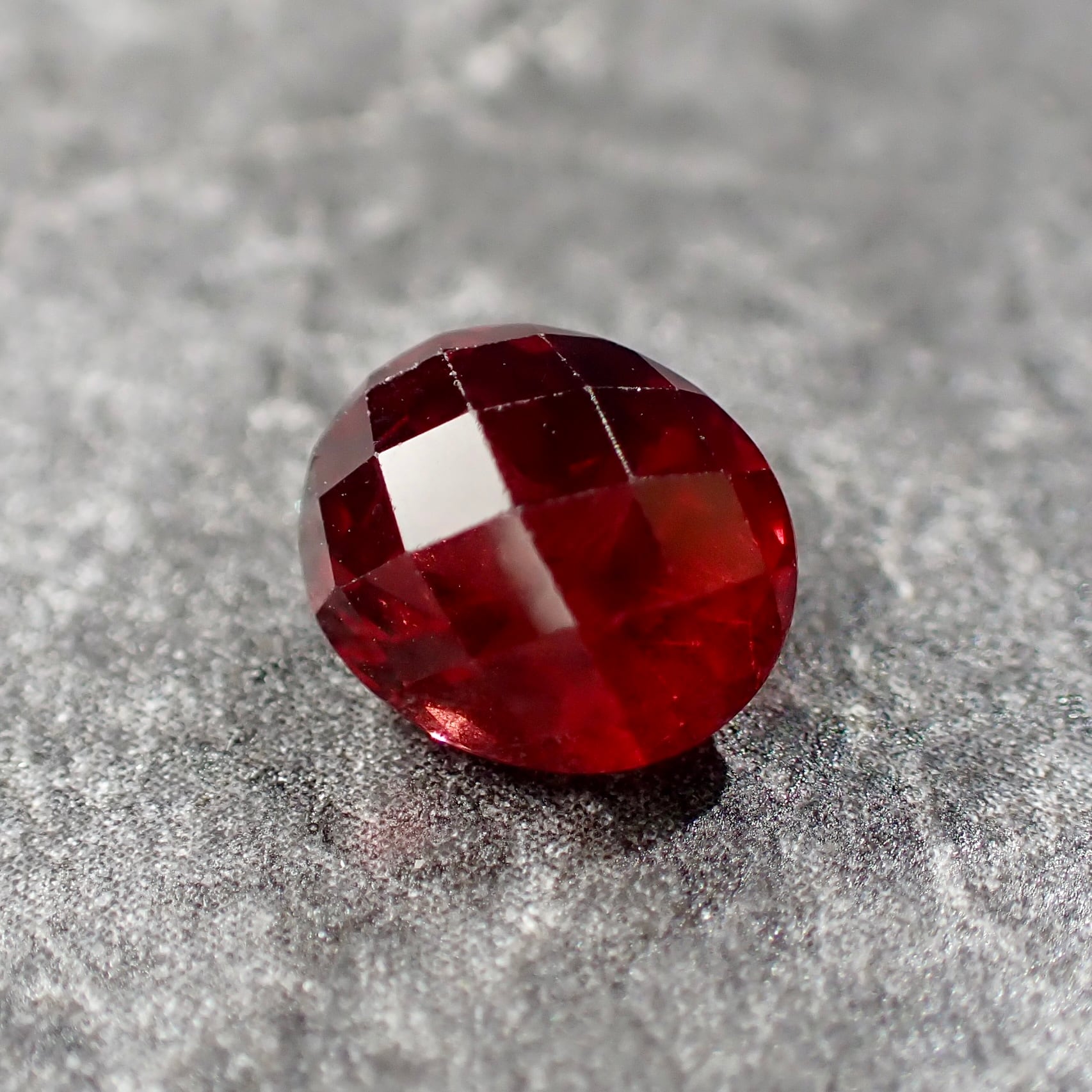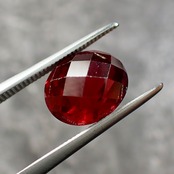 Its orange-tinged red color, visible through the checkerboard cut, is truly beautiful.