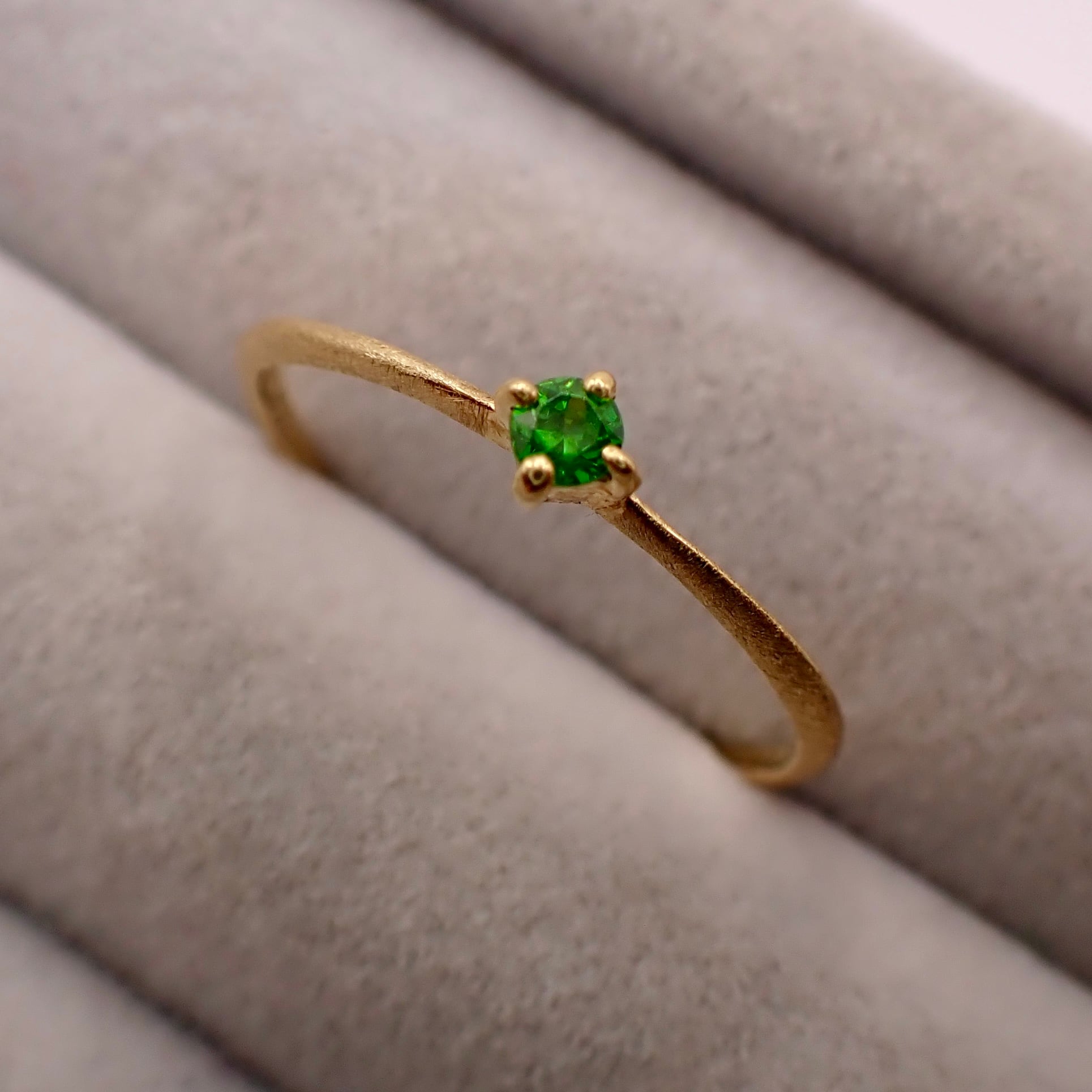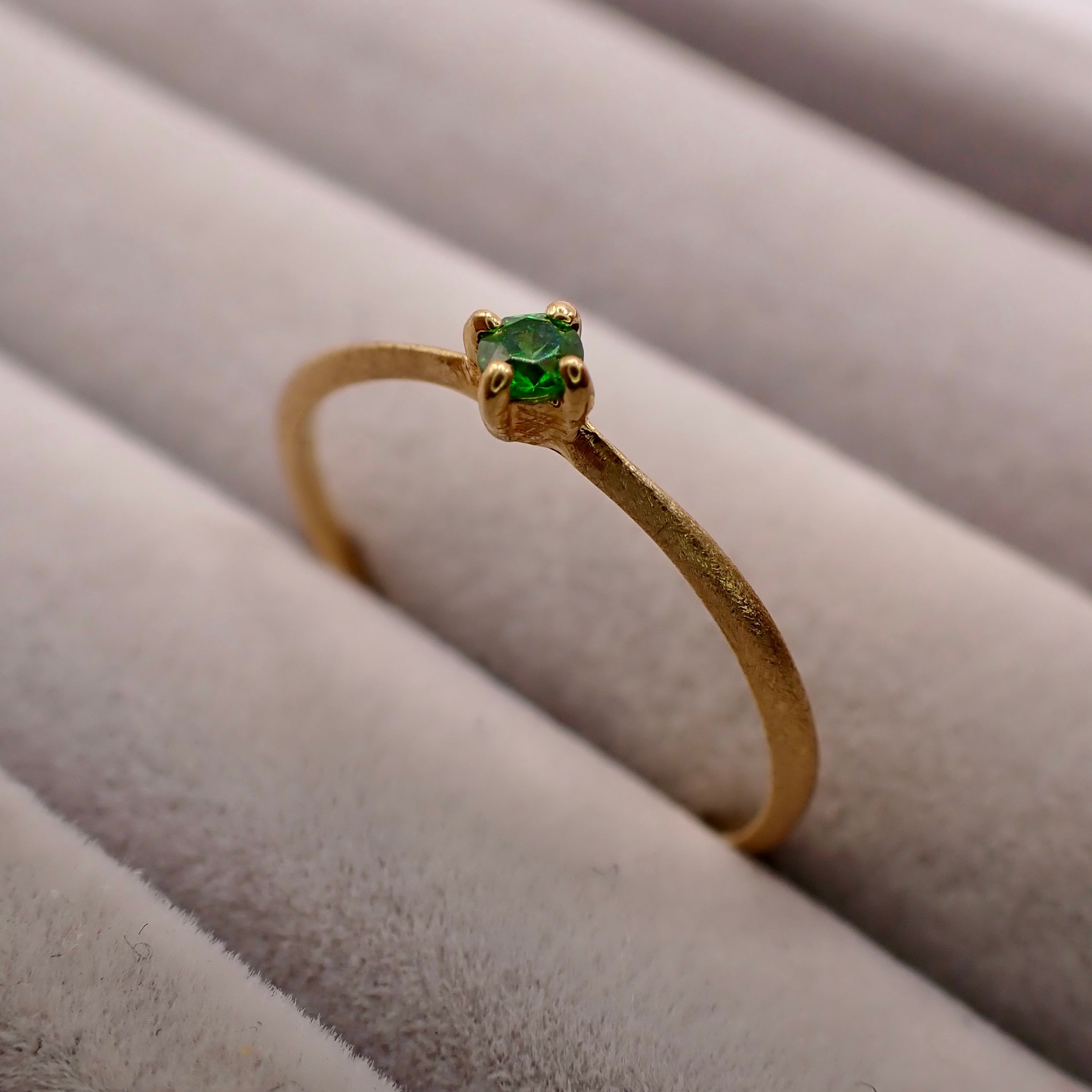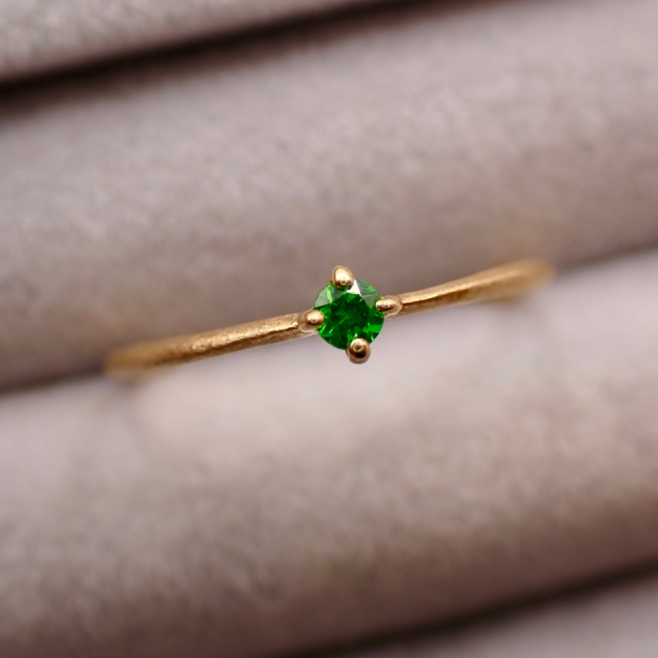 トップカラーのロシア産デマントイドガーネット 直径約2.2mmを一粒使用したリング。石もクオリティ落とさず、ほぼルーペクリーンのものをセレクト。素材のYGとの相性も最高にマッチしています。