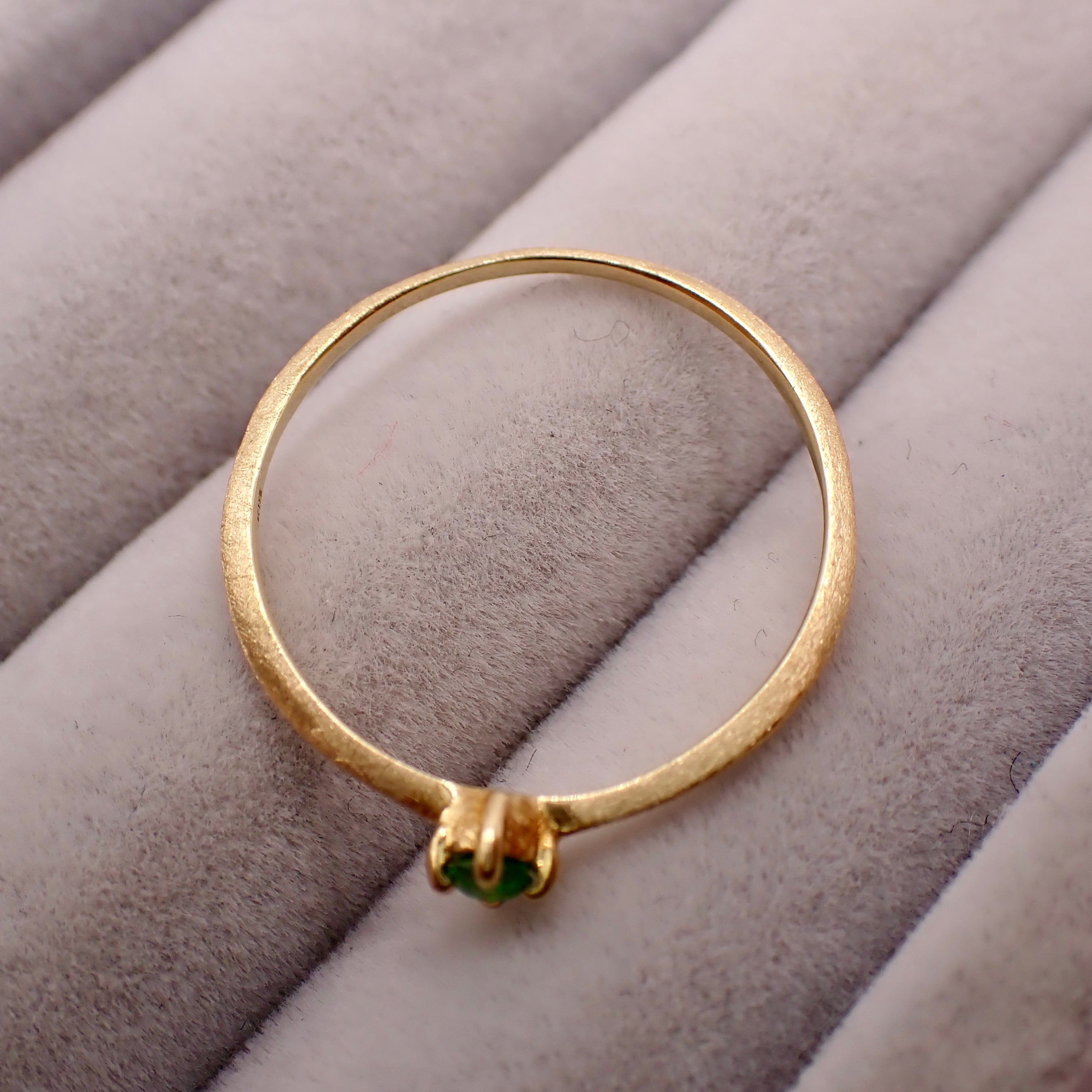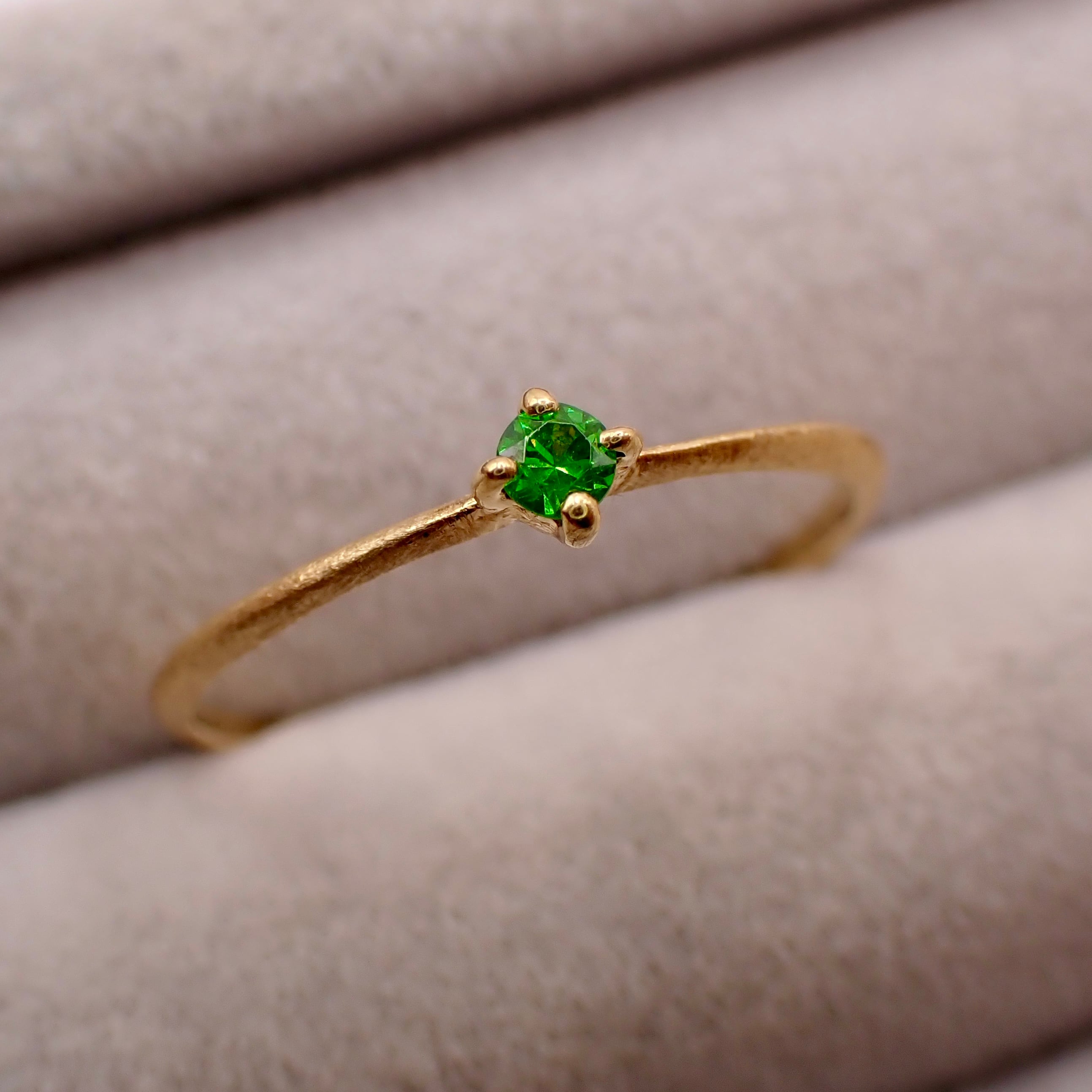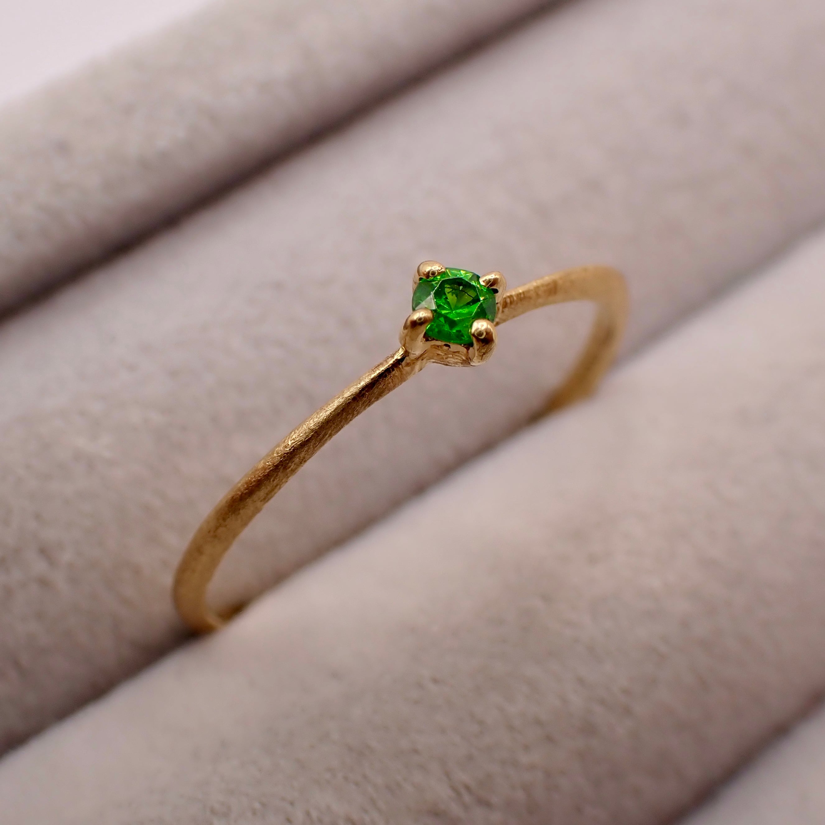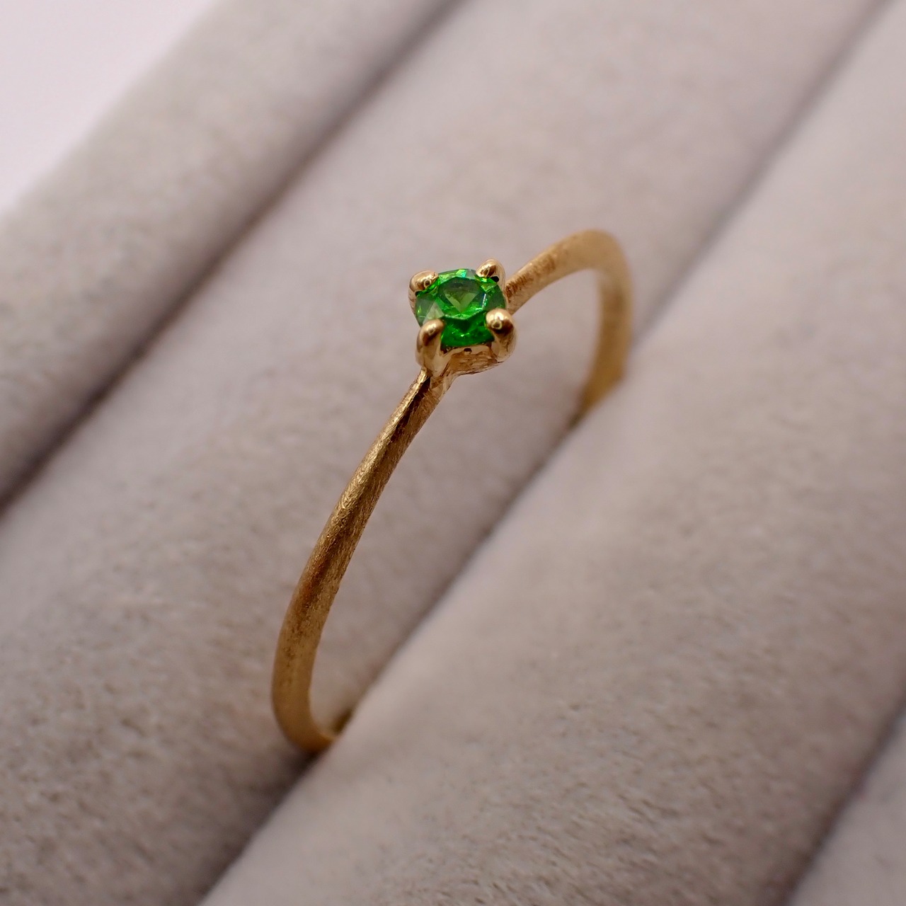 トップカラーのロシア産デマントイドガーネット 直径約2.2mmを一粒使用したリング。石もクオリティ落とさず、ほぼルーペクリーンのものをセレクト。素材のYGとの相性も最高にマッチしています。