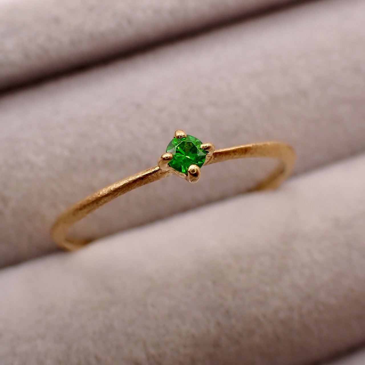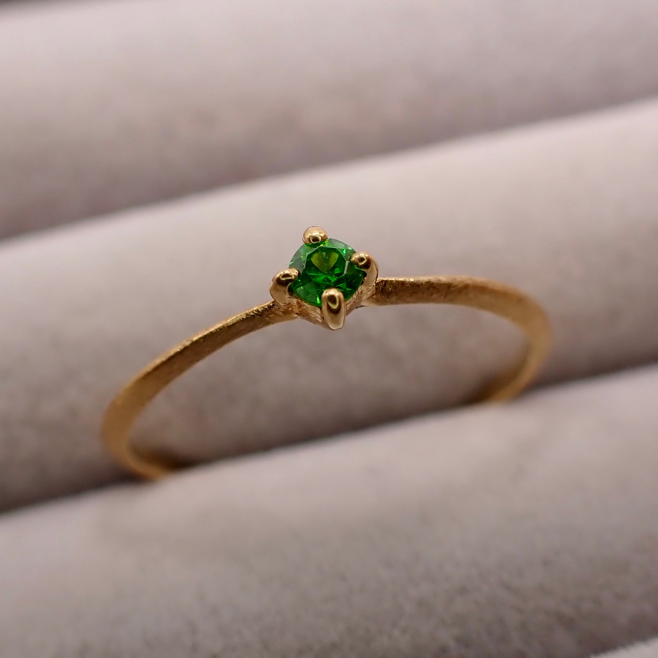 A ring featuring a single top-color Russian demantoid garnet, approximately 2.2mm in diameter. The stone was selected for its near-lupe-clean clarity without compromising quality. It pairs perfectly with the yellow gold setting.