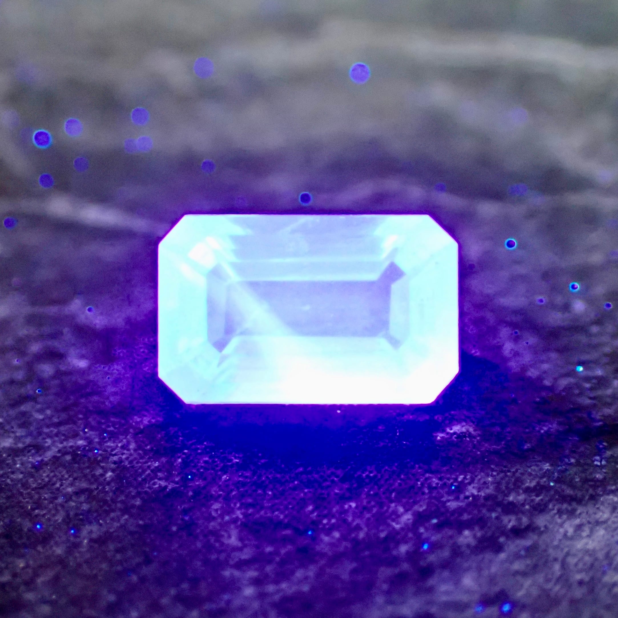 This is a rare, strongly fluorescent specimen from Zimbabwe. It has a mint green, transparent base color, and although the photo appears bright, it fluoresces in silky blue.