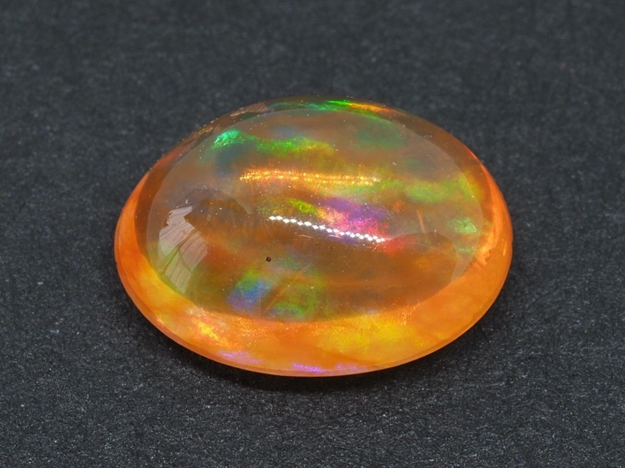 ぷるぷるつやつやのカボションカット、地色はかなりオレンジ、さらにファイアオパールの名にふさわしく炎のような模様が内部に見えます!!!