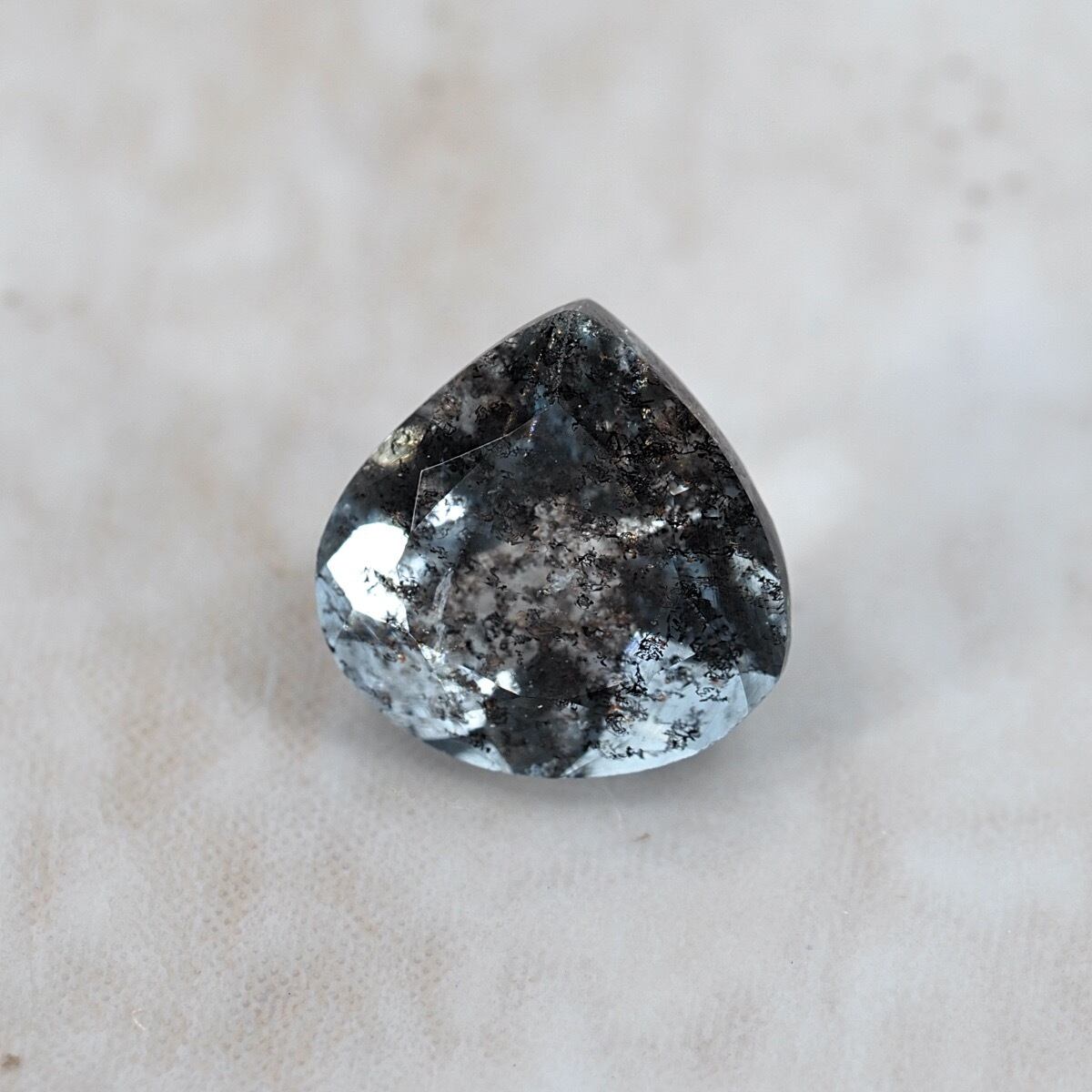 この個体はヘマタイトが共生しており、しかもほぼ全面にびっしりと入っています。一部ではシルバーシラー効果も確認出来ます。このなんとも言えない模様とマロンカットのアンバランスさもまた良いですね!