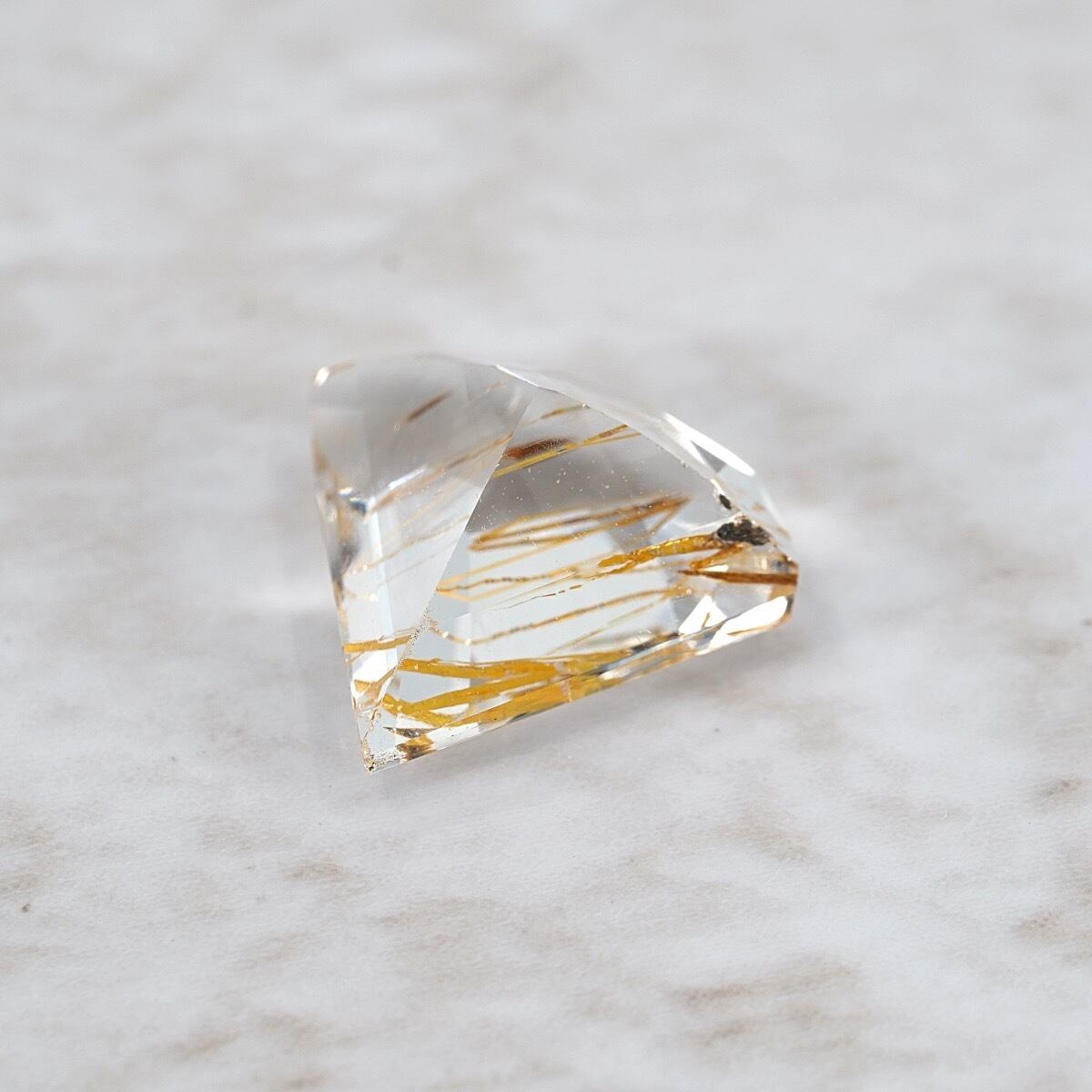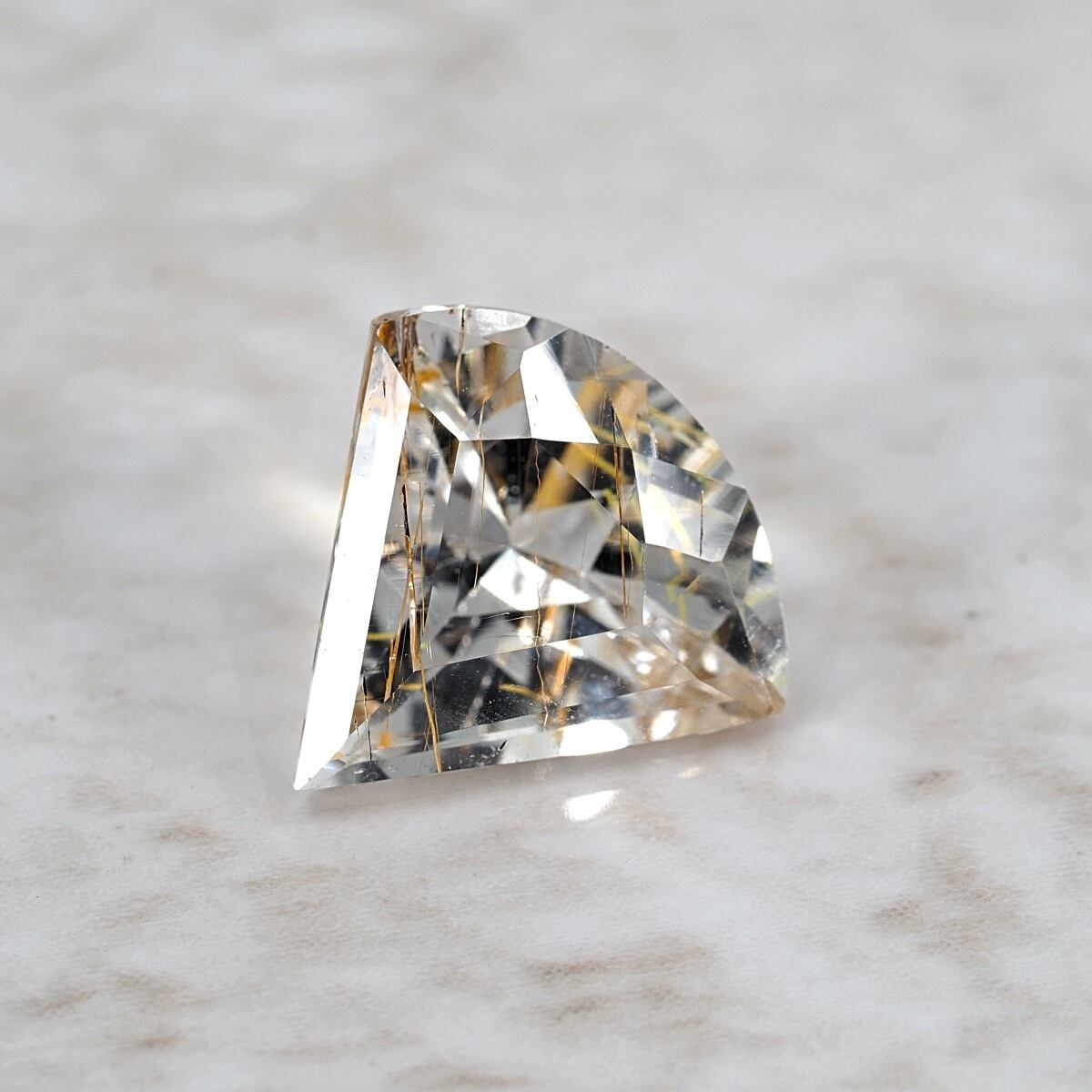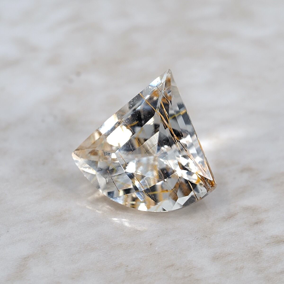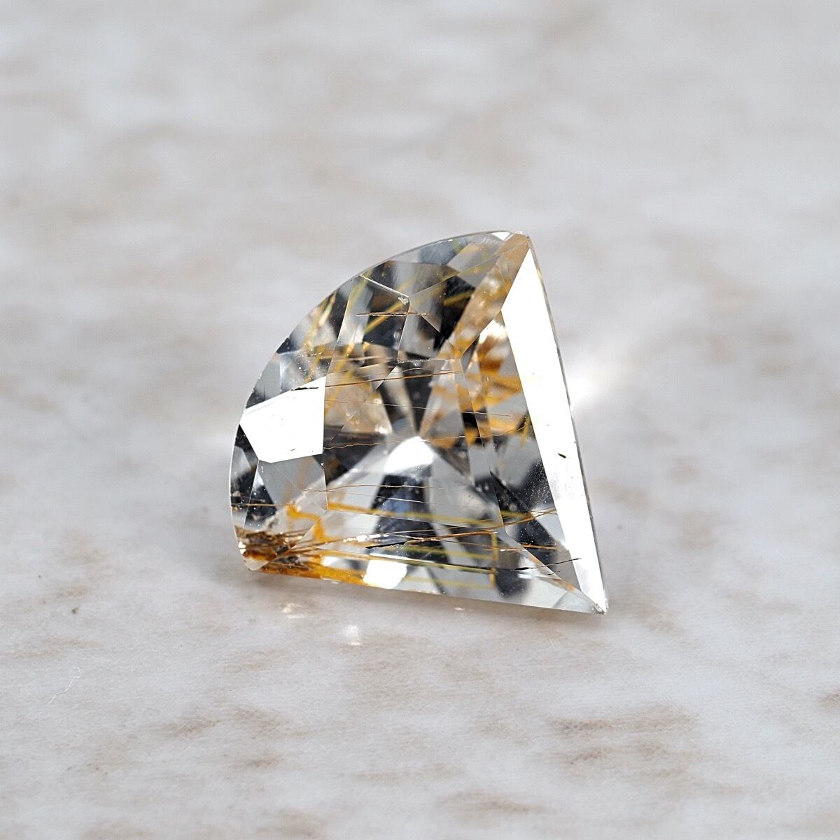 まるで「扇」「かんざし」のような和を思わせる特殊形状、しかもクォーツ(水晶)ではなくトパーズのルチル入りという希少で面白い一石です。ルーペで覗いたとき、黄金の針が透明な水の中に漂うような、そんな幻想的な光景が広がります。加えてルチルの位置もまばらで様々な角度で楽しむことが出来るのも良きですね。