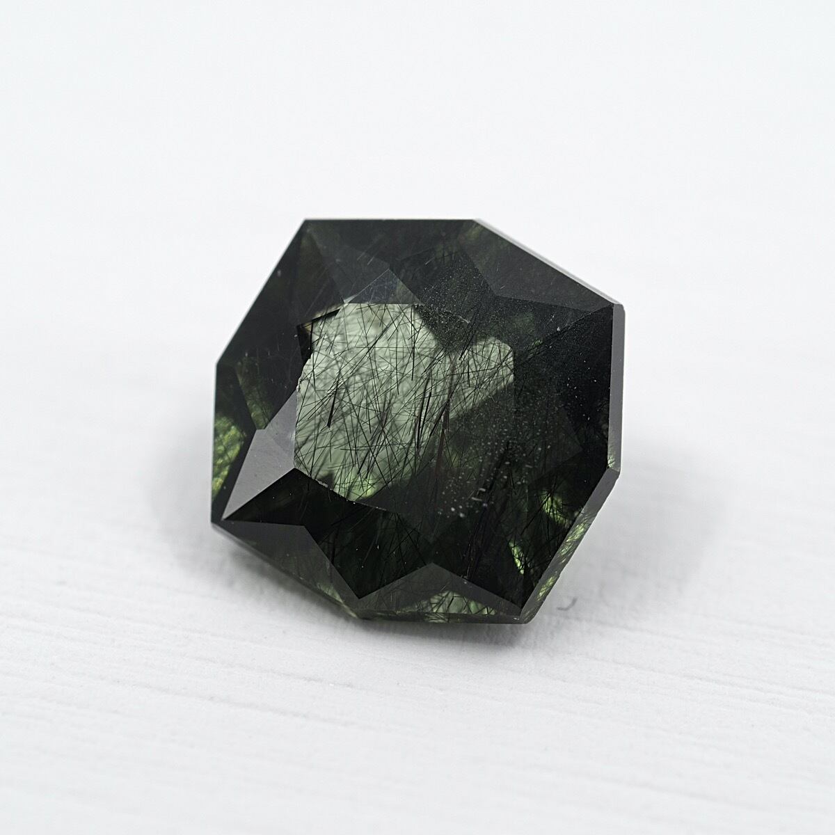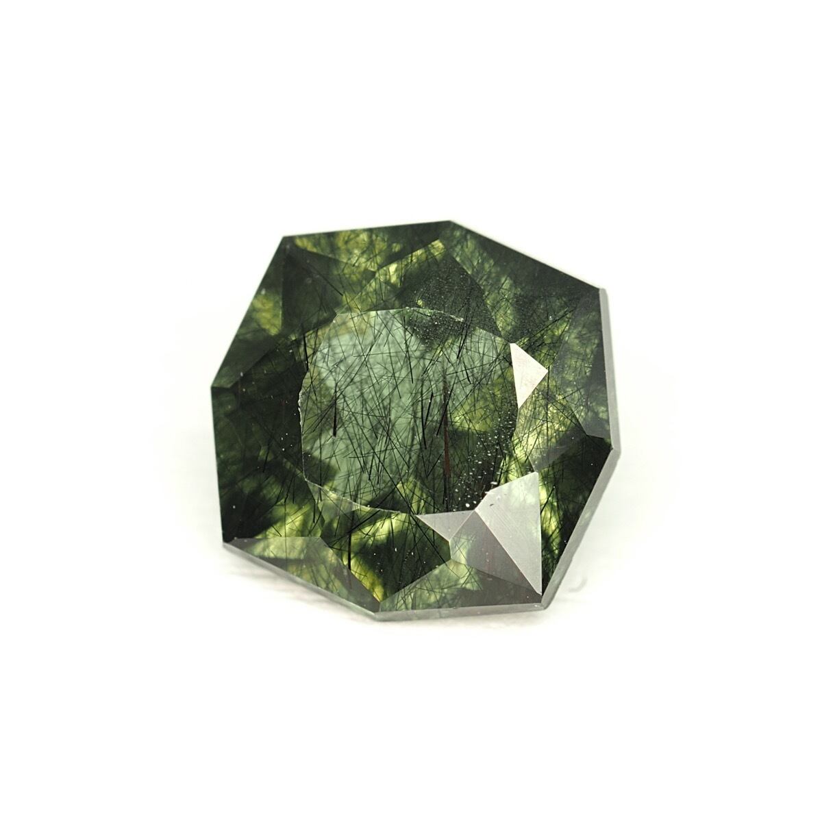 ルドウィジャイトインペリドット(別名ルードヴィッヒアイトインペリドット)は、ペリドットの内部に針状のルドウィジャイトが内包された珍しいペリドットです、黒く細い針上インクルージョンが全体的に入っている様が確認できます。多角形でエッジの効いたシェイプがクールですね!
