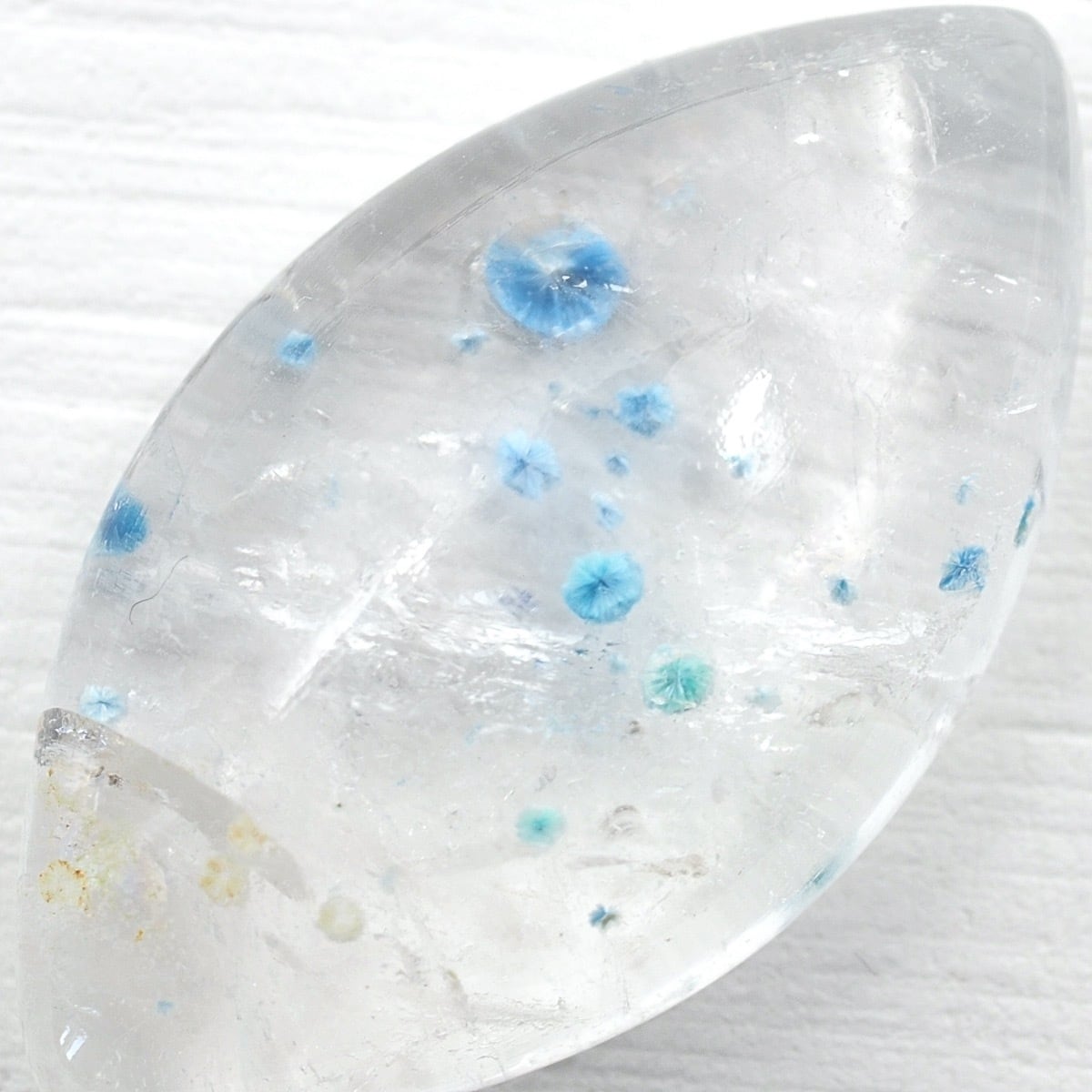 水晶の中にギラライトという鉱物が内包されたもので、内包物であるギラライトの青色がパライバトルマリンと同じカラーであることから、「パライバクォーツ」の名前で呼ばれます。
