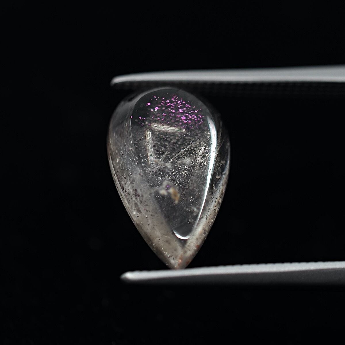 結晶の内部で、ラメのようなピンクの煌めきを放つクォーツです。光の輝きが、妖精「ティンカーベル」が撒く粉に似ていることから名付けられたと考えられています。横から見ると台形のようになっている少し変わったカット形状です。角度によっても違いますが各所にラメが集中している感じの個体ですね。