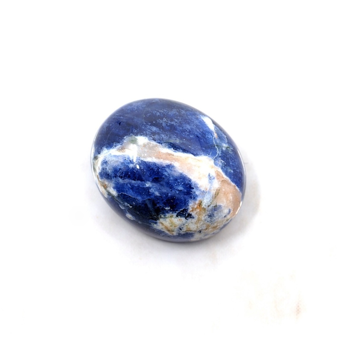 ナトリウム成分(Na)が多く含まれていることから、ナトリウム(Soda=ソーダ)を多く含む石(lithos)という意味で名付けられています。宝石質のものはかなり希少で、こういった不透明のものがほとんどです。しかしブルーの鮮やかな色合いはこちらに軍配が上がりますね!また柄も洒落てます。