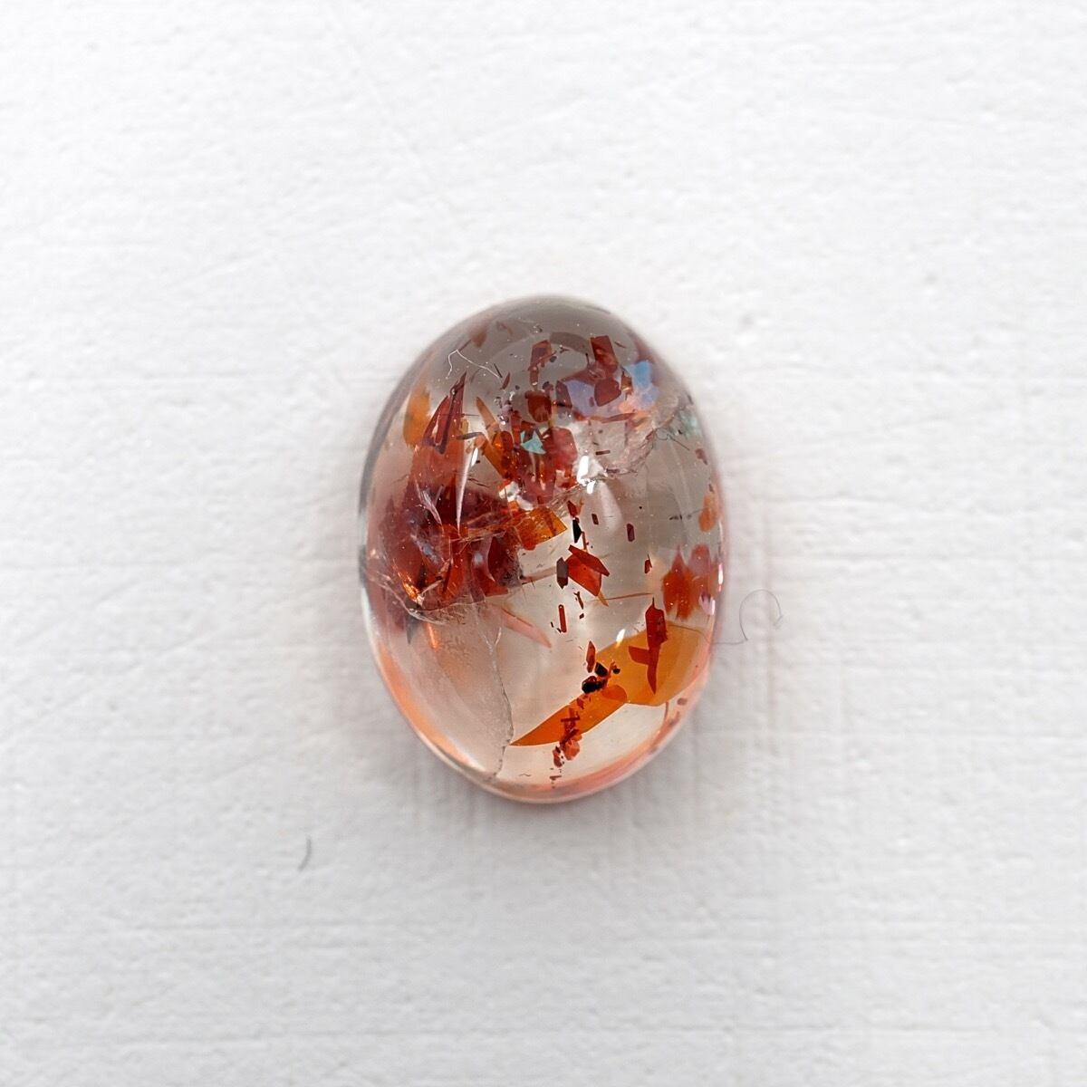 別名:太陽の石、確かにそれもありますがこの子はまるで金魚ですね。内部でクラックが斜めに走っていますが、そこからの虹の煌めきがとっても綺麗な子でもあります。