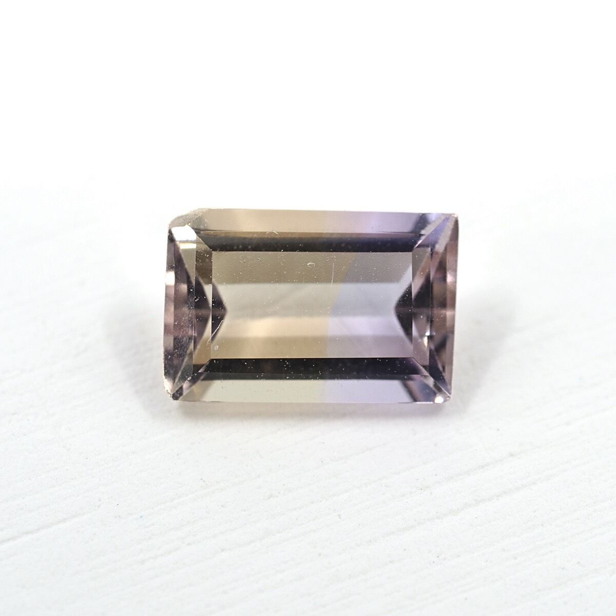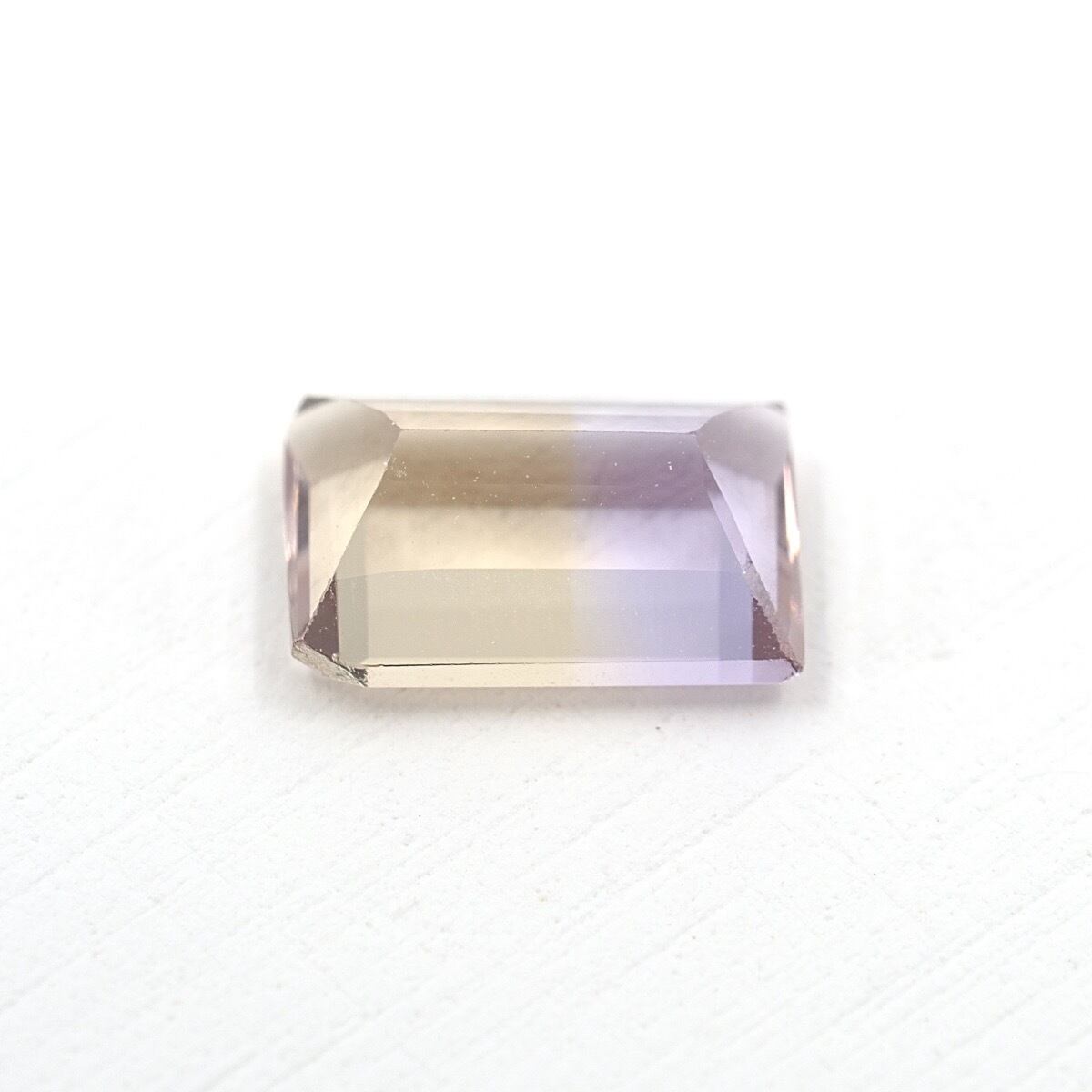 アメトリンは、アメジストとシトリンが共生した結晶です。こちらはカラーは淡めですが割としっかり色合いがわかる子です。角の一部にカケ有り。