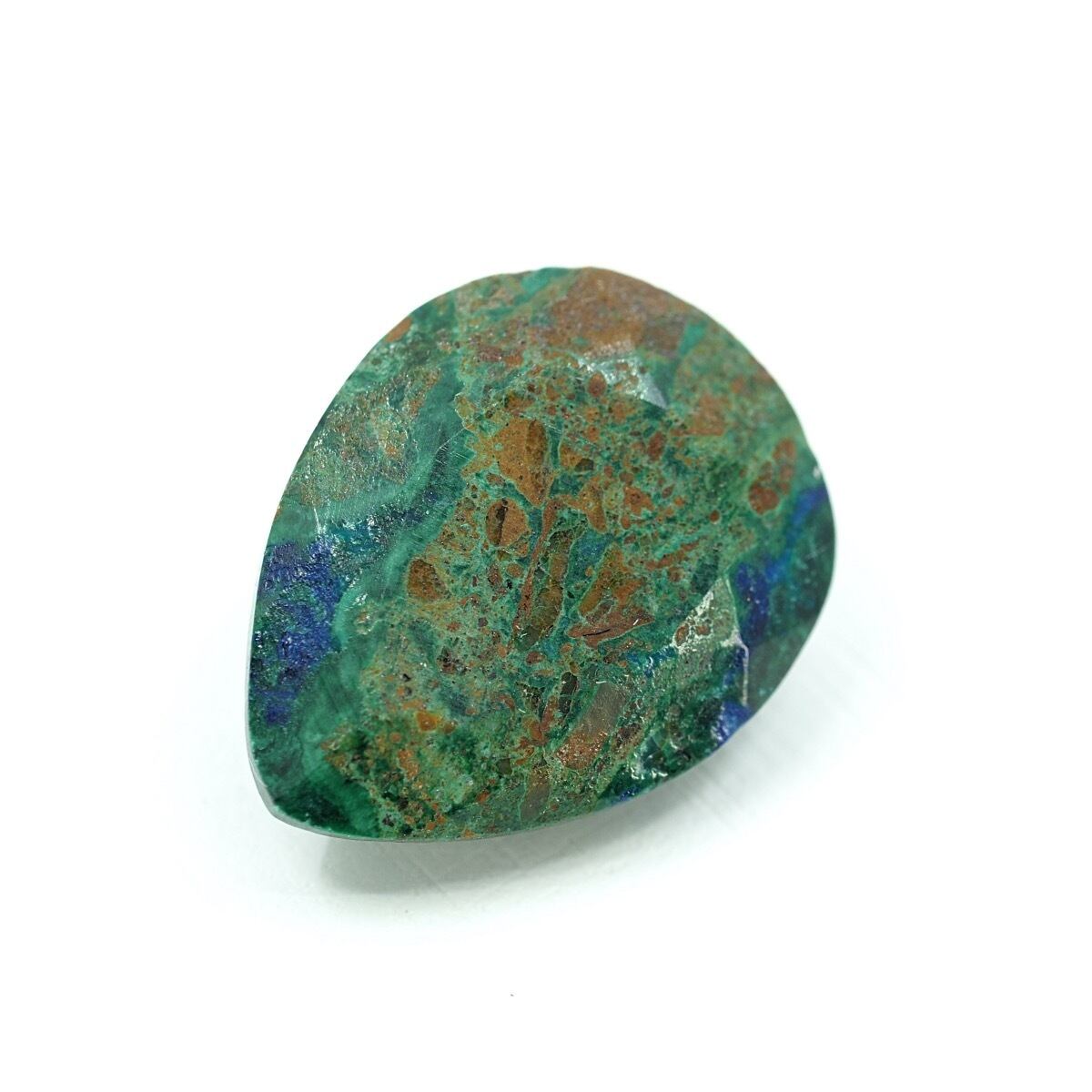 和名は孔雀石(くじゃくせき)本当に孔雀の羽のように青と緑をメインとし、他にも色々な色合いが混じる面白い子です。ファセットカットされているところも珍しいですね!