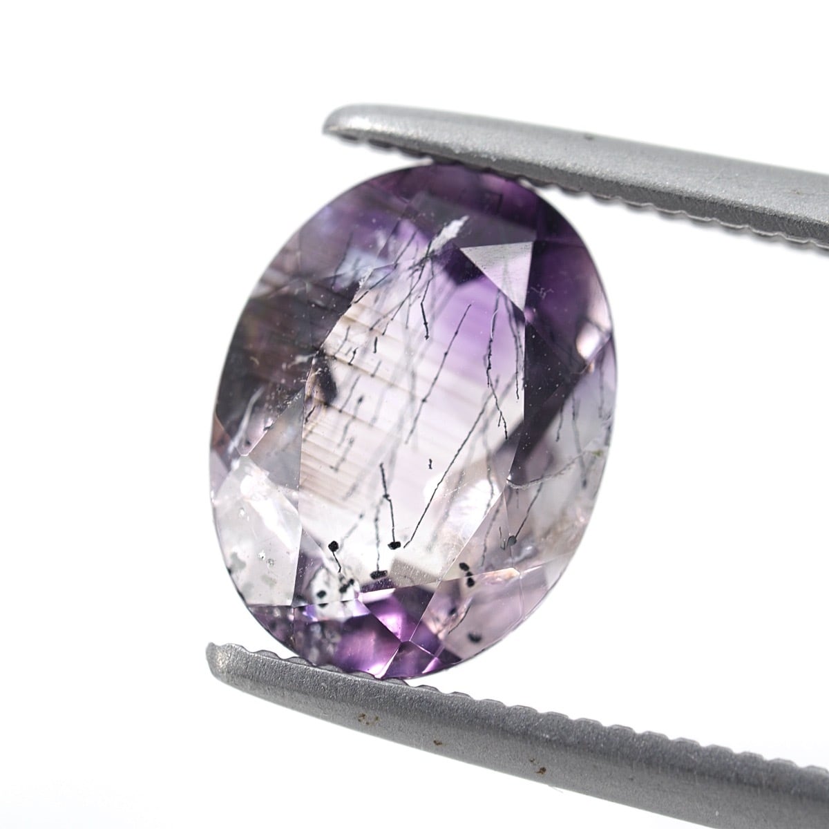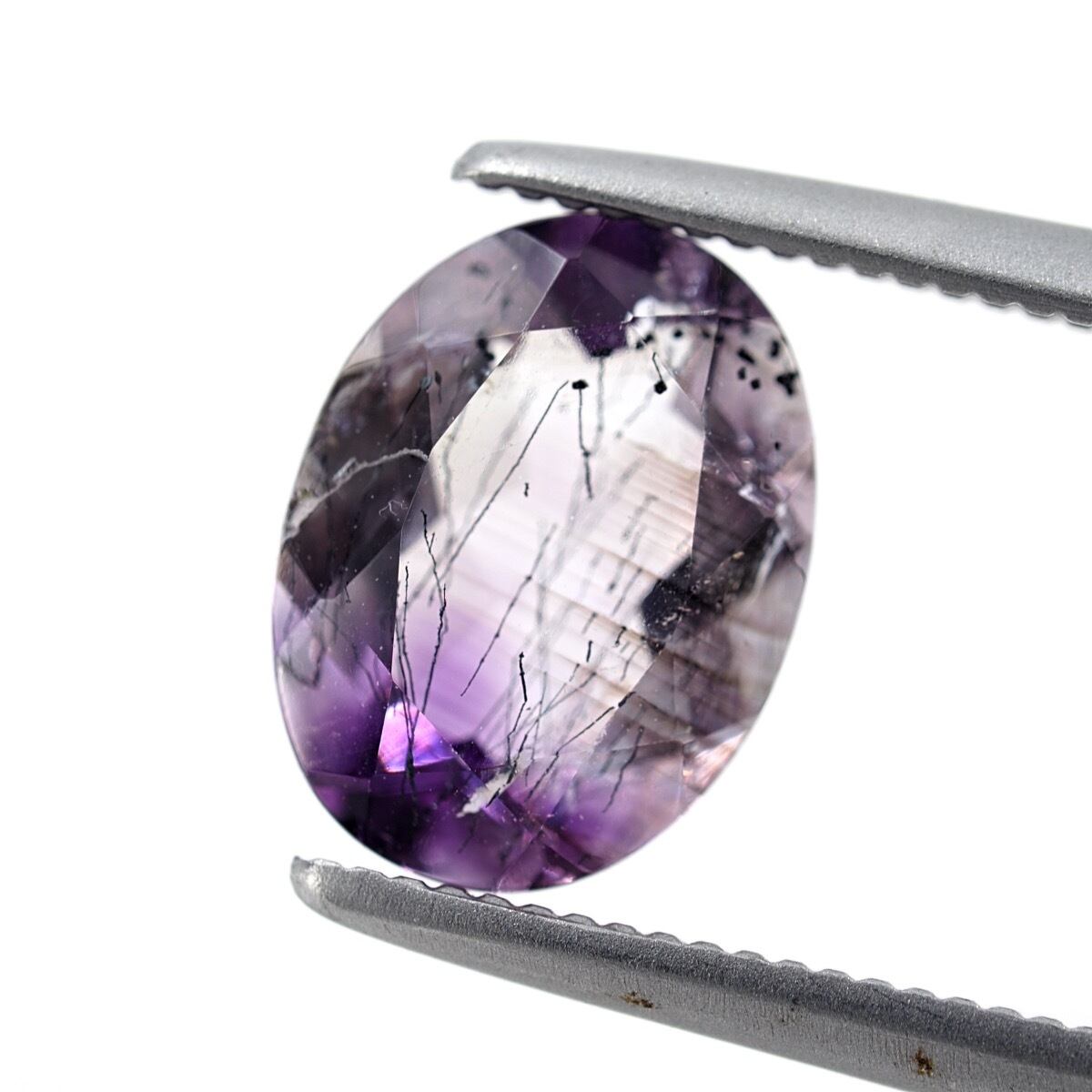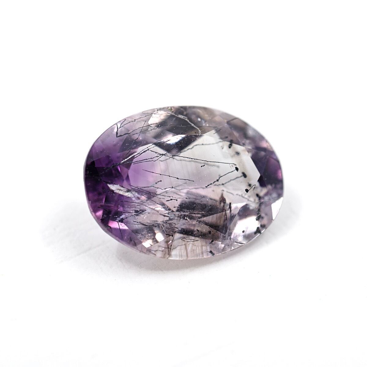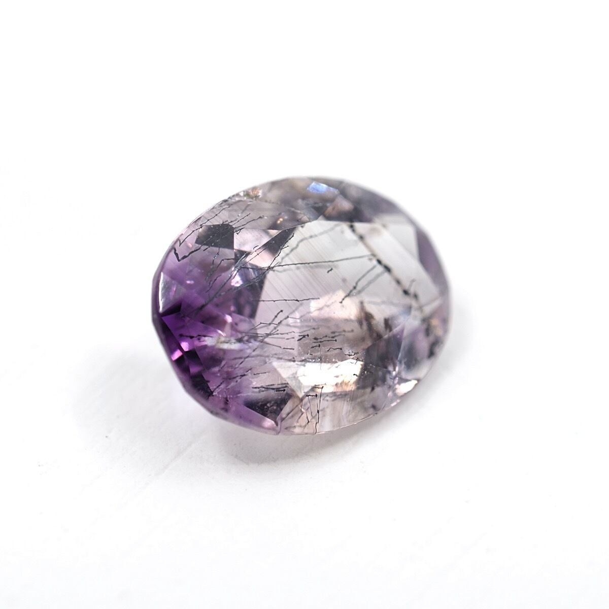 微かな針状のゲーサイトインクルージョンが内包されており、バイカラーのアメジストと相まって非常に雰囲気あるピースとなっていますね。バイカラーもはっきりとしていない境目が淡くなるタイプなのでベストマッチな組み合わせじゃないでしょうか、テリもかなり強いです。