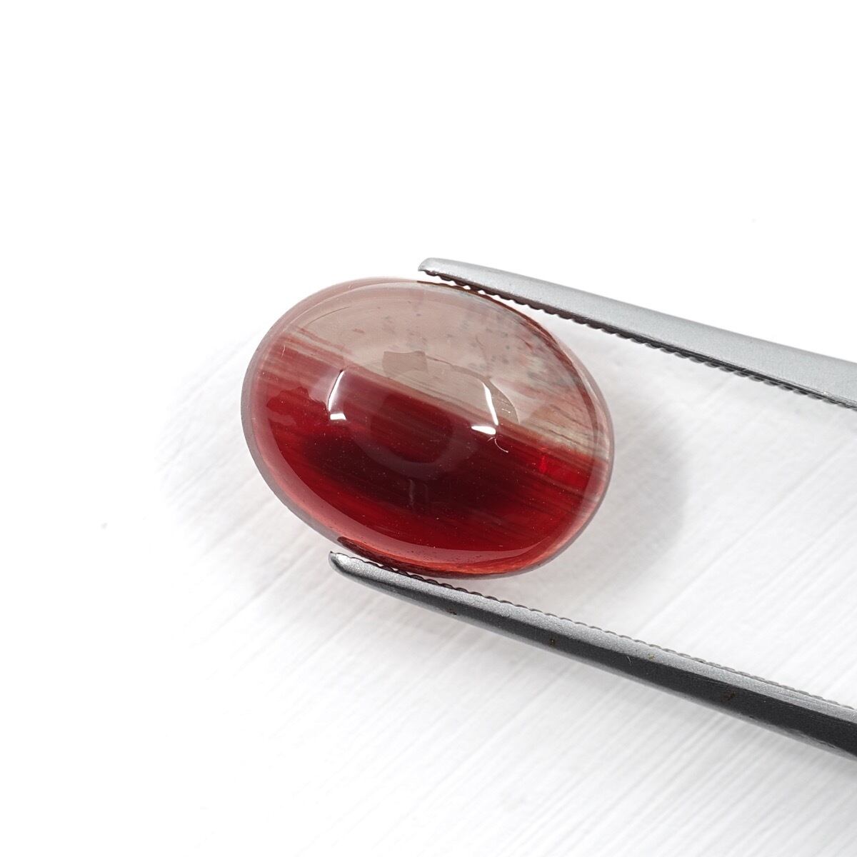 朱色を溶かしたような艶やかなダークレッドと、かなりライトなクリアグリーンのバイカラー個体。6:4ぐらいでくっきりと境目がわかる分かれ方ですね。色の表現方法としてカボションカットになるべくしてなったであろう一石です。