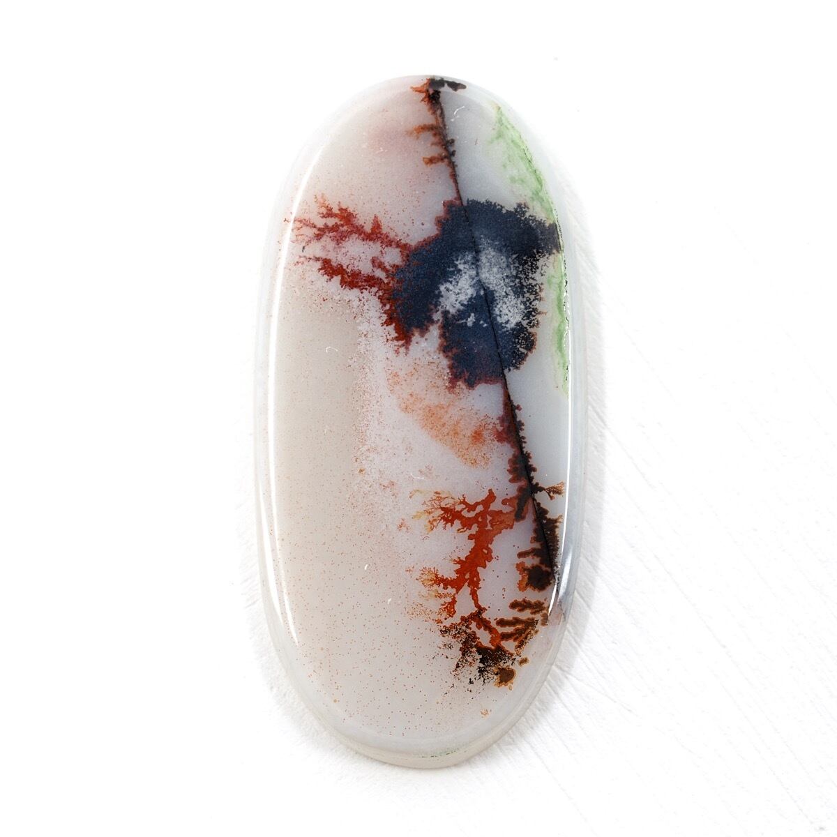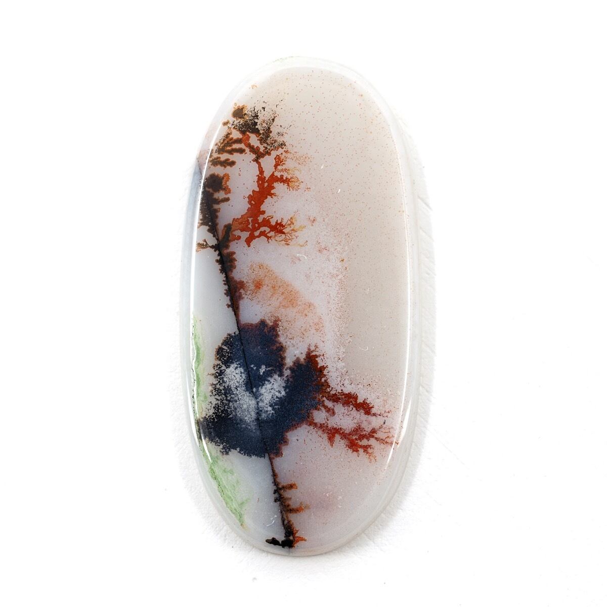 モスアゲートの一種で、アゲートやカルセドニーなどの亀裂に浸透した水に含まれていた鉄やマンガン等の金属イオンが再結晶して樹枝状の模様になったものだそうです。よく見られる黒色の樹枝状の模様はマンガンに起因し、褐色や黄色系は鉄に起因するそうです。