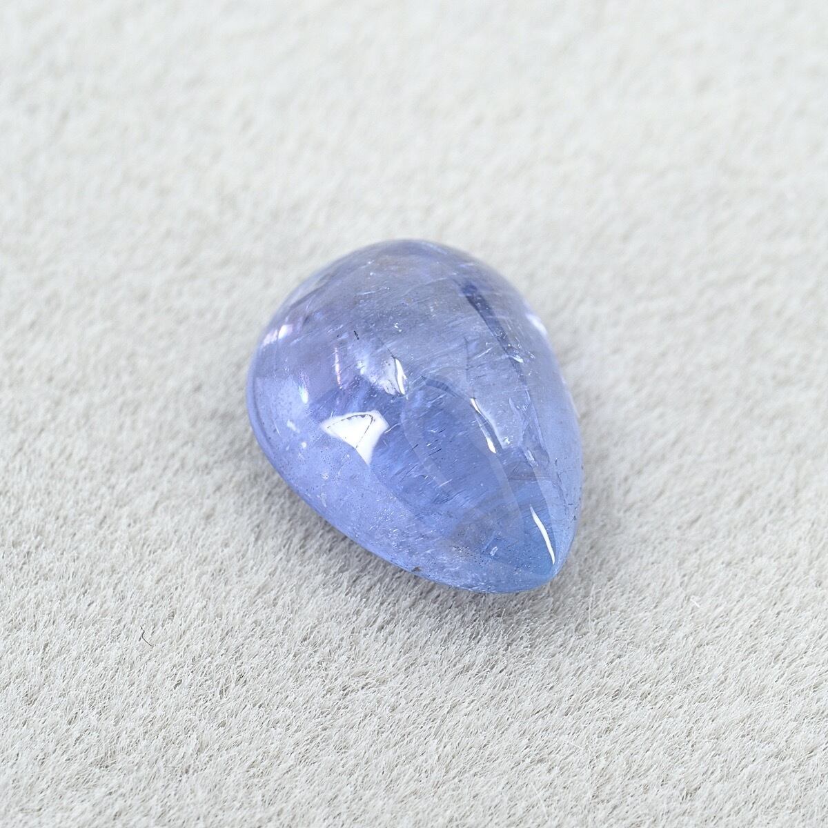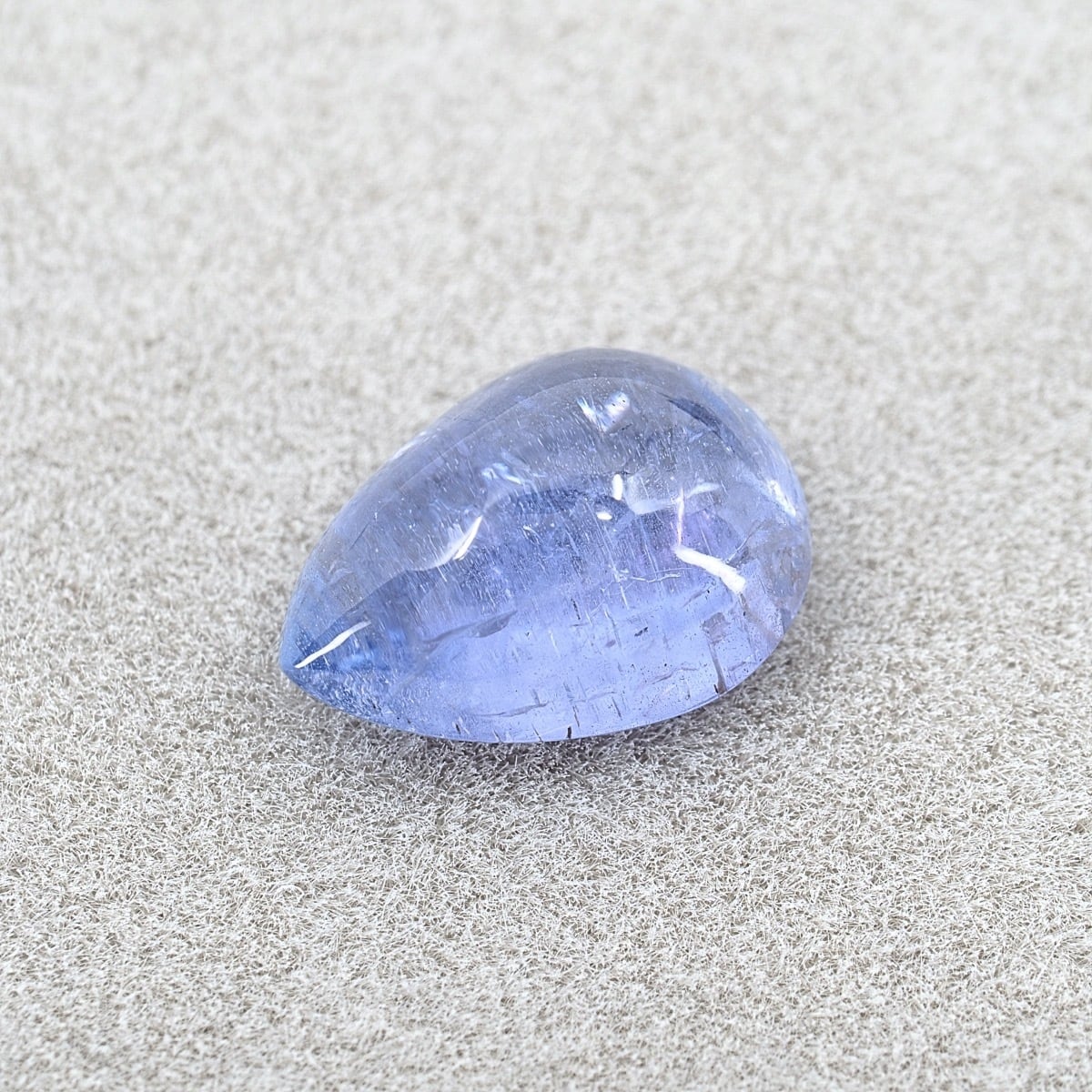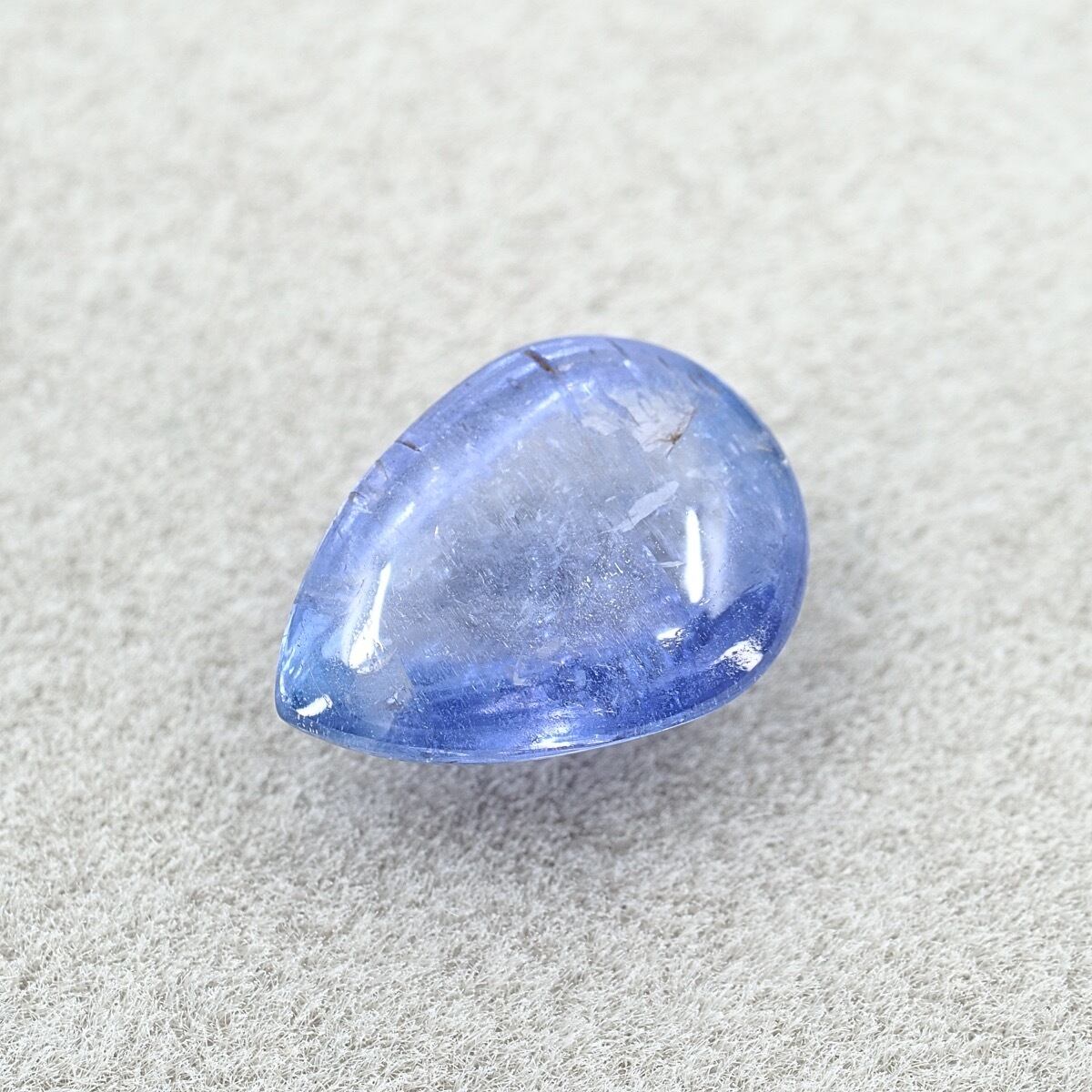 ぷるっとツヤありのペアシェイプカボションのタンザナイト。パープリッシュなライトブルーの優しい色合いです。角度によって濃淡と、ラメのようなギラギラな煌きも見えて一度で何度も楽しめる一石ですね。