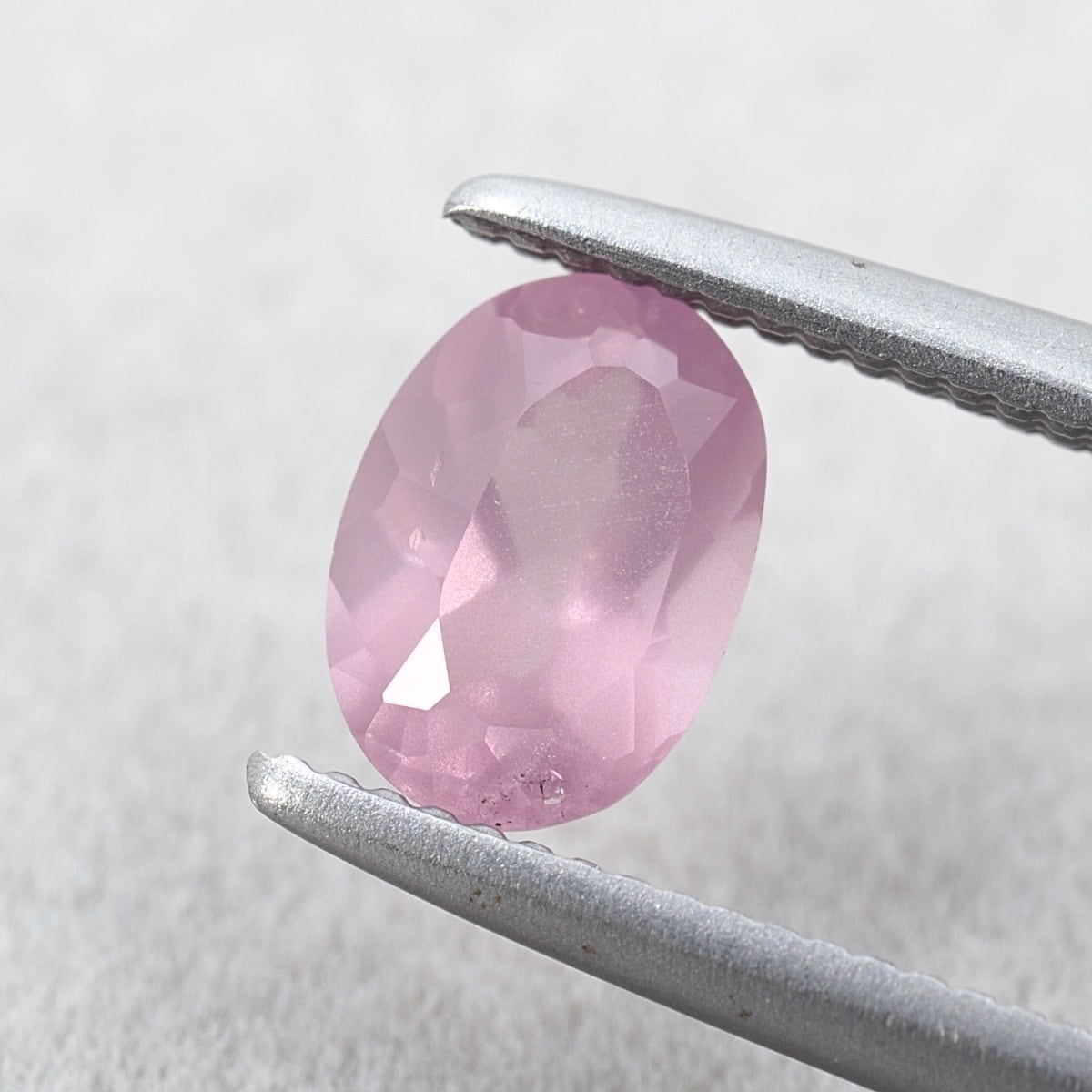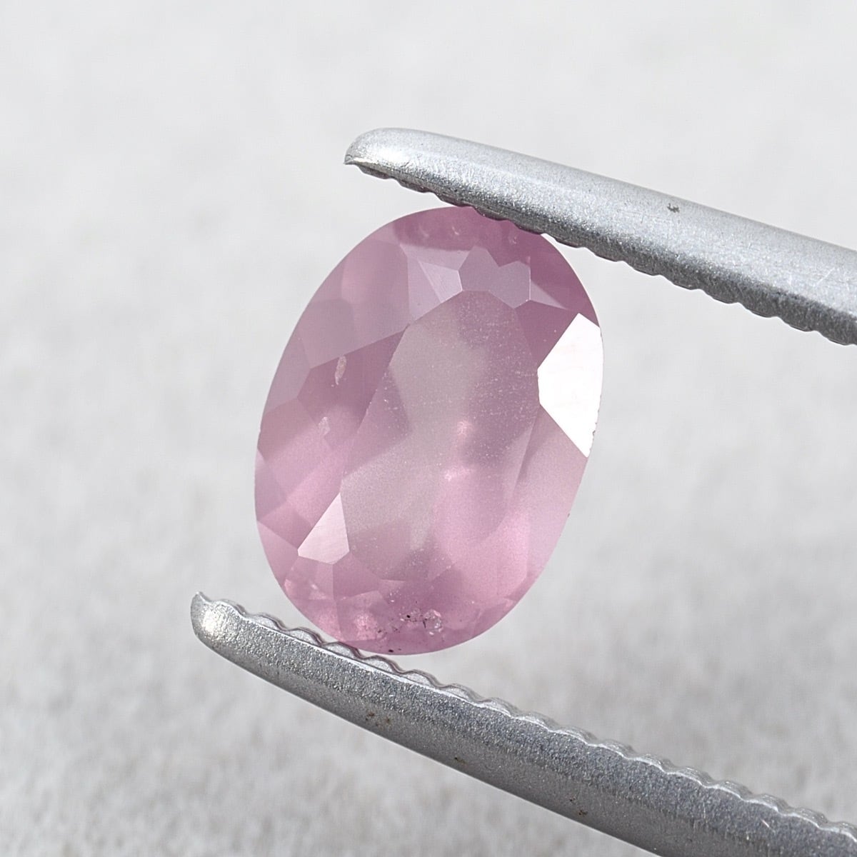8月の誕生石であるスピネル。こちらはまるで桜の花びらのようなふわっとした、とっても優しい淡ピンクカラーです。中央付近が特に霧がかったような強いシルキーの風合いが見られますね。