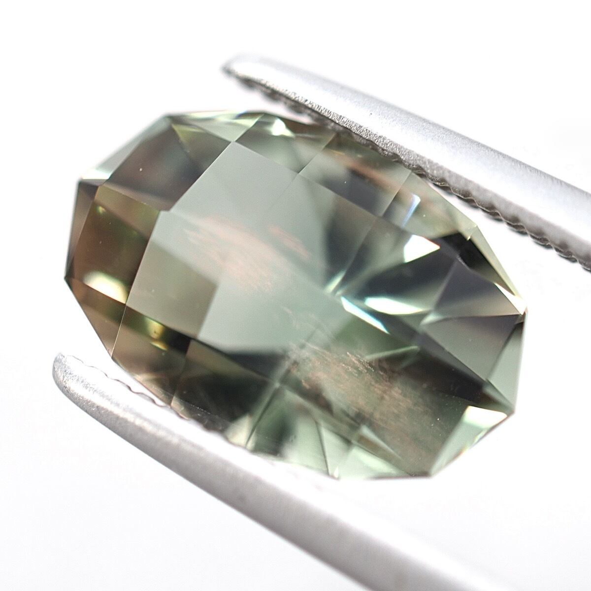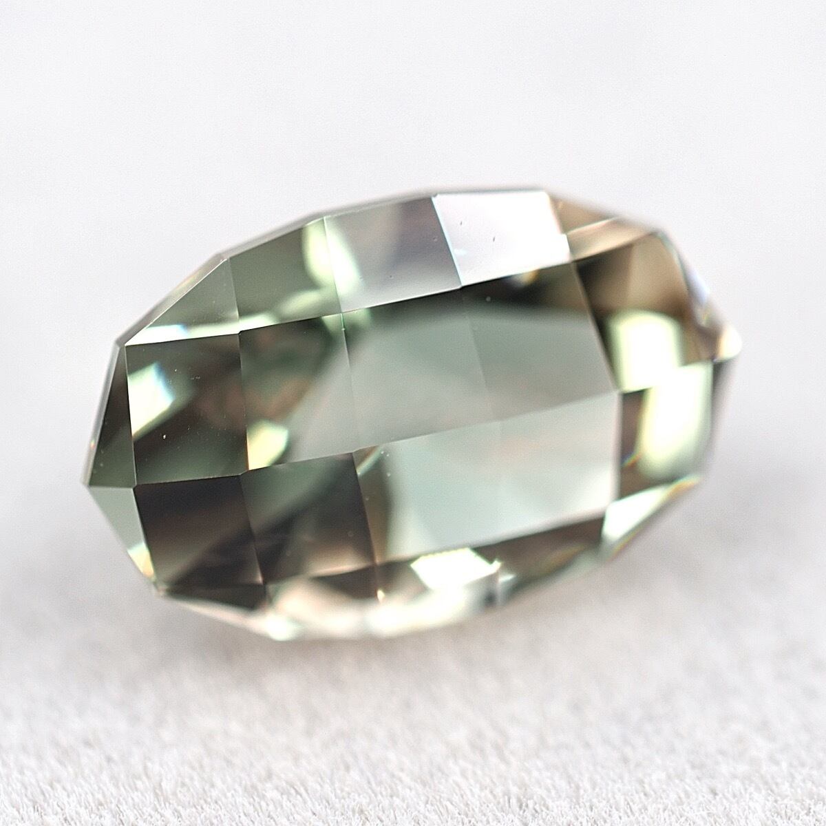 今回はスペシャルな個体の登場!全体の7割にも及ぶグリーン入りで内部に星屑のようなシラーも内包されるバイカラー、外周十四角の多角形でさらにチェッカー仕上げのカッティング、キャラアップサイズでルーペクリーン品質と、特選要素を多数兼ね備えた逸品です。