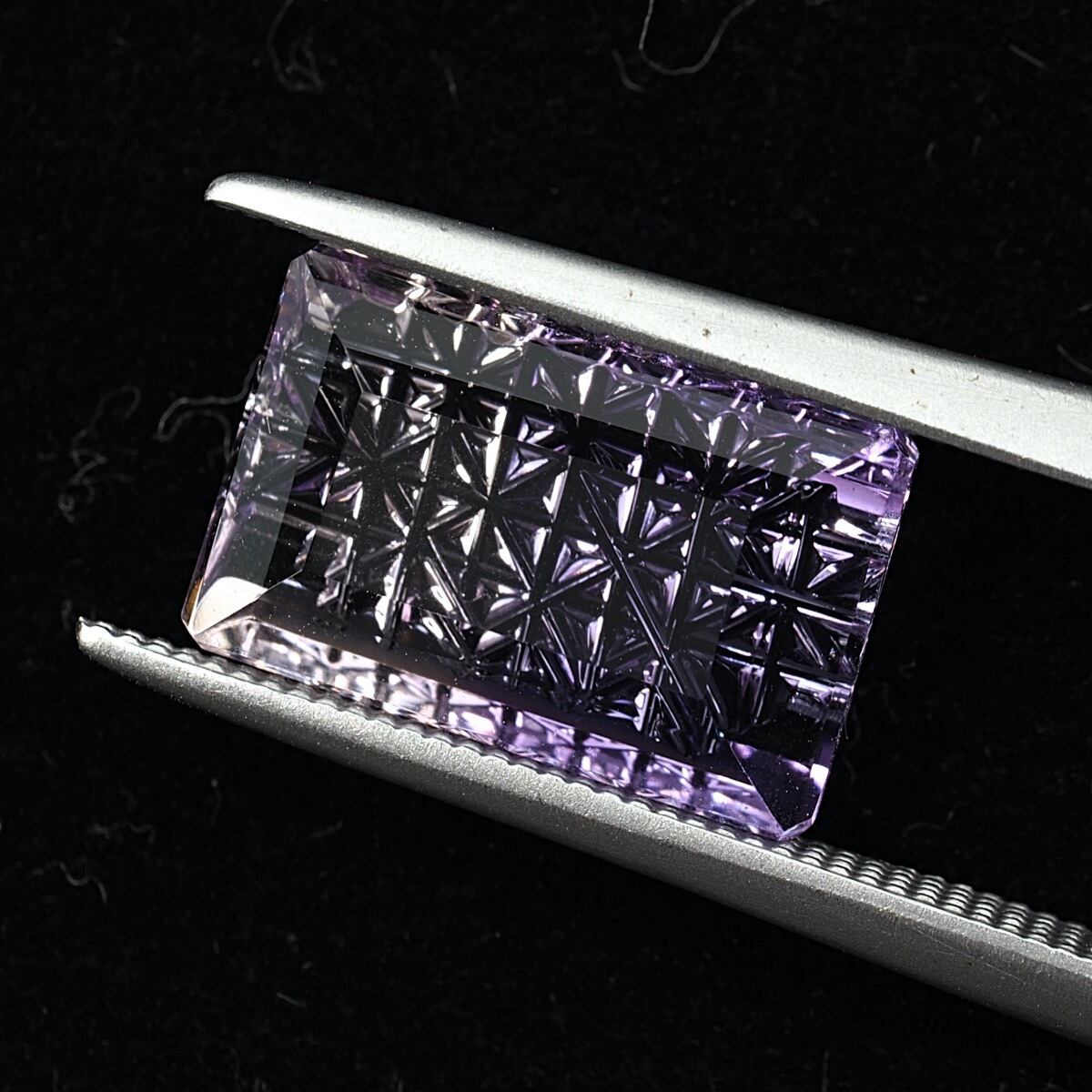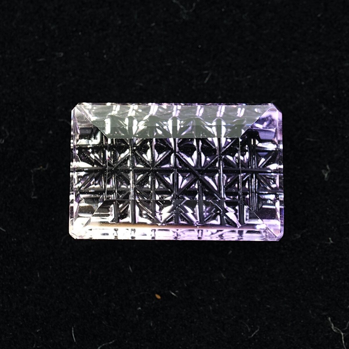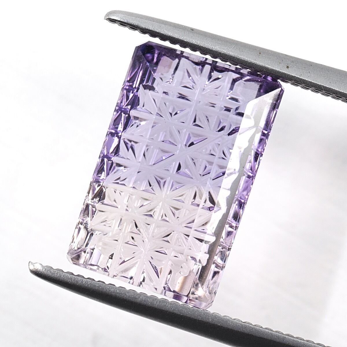 アメジストは微量に含まれた鉄イオンの作用により紫あるいはバイオレットの色合いを示す水晶です。こちらはバイカラーとなる個体で、淡いパープルに水々しいクリアのコントラストが可愛い子です。そしてその上、細かな格子状の甲州切子カットを施した逸品です。