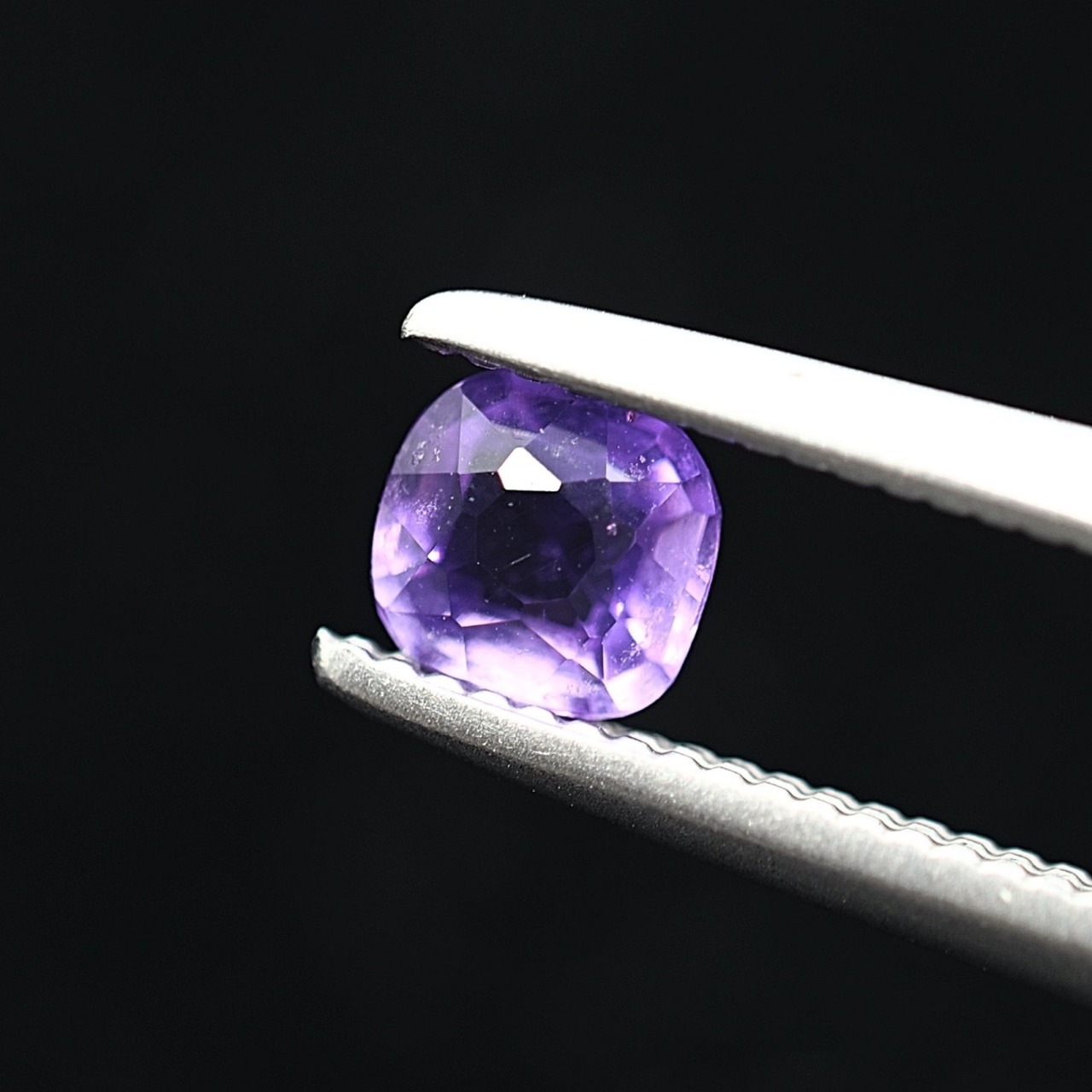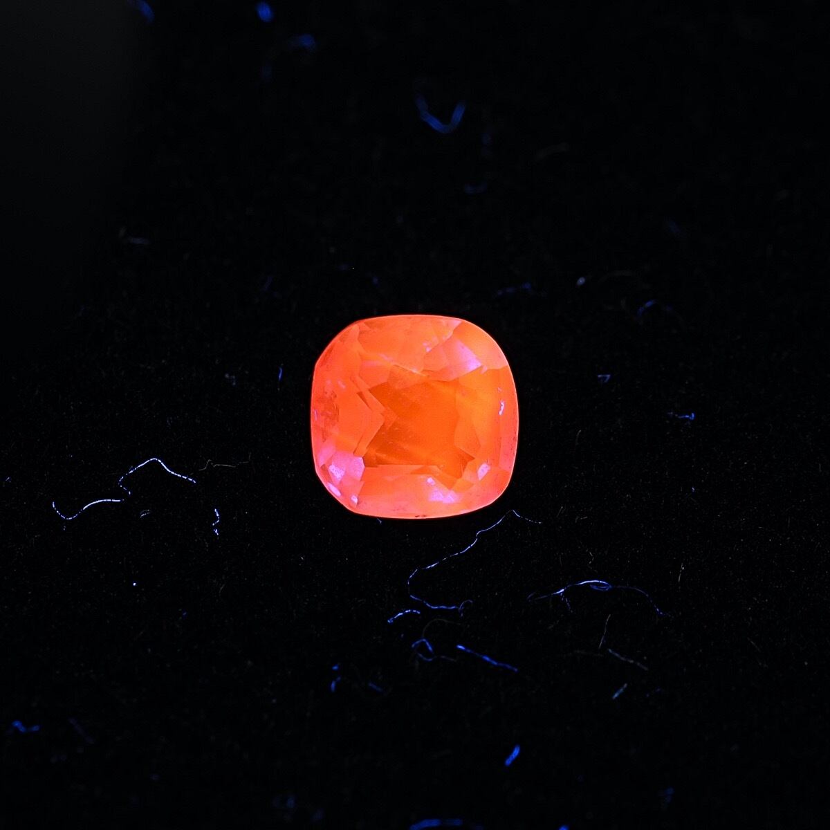 2枚目がUVライト照射です。通常時は藤色、UV蛍光で鮮やかなオレンジピンクに!丸みを帯びた可愛らしいクッションカット。アイクリーン、こちらは蓄光性は無く蛍光個体ですね。