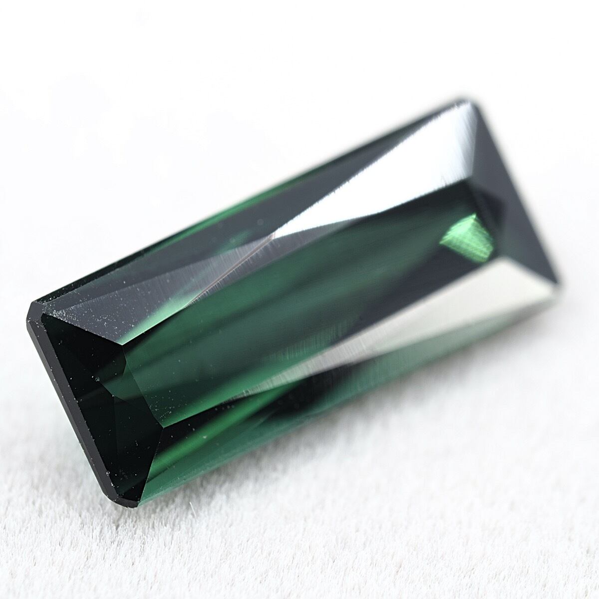 こちらは一見すると暗めのグリーントルマリン、しかし角度によって明るい緑も顔を覗かせ、プリンセスカットにも似た整ったステップカットが美しい一石です。