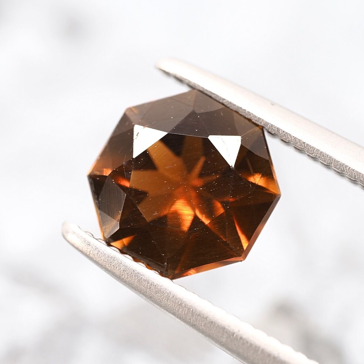 パーガサイトやパルガサイトと呼ばれ、和名ではパーガス閃石もしくはパルガス閃石。一般的ではない希少石の一つで個体数もそう多くはなく、コレクターストーン寄りかもしれませんね。この個体は多角シェイプでカッコよさがあります。カラーは濃厚な蜂蜜のような褐色ですね。