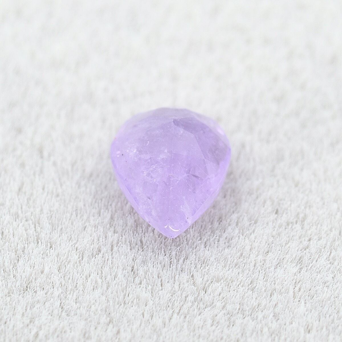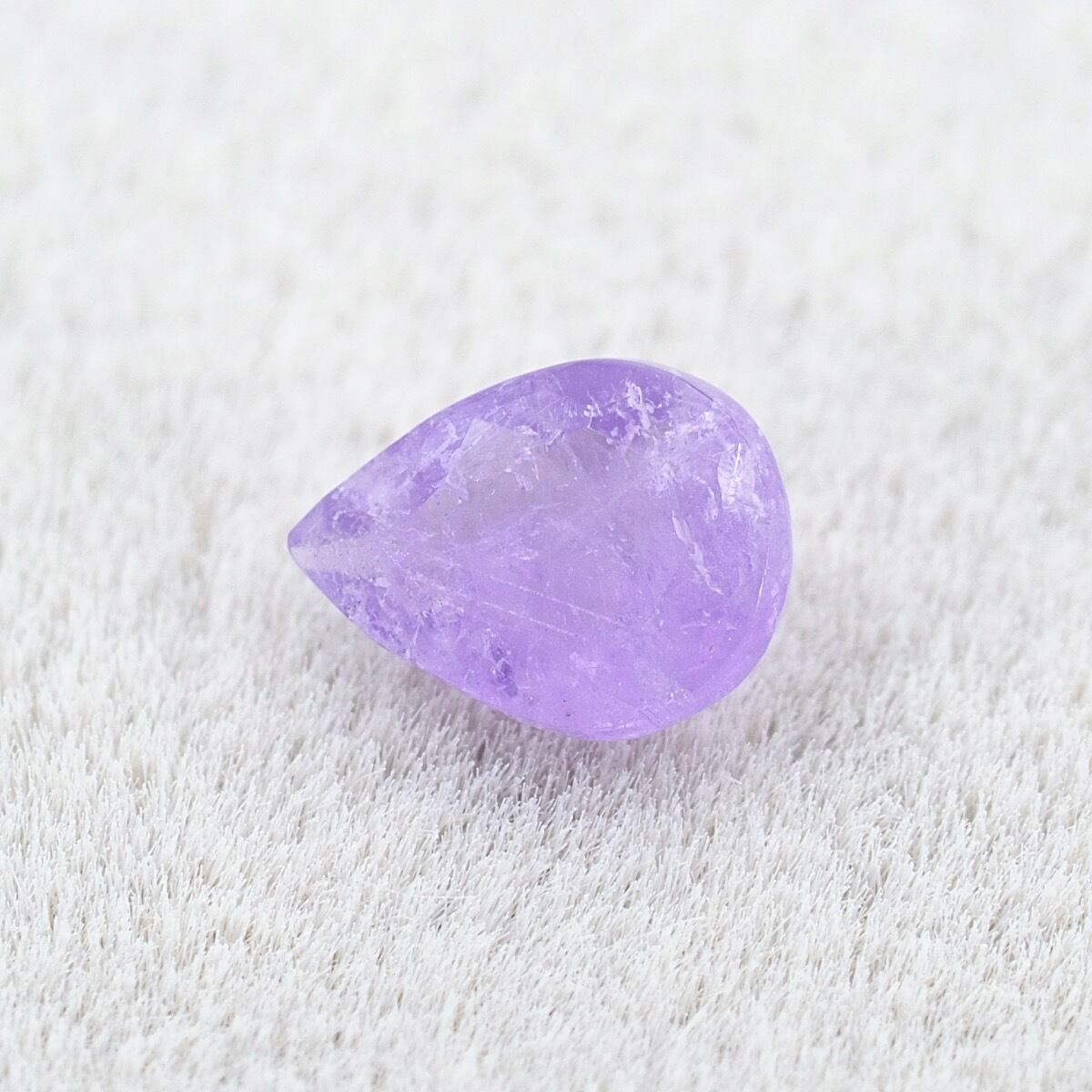 2枚目がUVライト照射です。通常時は淡い藤色、UV蛍光で鮮やかなオレンジピンクに!シェイプがふっくらしたペアシェイプ。少し内包物がある個体なのでリーズナブルにしています。