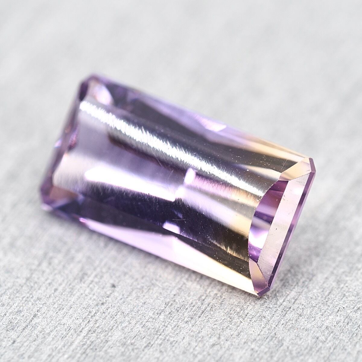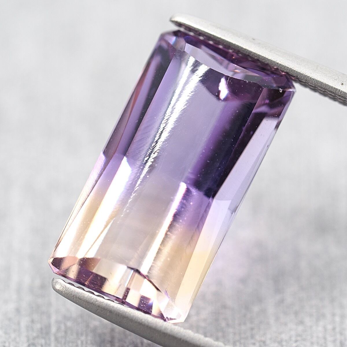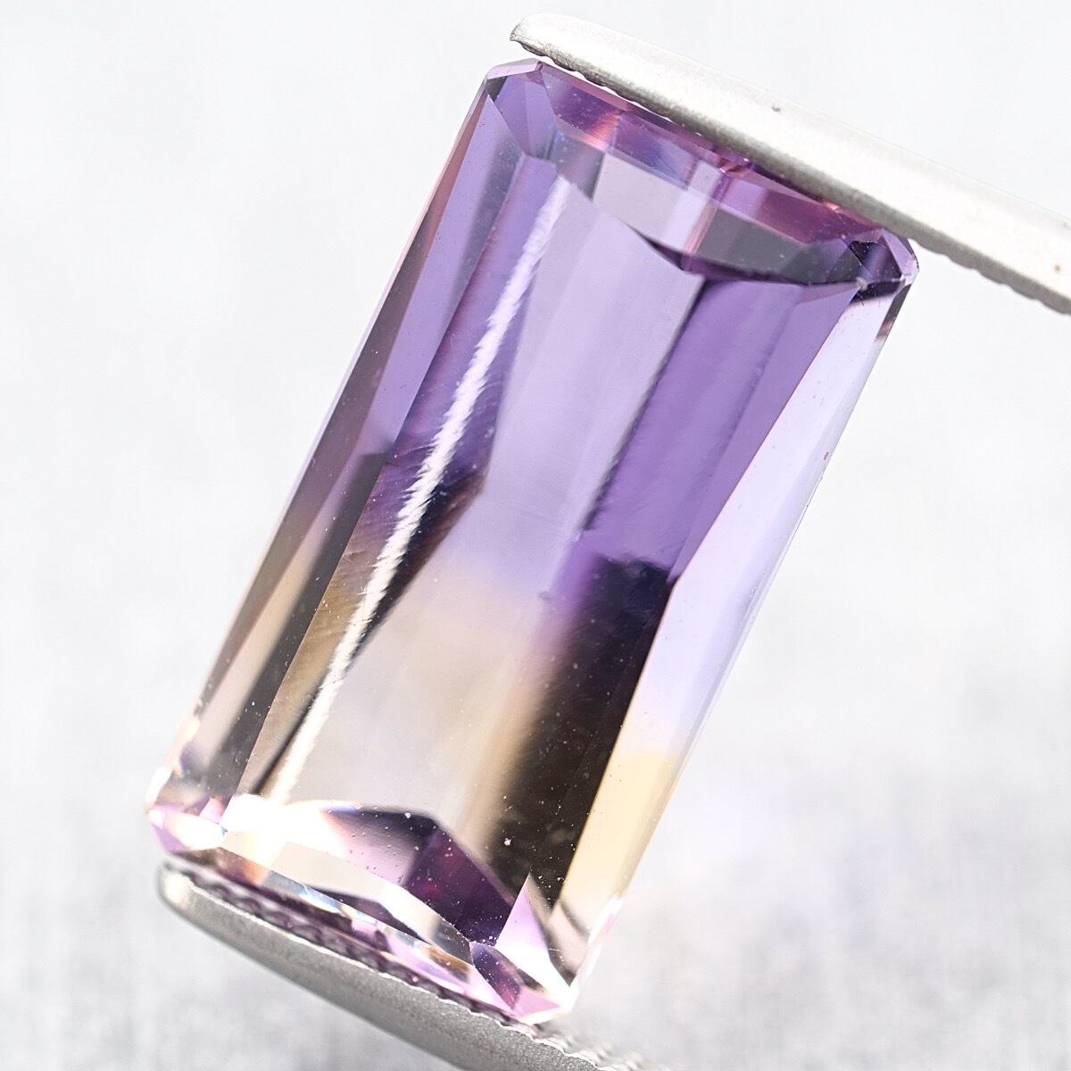 水晶の仲間であり、ひとつの石の中にアメジストの紫色とシトリンの黄色の二色をもっていることで、その名が付けられたのがアメトリン。非常に色の入り方や出方がとても可愛らしいストーンですよね。ct数以上に大きく感じて存在感がありますね、バフトップでさらに表面がつるんとした風合いに。