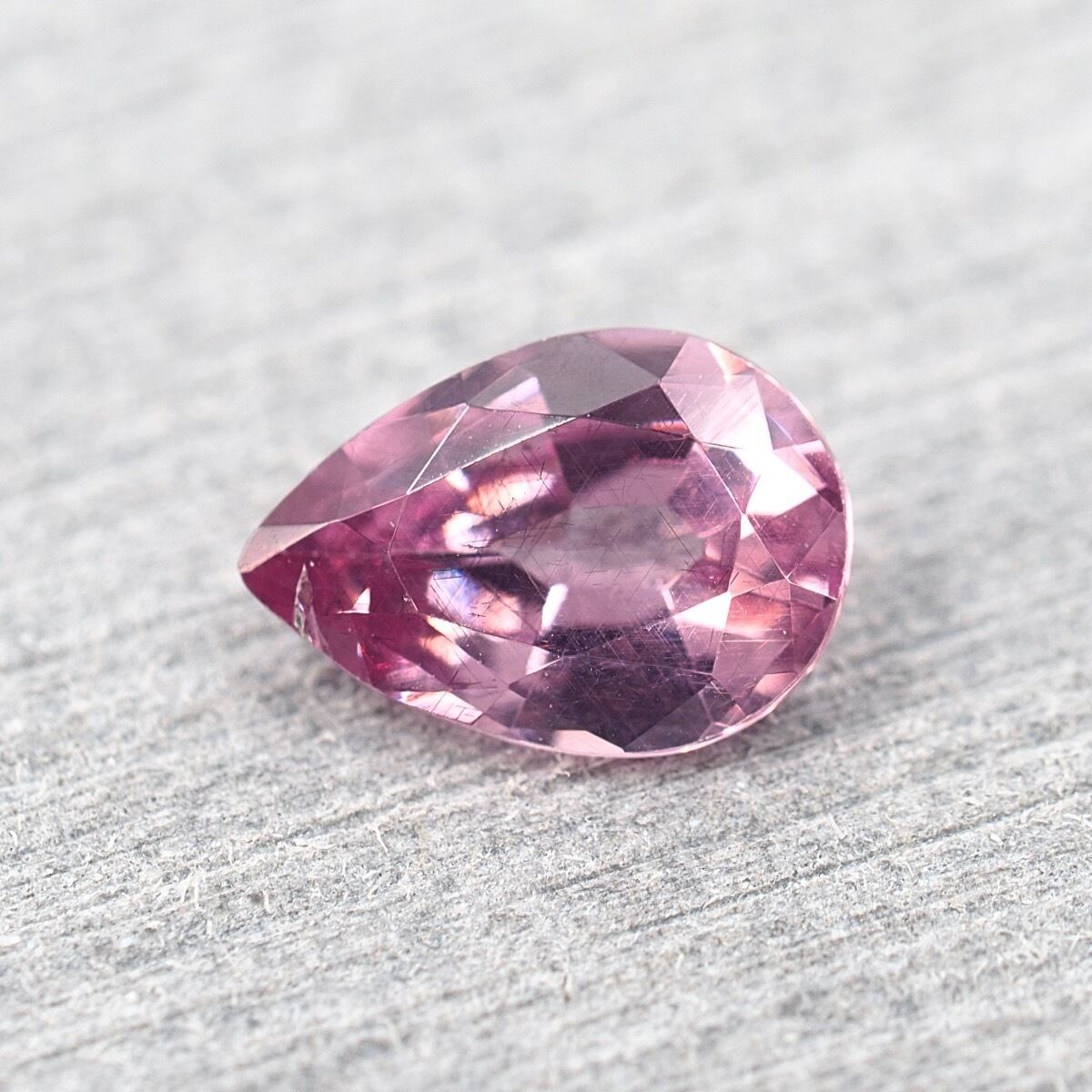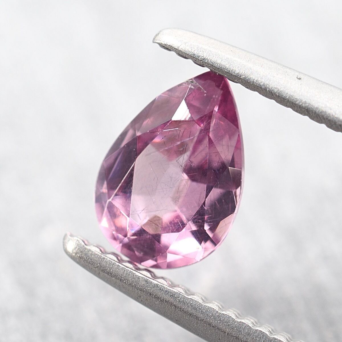 淡いレッドピンクでカクテルのような可愛らしいカラーです。ルーペで覗くとすごく細かい針状インクルージョンが無数に見られます。