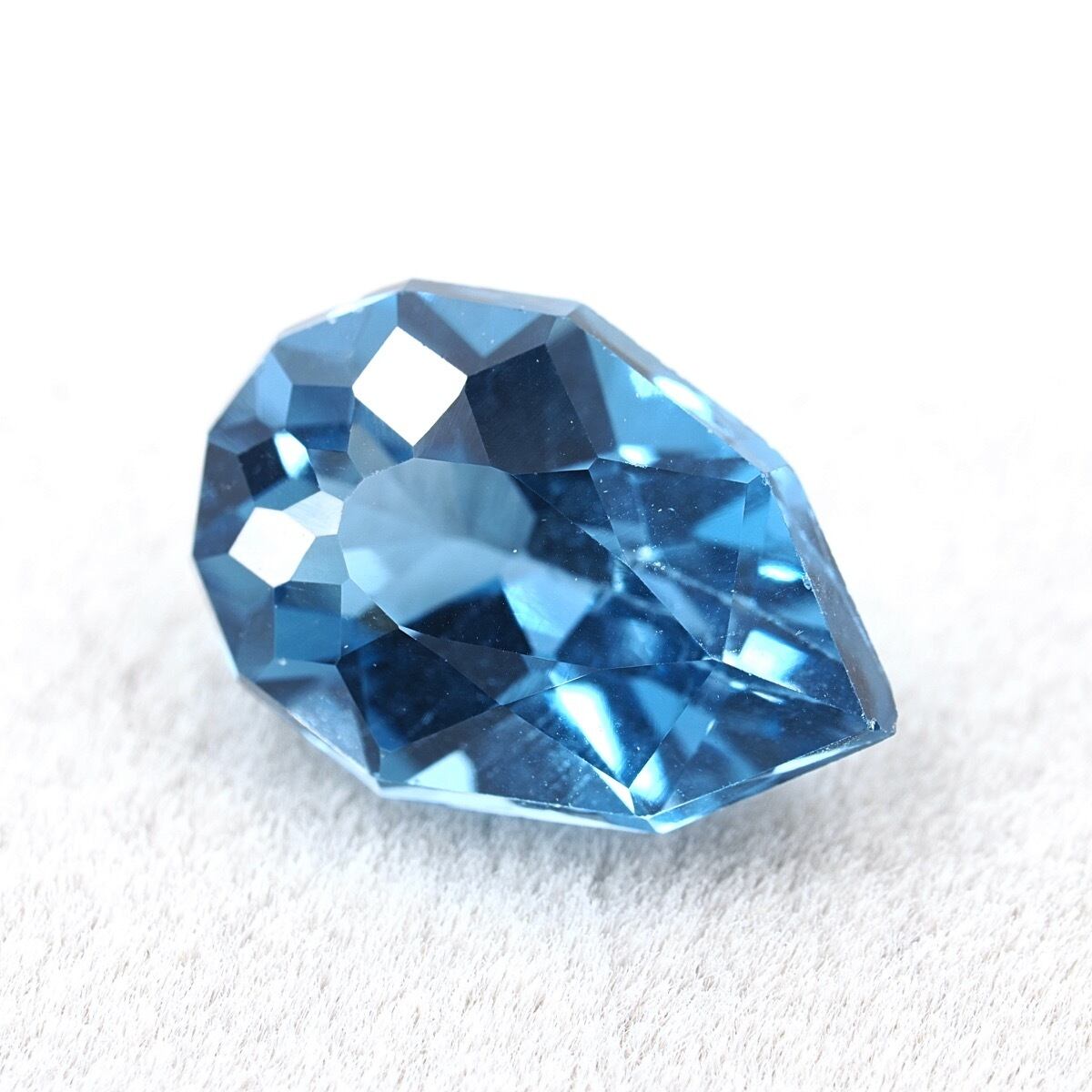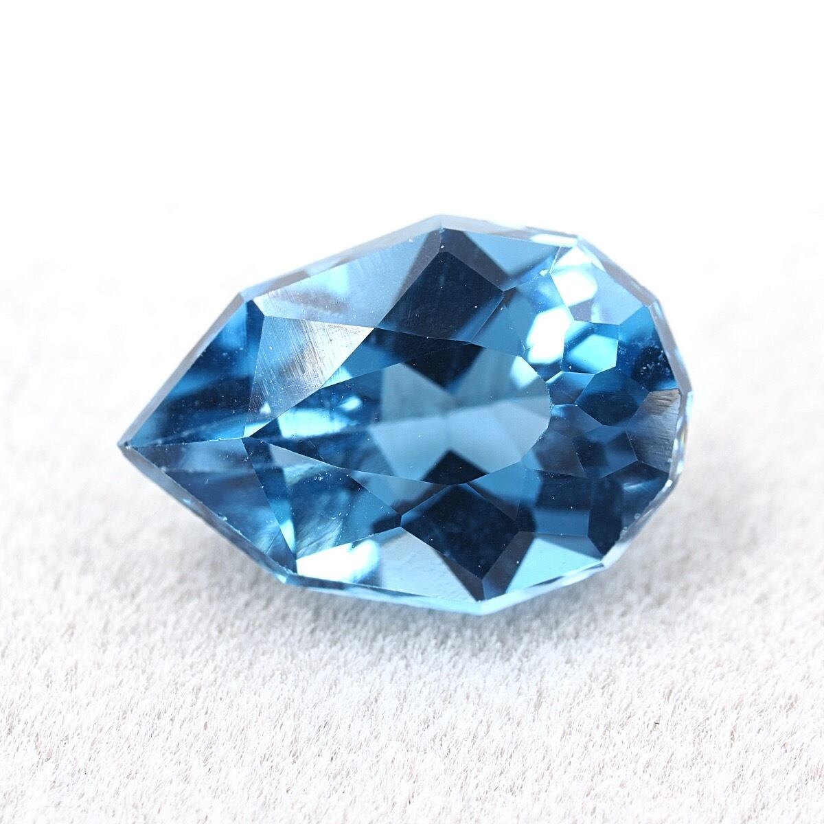 色良し、テリ良し、カット良しのロンドンブルートパーズです。深い海に太陽光が届いて煌めくような、そんな気品溢れる美しさを放っています。この個体は少し明るめの鮮やかなブルーですね。そしてこの十角形のエッジを効かすカッティング、大き過ぎず小さ過ぎずの程よいサイズ感です。