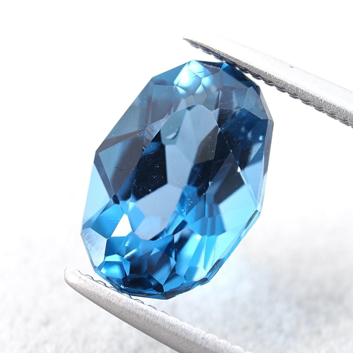 色良し、テリ良し、カット良しのロンドンブルートパーズです。深い海に太陽光が届いて煌めくような、そんな気品溢れる美しさを放っています。少し明るめの鮮やかなブルー、一見すると通常のオーバルと思わしきカットですがインパクトのあるドデカゴンが洒落てます。